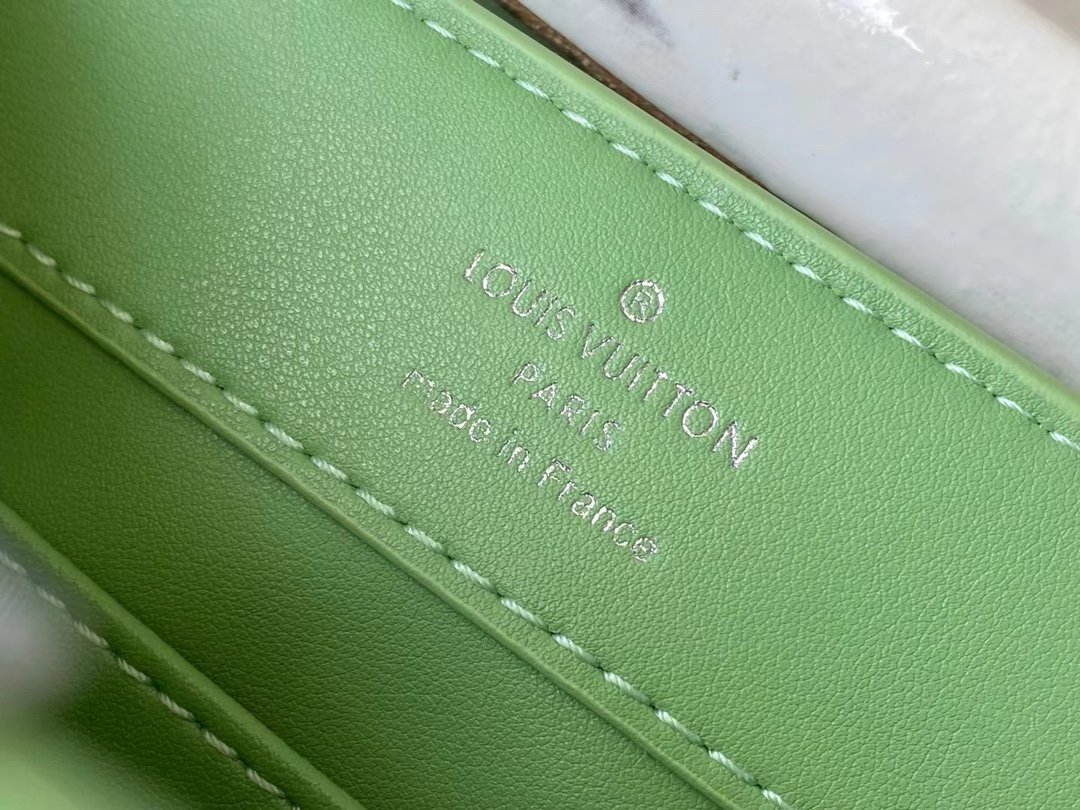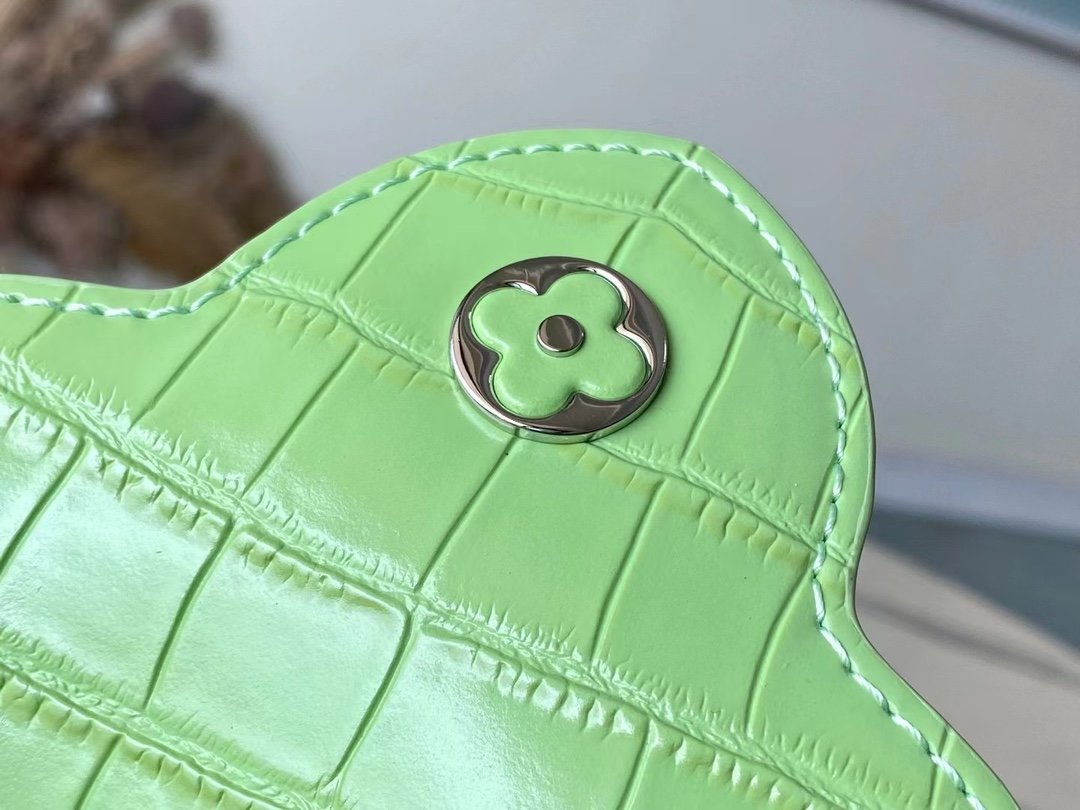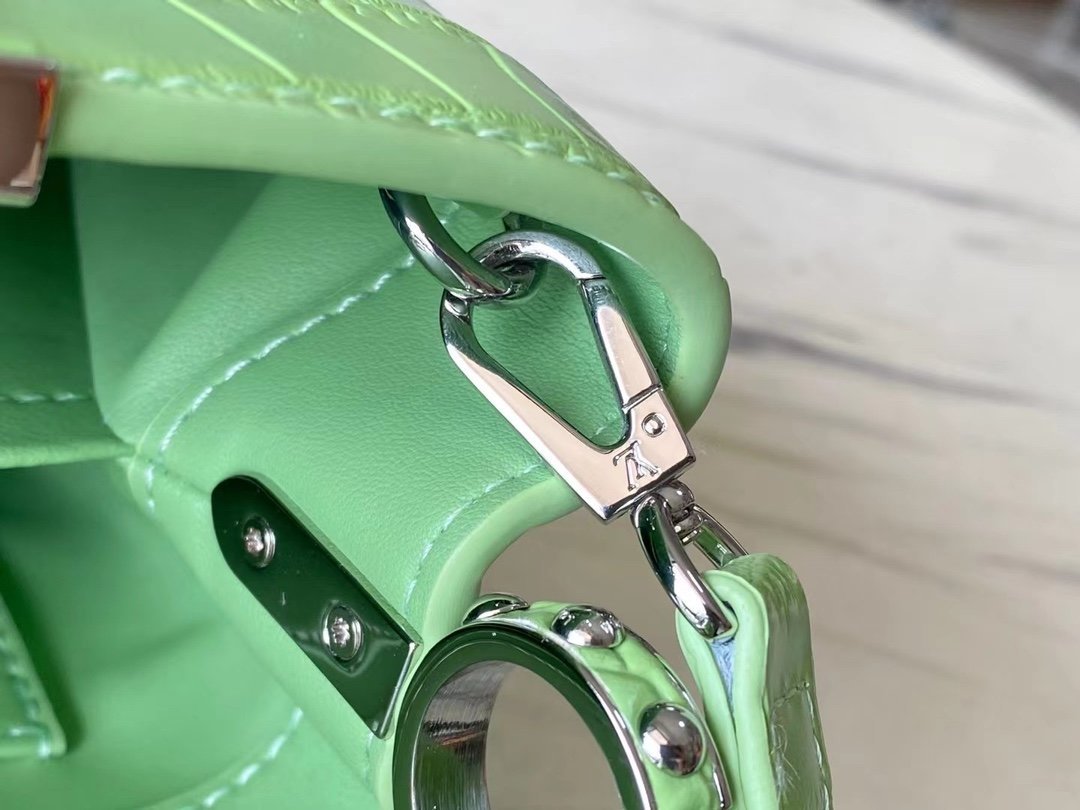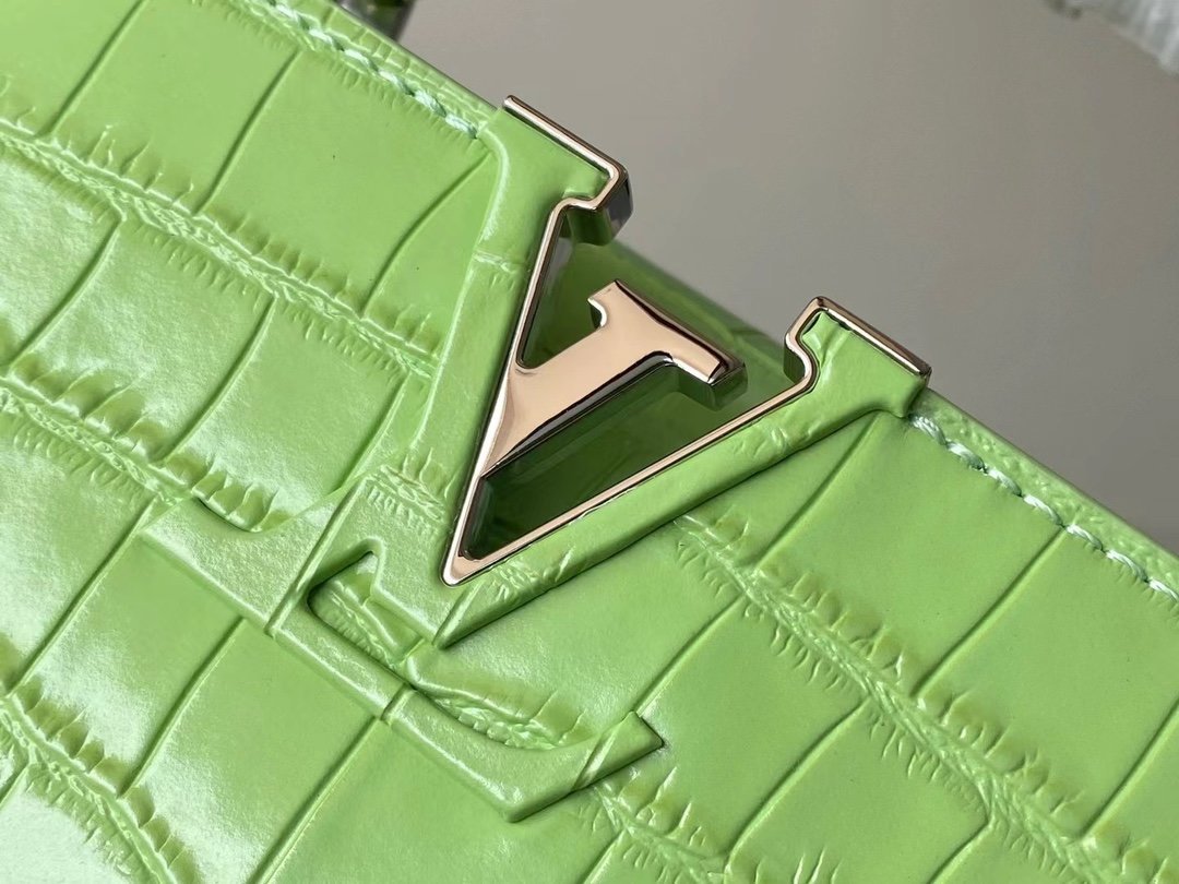 Special original order M48865 green crocodile pattern silver buckle. This precious Capucines mini handbag is made of crocodile leather pattern and has been treated with high gloss. It shines with charming and luxurious goatskin lining and sparkling metal accessories. The unique Capucines cover can be stored in the bag to display the letter logo and Can be folded out to display the Monogram Flower pattern. Compact size. Ideal accessory for night outing. Size: 21*14* 8cm