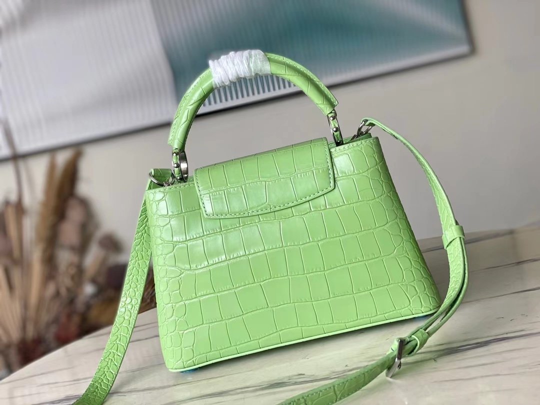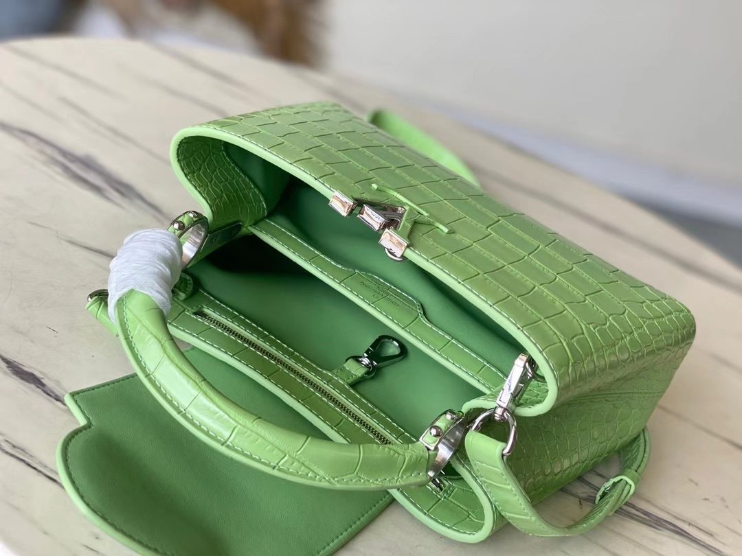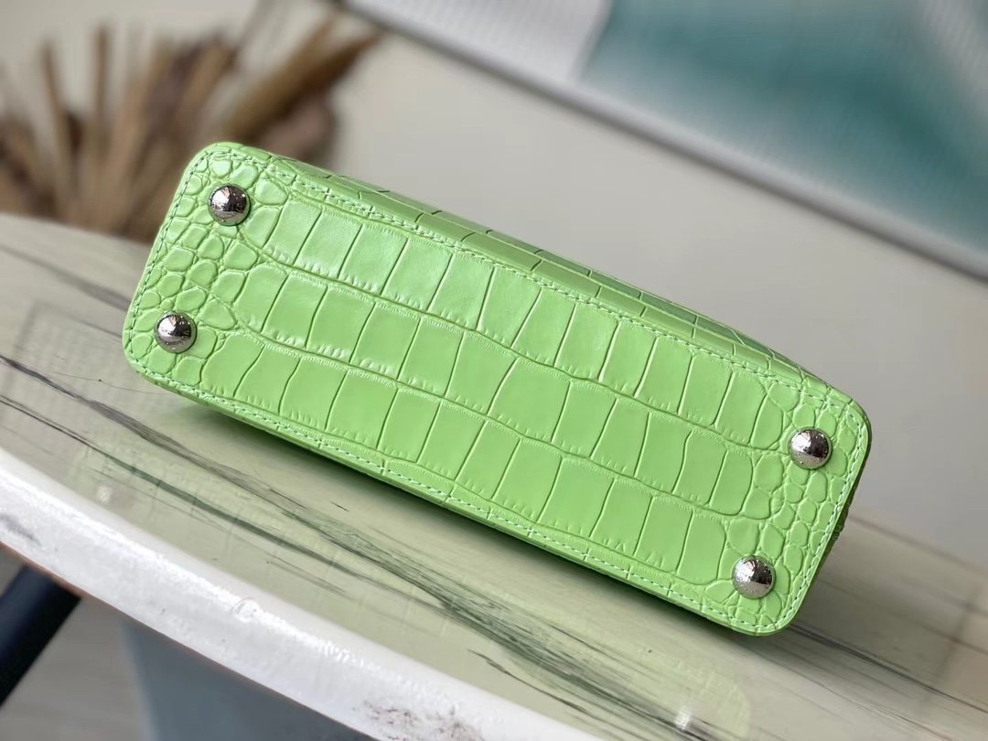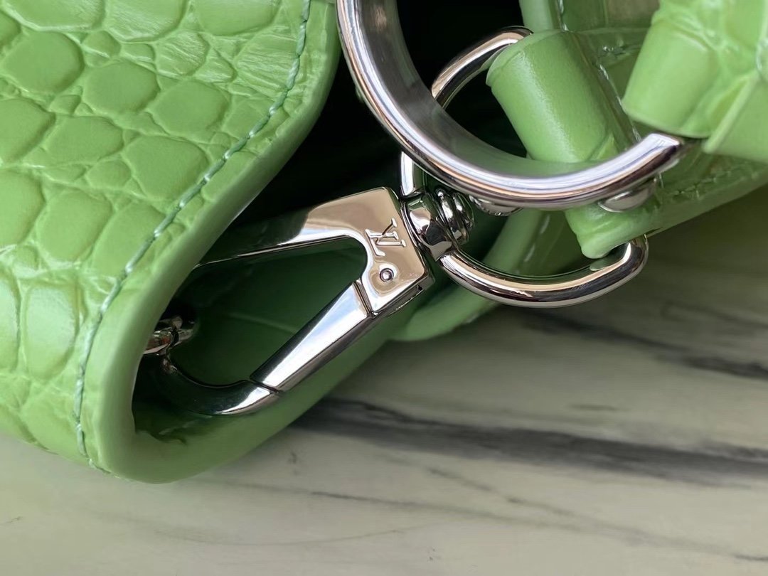 Special original order M48865 green crocodile pattern silver buckle. This precious Capucines size BB handbag is made of crocodile leather pattern and high-gloss treatment. It shines with charming and luxurious goatskin lining and sparkling metal accessories. The unique Capucines cover can be stored in the bag to display the letter logo. It can also be folded out to show the Monogram Flower pattern. Ideal accessory for night outing. Size: 27*18*9 cm