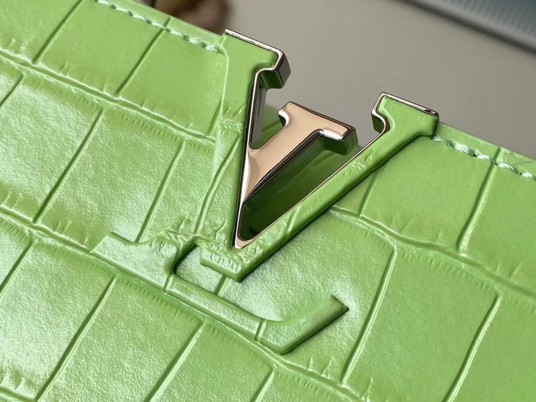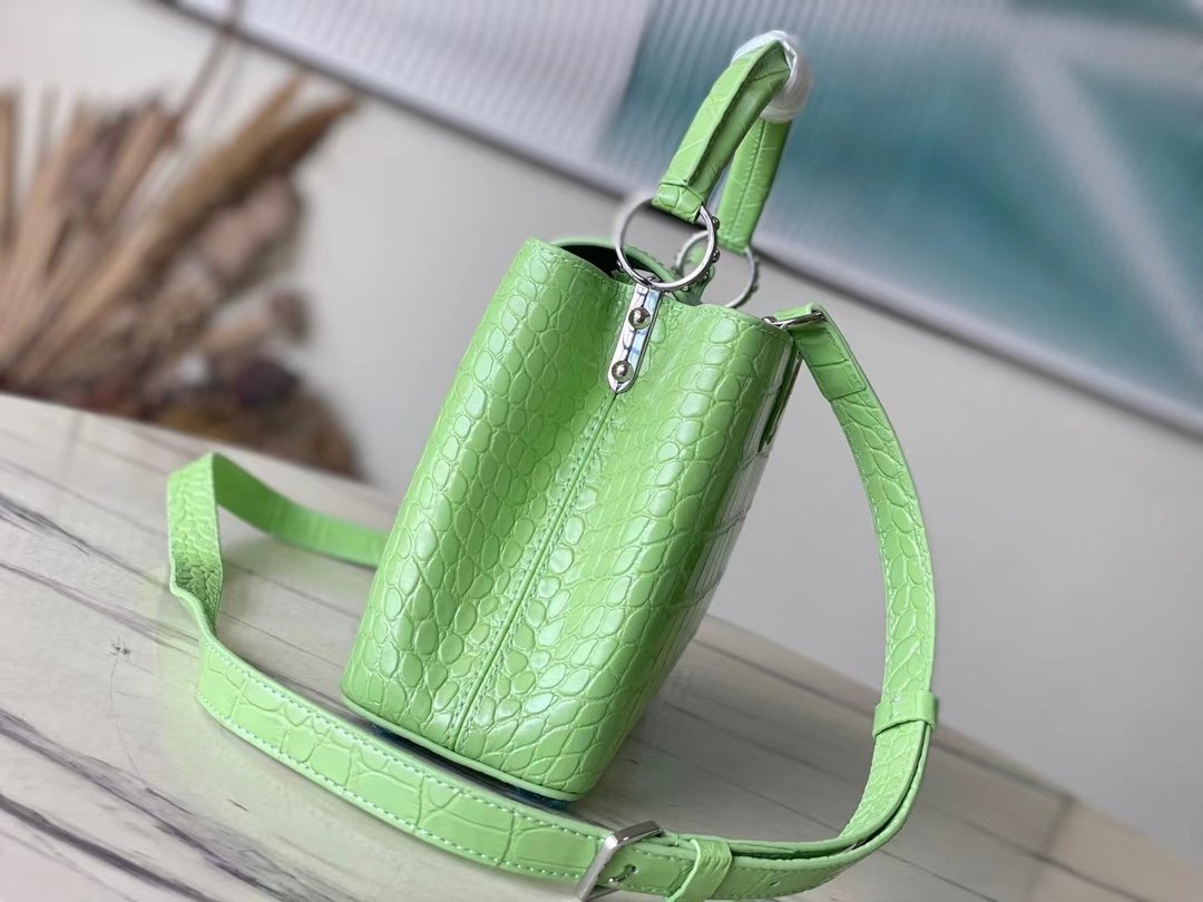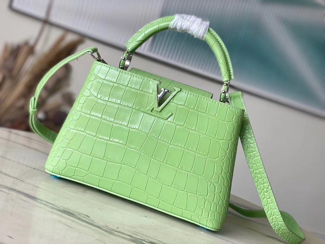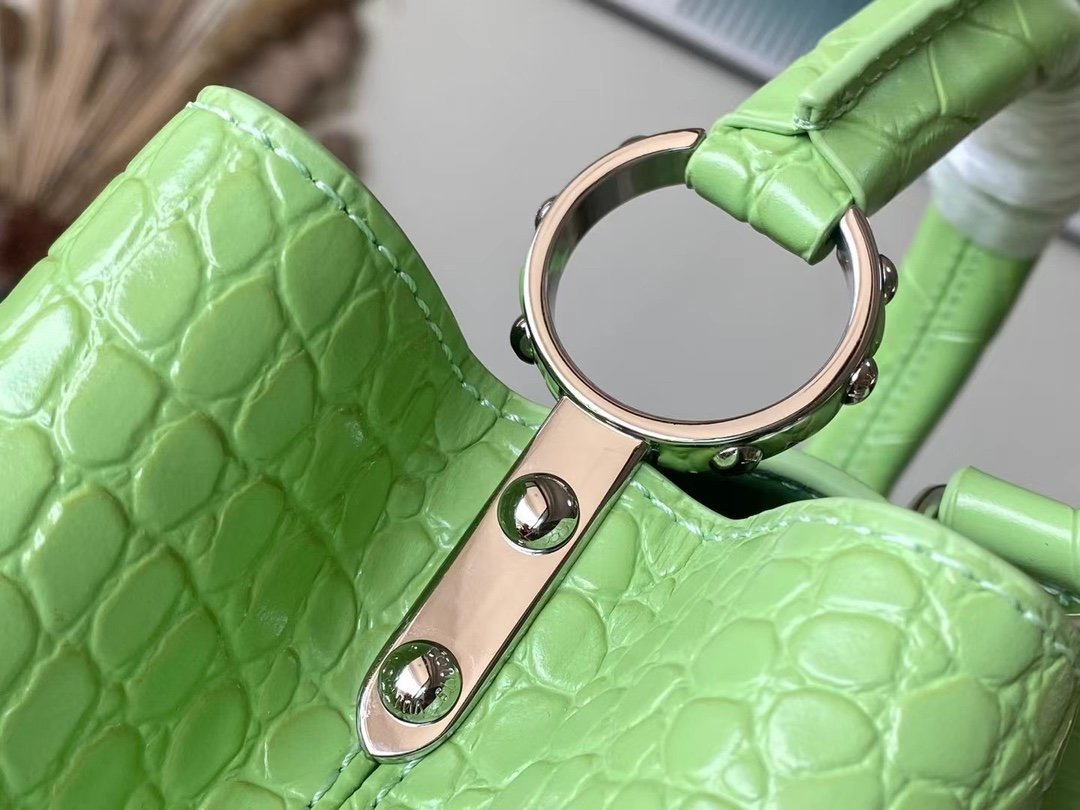 Special original order M48865 green crocodile pattern silver buckle. This precious Capucines size BB handbag is made of crocodile leather pattern and high-gloss treatment. It shines with charming and luxurious goatskin lining and sparkling metal accessories. The unique Capucines cover can be stored in the bag to display the letter logo. It can also be folded out to show the Monogram Flower pattern. Ideal accessory for night outing. Size: 27*18*9 cm