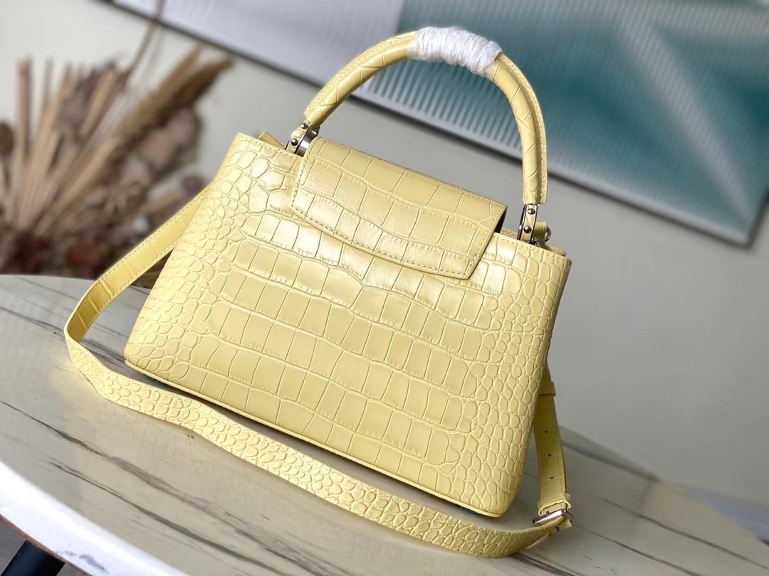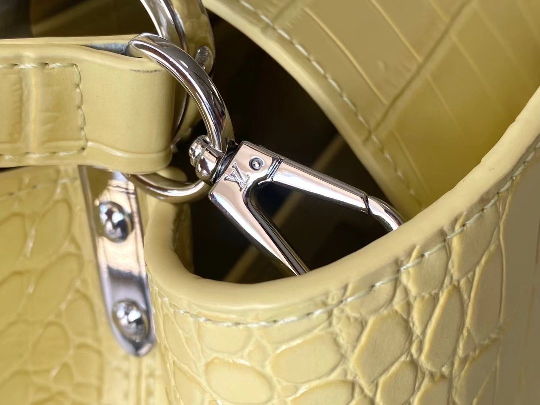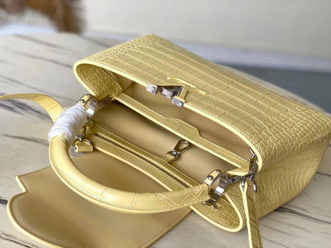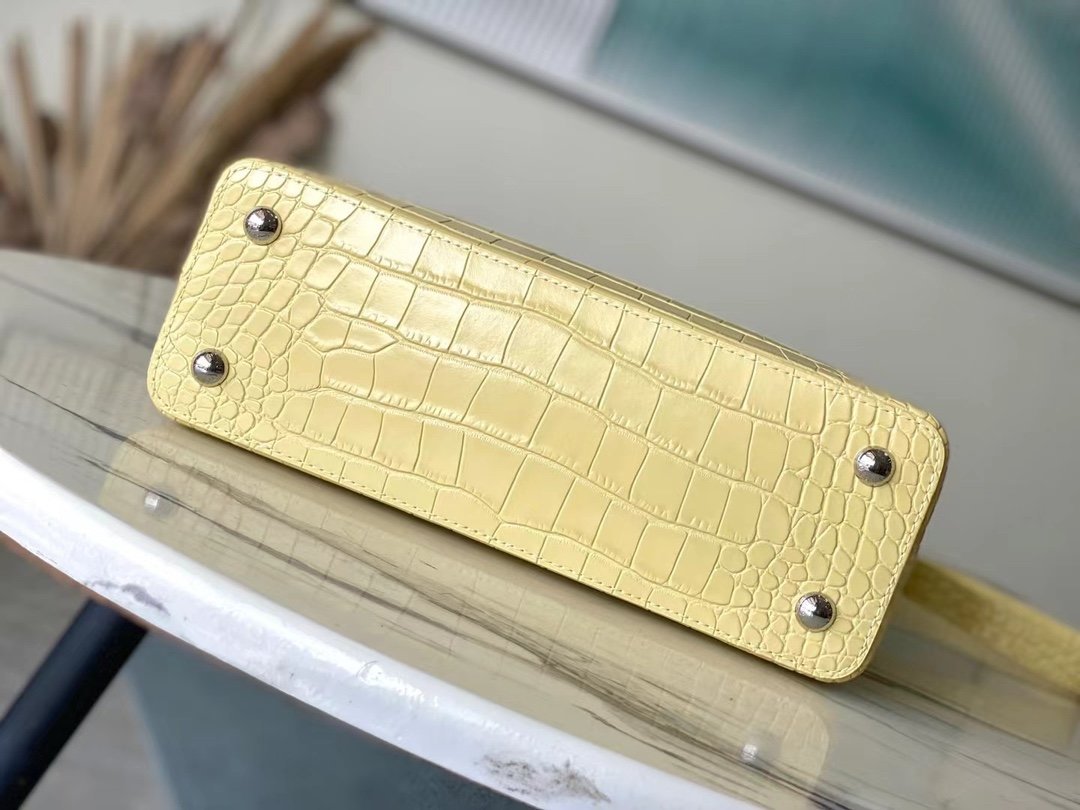 Special original order M48865 Yellow crocodile pattern silver buckle This precious Capucines medium-sized handbag is made of crocodile leather pattern and is highly polished. It shines with charming and luxurious goatskin lining and sparkling metal accessories. The unique Capucines cover can be stored in the bag for display. The letter logo can be turned outwards to reveal the Monogram Flower pattern. An ideal accessory for a night out. Size: 31.5*20*11 cm