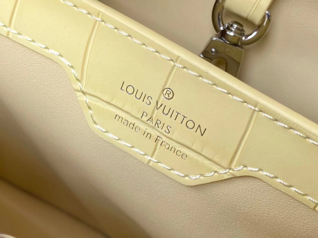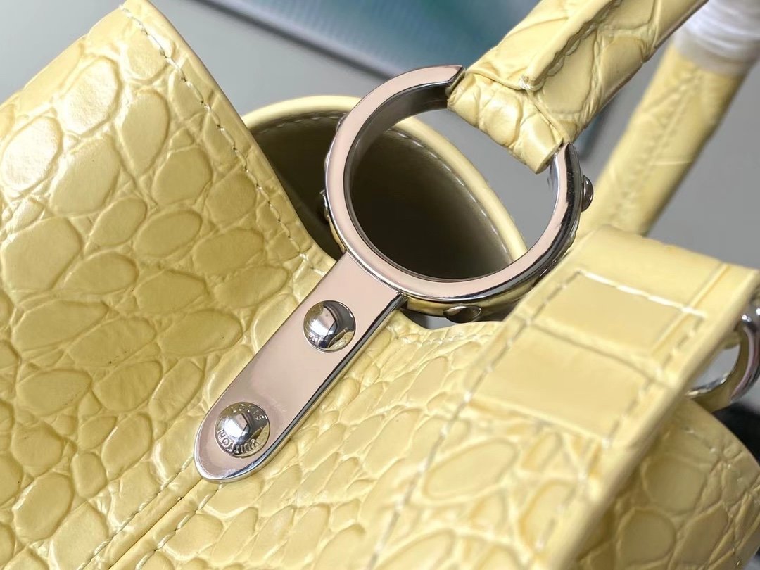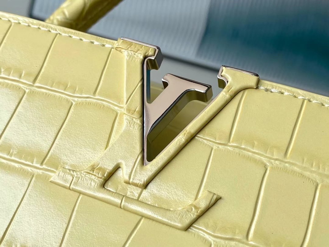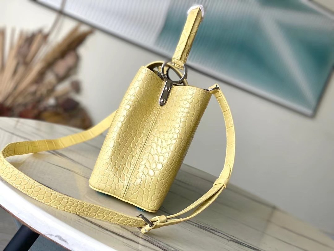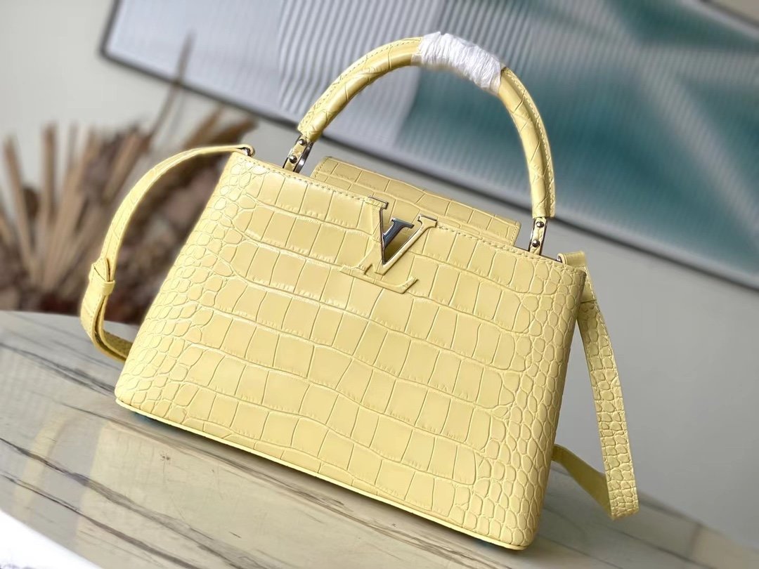 Special original order M48865 Yellow crocodile pattern silver buckle This precious Capucines medium-sized handbag is made of crocodile leather pattern and is highly polished. It shines with charming and luxurious goatskin lining and sparkling metal accessories. The unique Capucines cover can be stored in the bag for display. The letter logo can be turned outwards to reveal the Monogram Flower pattern. An ideal accessory for a night out. Size: 31.5*20*11 cm