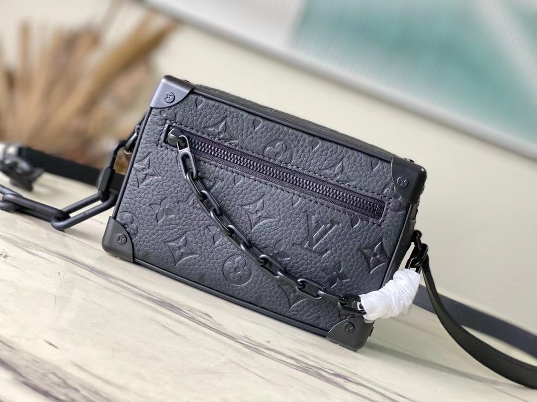 Top original order M55702 black pebbled MINI SOFT TRUNK handbag with iconic Monogram print and contrasting resin chain strap, full leather embossed colorful chain, small box with exquisite shape. This attractive handbag has sharp edges and elegant connotation, showing a modern interpretation of the tradition of box making. The resin chain strap provides a variety of carrying options, either on the shoulder or in the hand. size 18.5x13x8cm