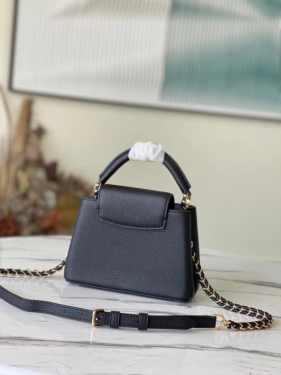 Top original order M59709 Black M48865 This Capucines mini handbag is made of bright Taurillon leather, intertwined with leather and chains, showing off its craftsmanship. The chain can be removed or adjusted for shoulder or cross-body wear. The flap is folded in to reveal the semi-leather-covered letters. Dimensions: 21 x 14 x 8 cm