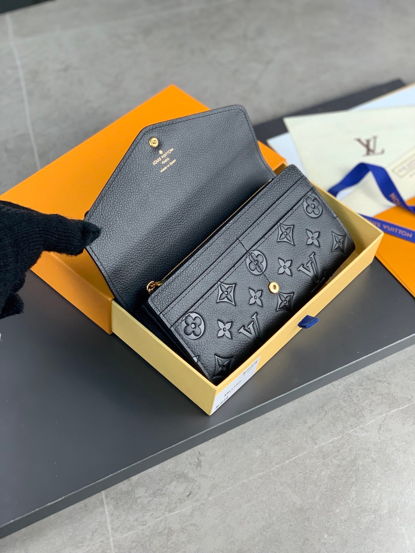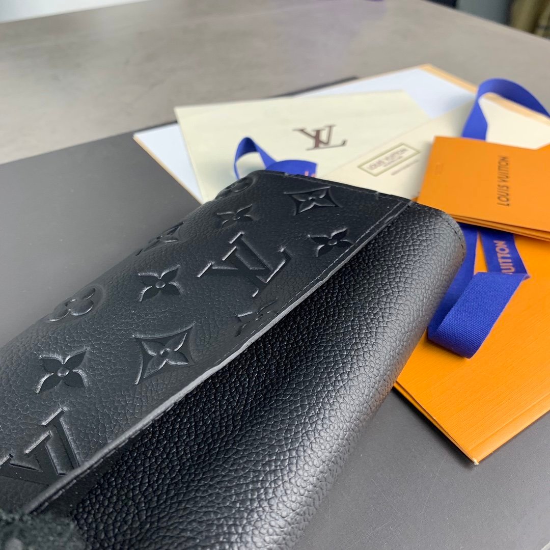 M61182 black! This envelope-style Sarah wallet features a carefully embossed Monogram Empreinte leather exterior and a cleverly designed interior with numerous pockets and credit card slots.