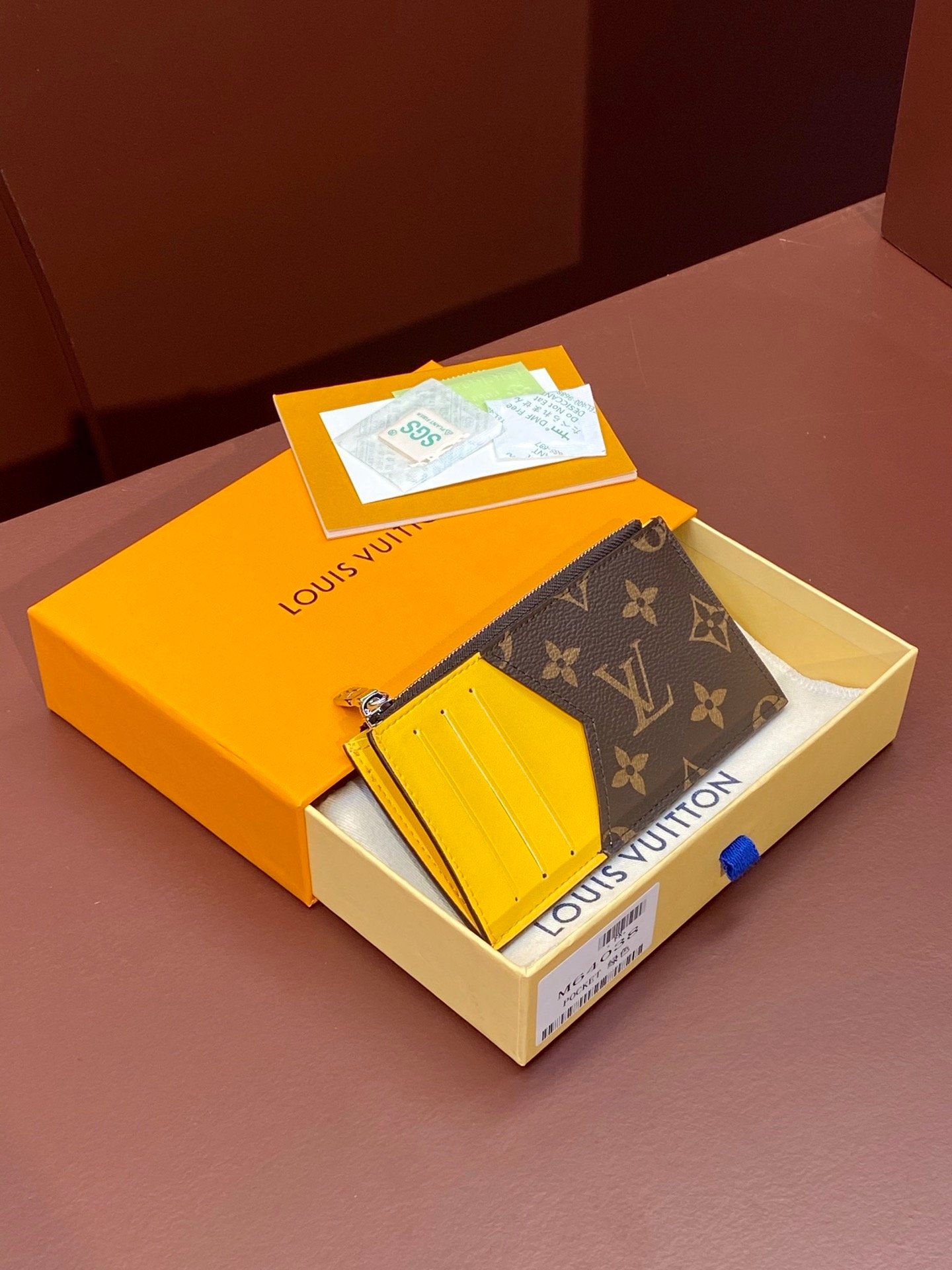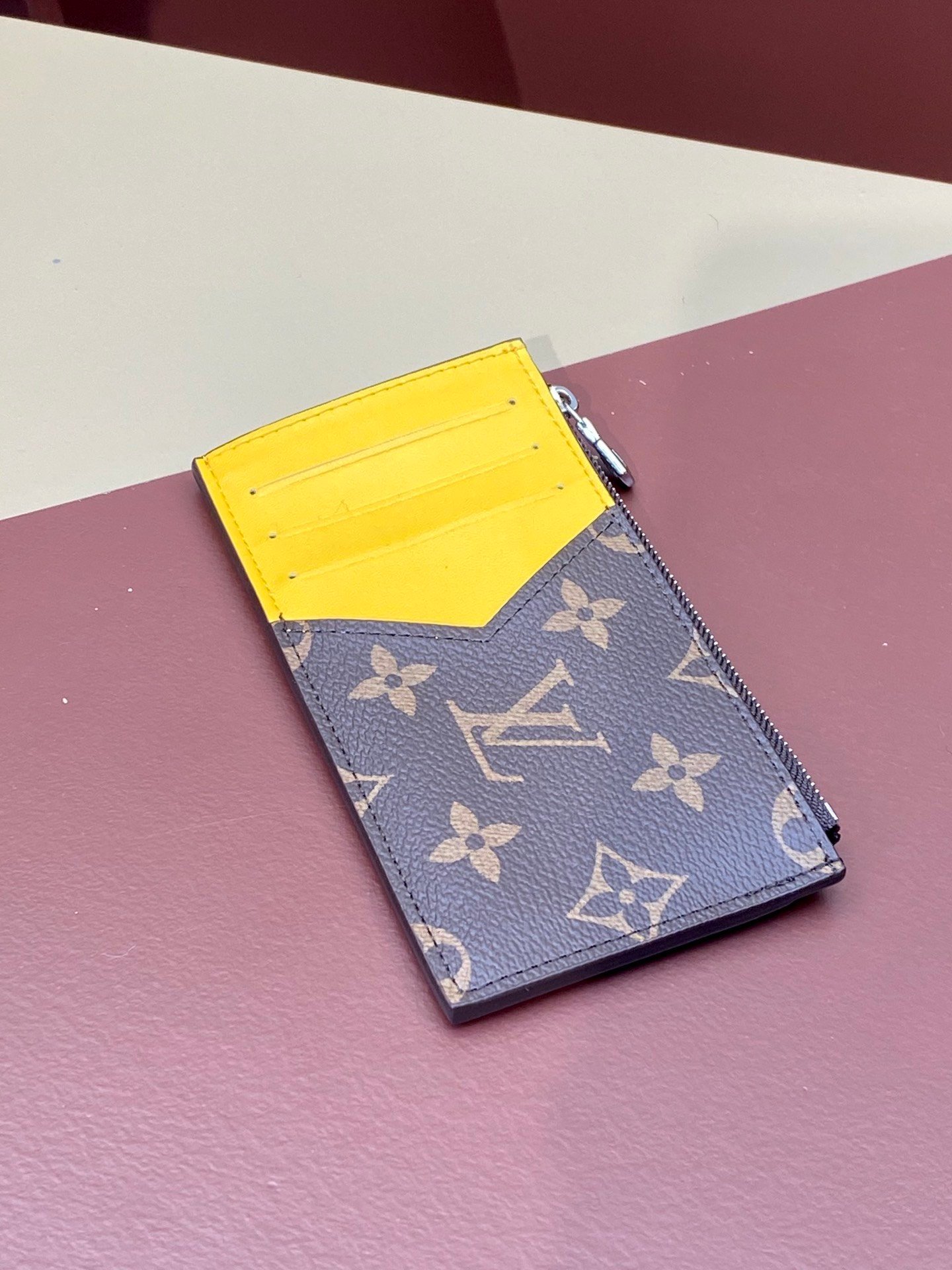 M64038 yellow! COIN CARD HOLDER The Coin Card Holder is made of Louis Vuitton’s signature Taiga leather. It has a slim appearance and is ideal for safely storing coins and bills. There are multiple credit card slots and bill compartments inside, as well as a silver zippered coin pocket.
