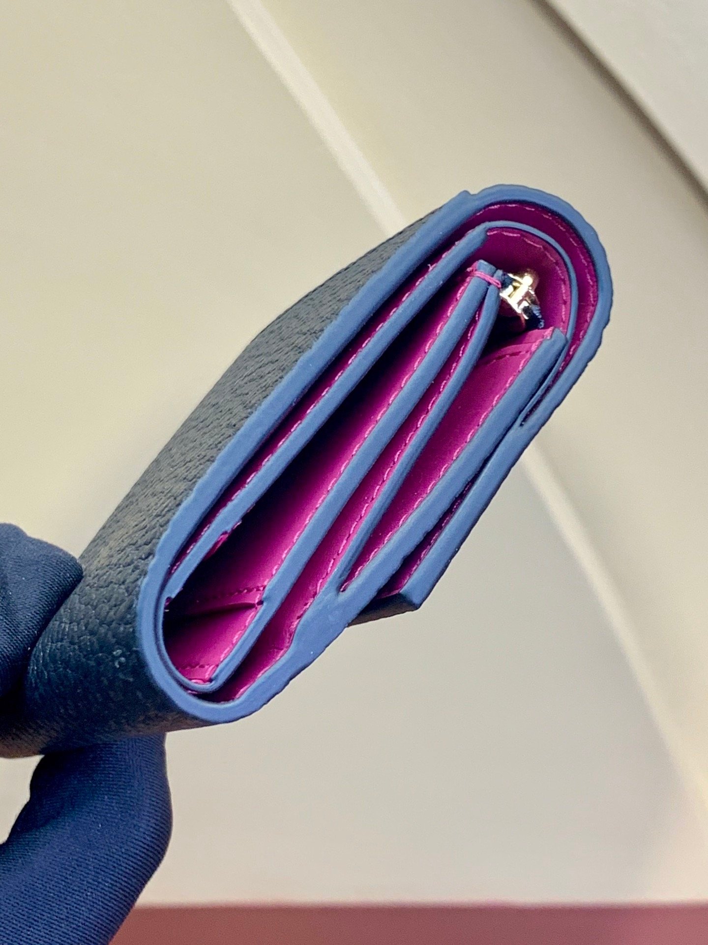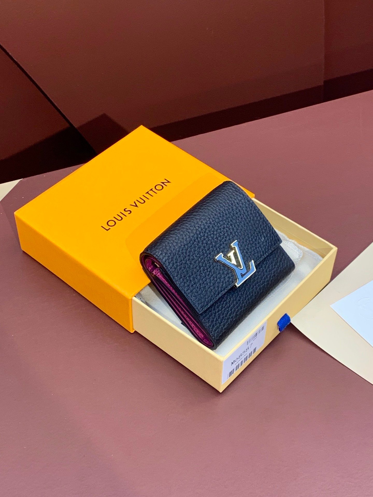 M68587 Black This Capucines XS wallet can be placed in all Capucines handbags, even the small BB style can be easily stored. Crafted from full-grain Taurillon leather and lined with smooth calfskin, this ultra-compact wallet holds a woman’s daily essentials such as bills, change, credit cards and receipts, and features a snap closure with classic leather accents. LV logo on face.