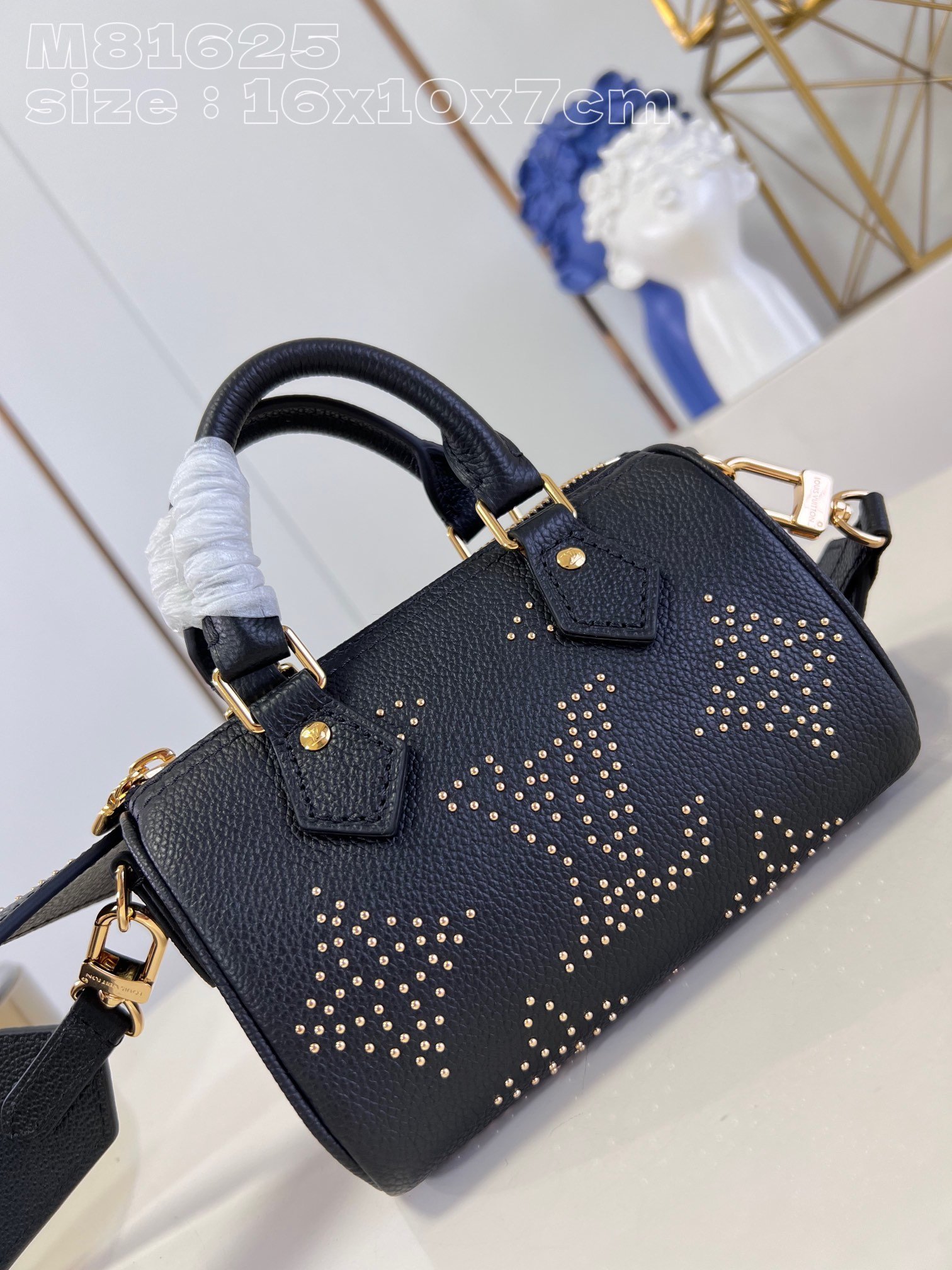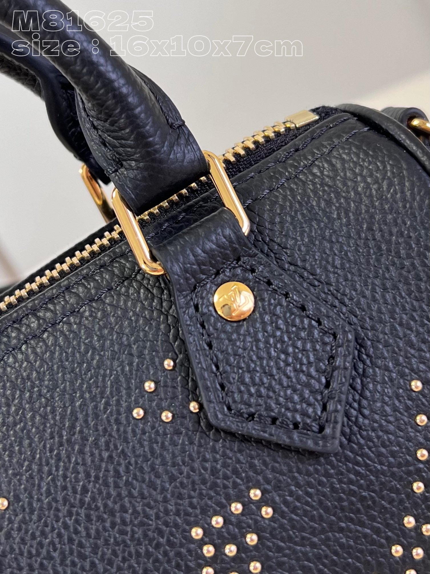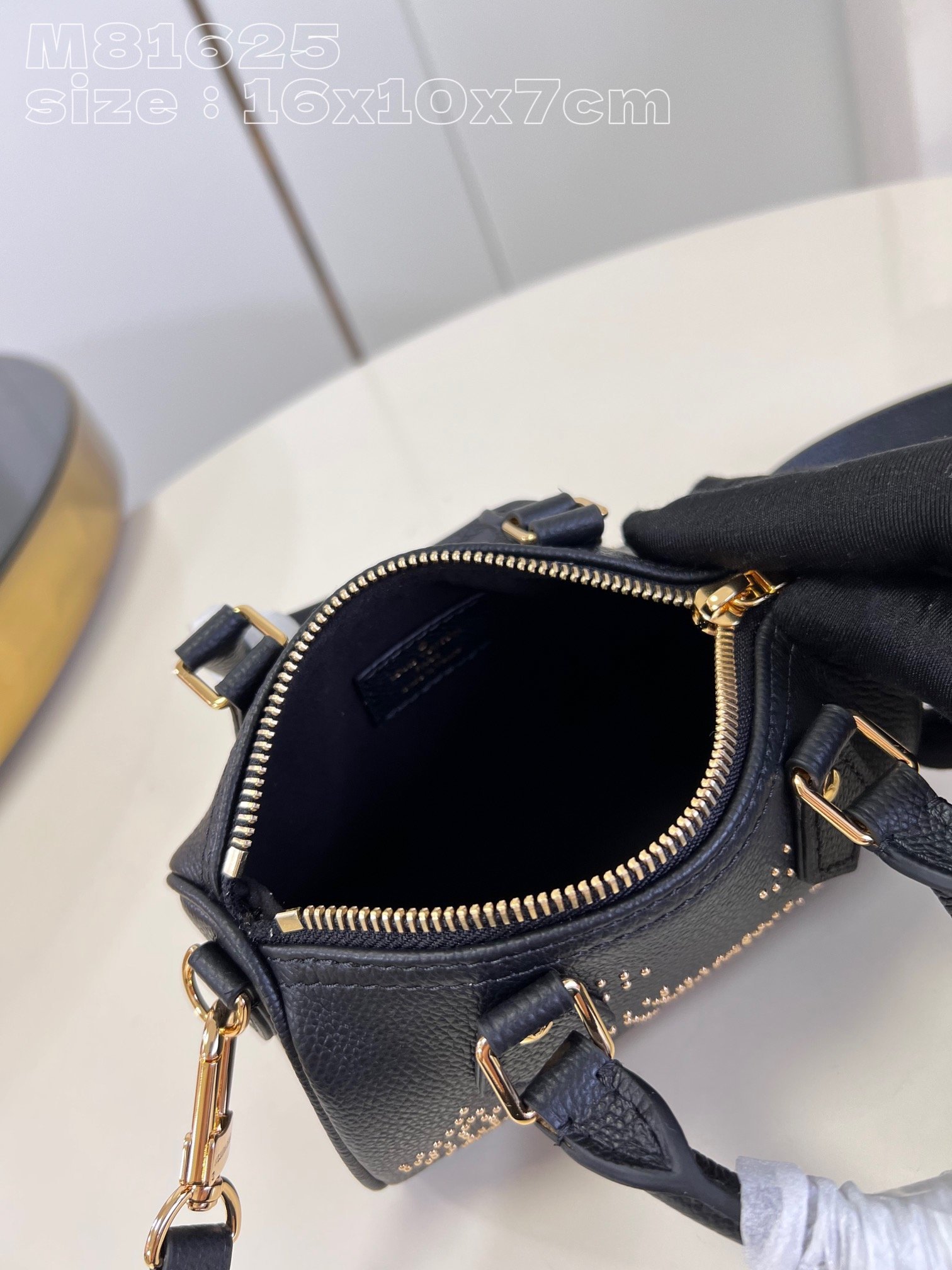 [Exclusive real shot of M81625 black studded] This Nano Speedy handbag is made of grained cow leather, with Monogram flowers constructed of dazzling studs, releasing a gorgeous style. A rolled leather top handle completes the petite silhouette, while the detachable shoulder strap is also studded with Monogram flower clusters. Zippers keep essentials secure. 16 x 10 x 7.5 cm (length x height x width)