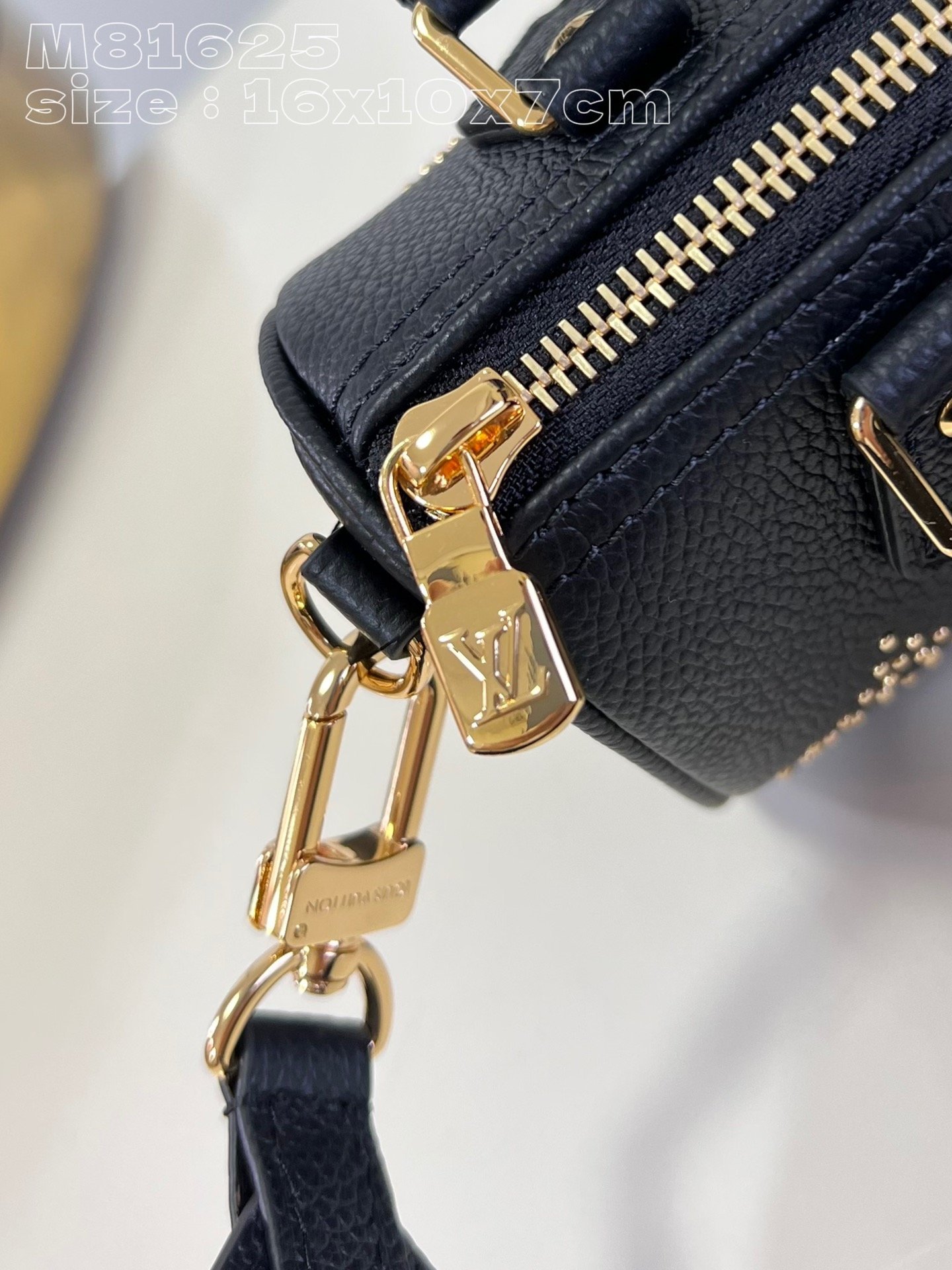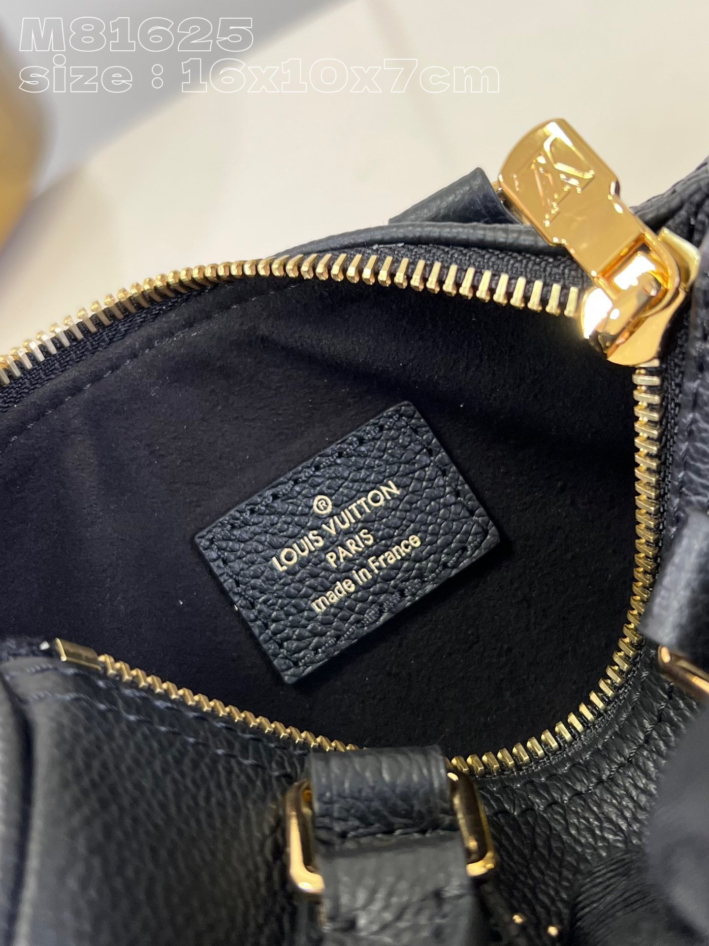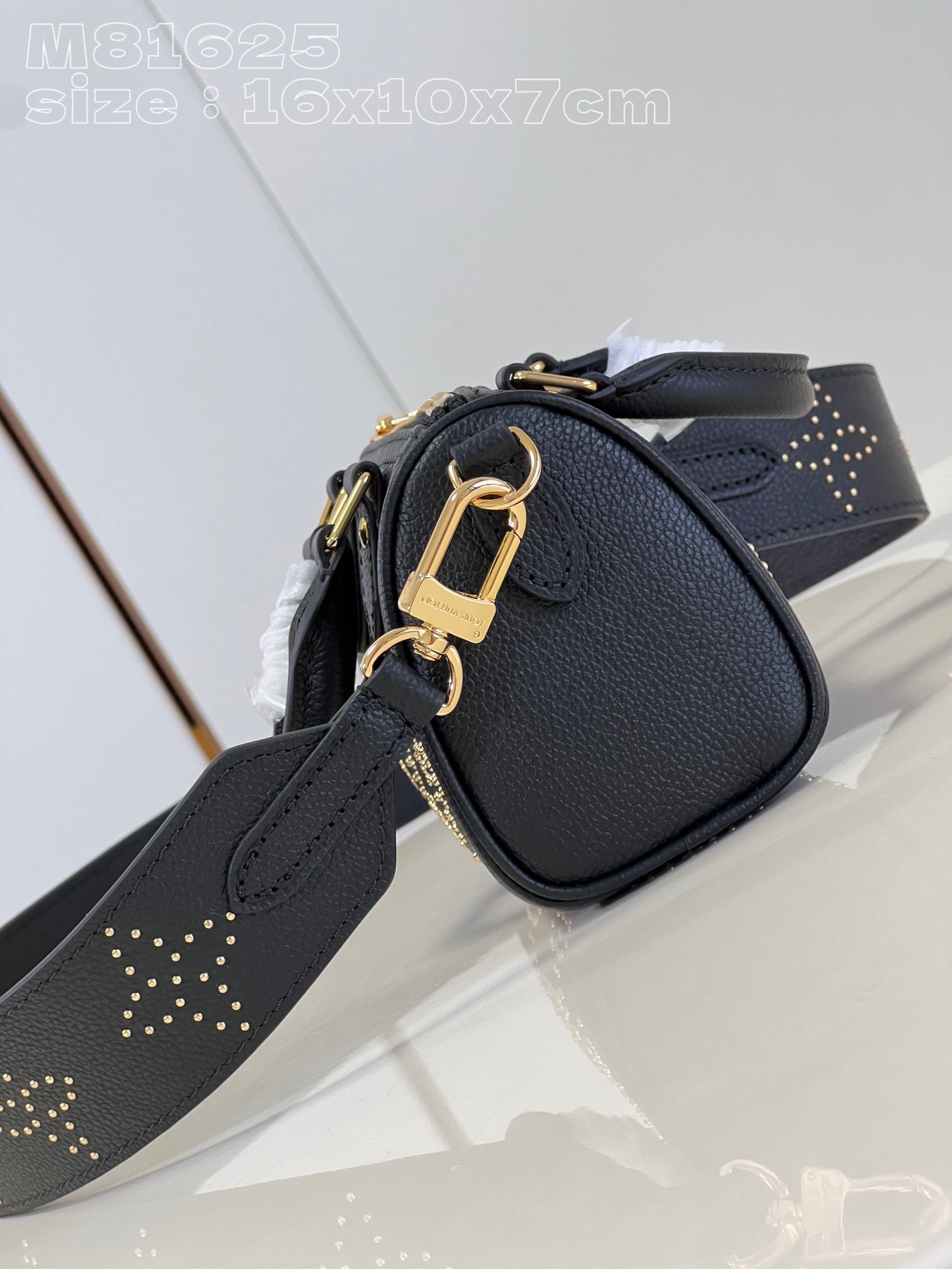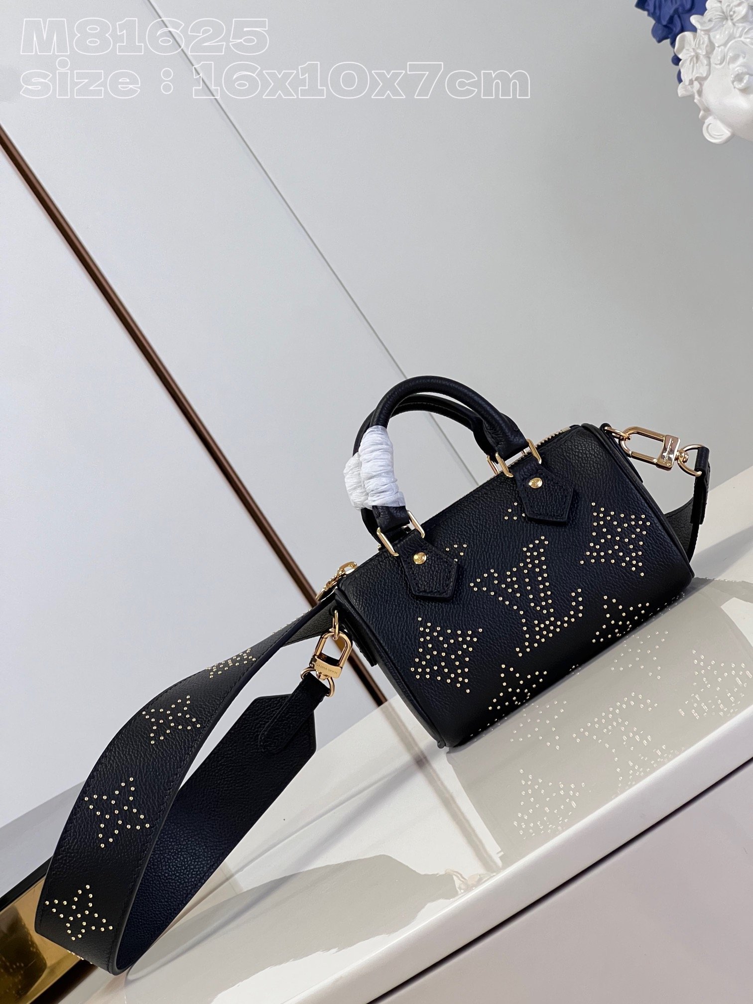 [Exclusive real shot of M81625 black studded] This Nano Speedy handbag is made of grained cow leather, with Monogram flowers constructed of dazzling studs, releasing a gorgeous style. A rolled leather top handle completes the petite silhouette, while the detachable shoulder strap is also studded with Monogram flower clusters. Zippers keep essentials secure. 16 x 10 x 7.5 cm (length x height x width)