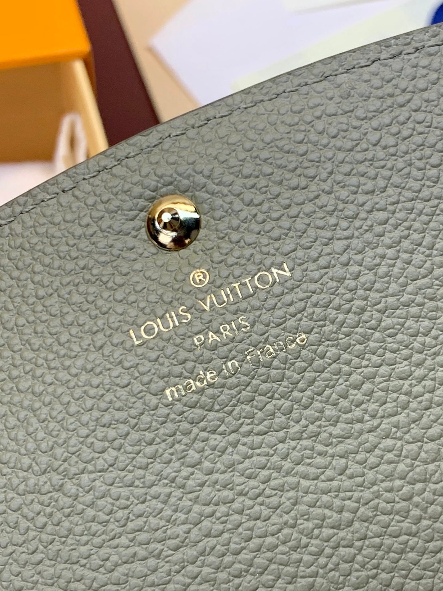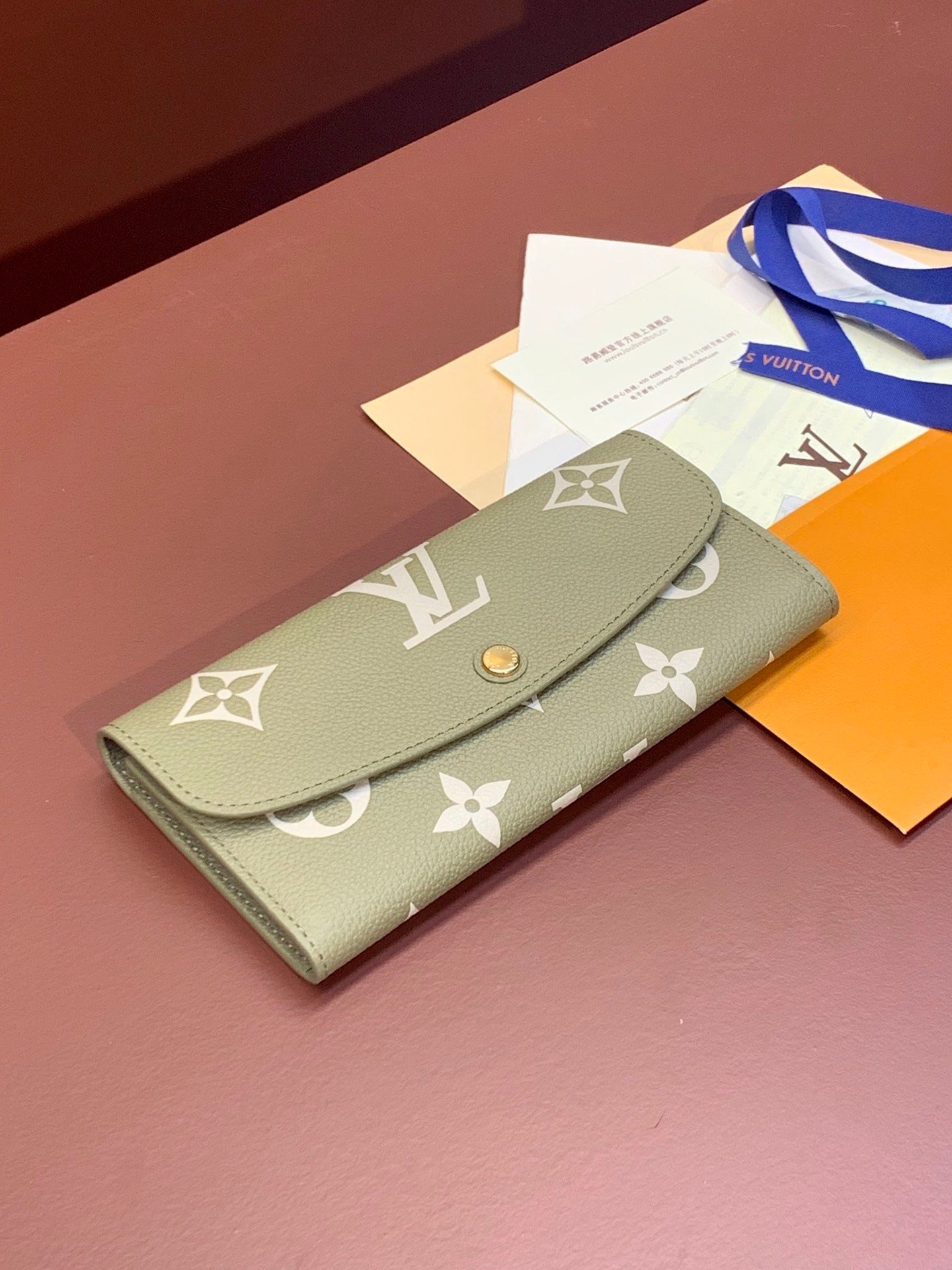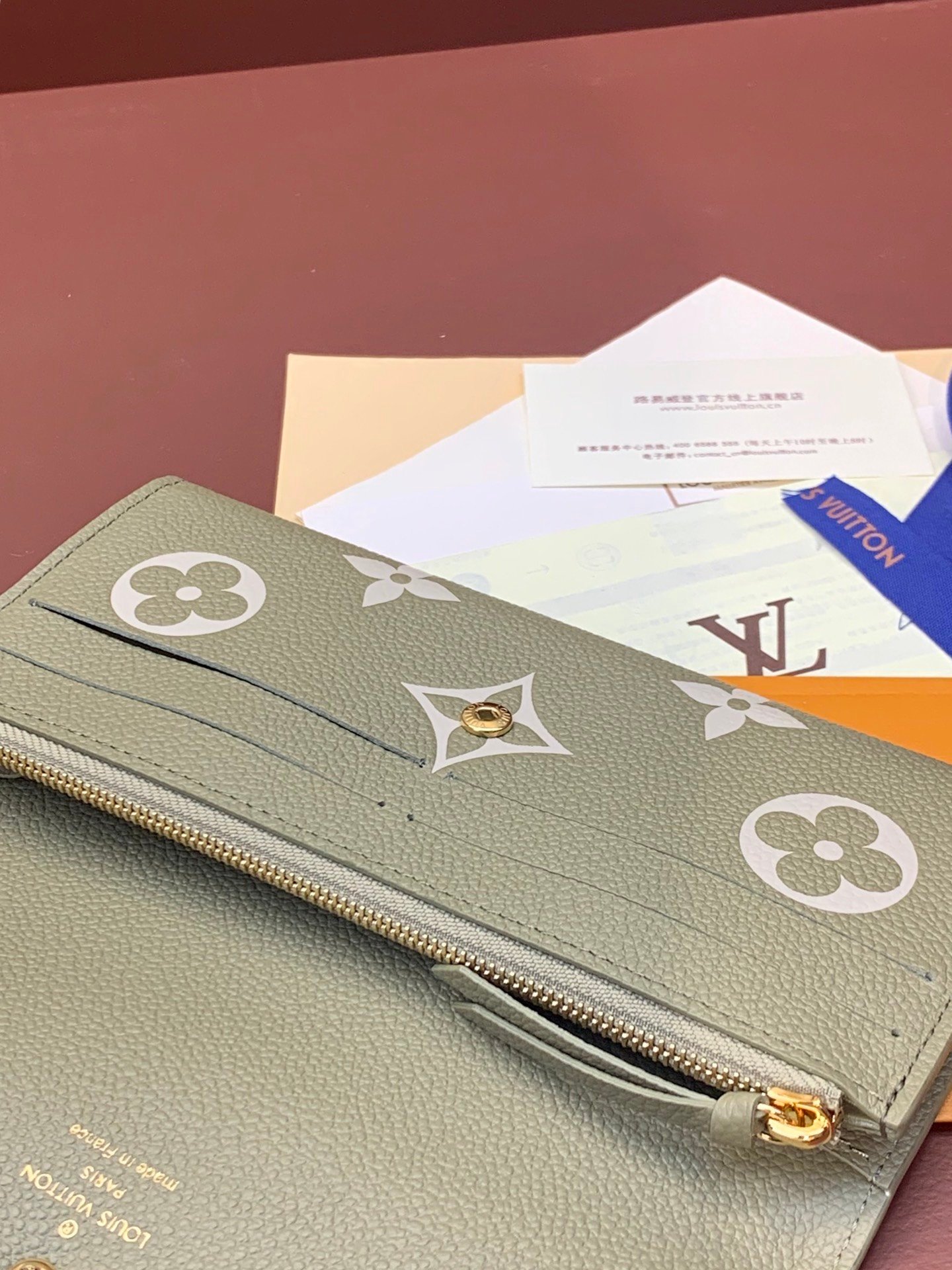 M82341 green, this Emilie wallet is made of Monogram Empreinte grain leather, and has been embossed and printed to depict the large Monogram pattern. Its slim shape features a zipped coin pocket and card compartment, and can also be transformed into an elegant clutch. Size: 19 x 10 x 2 cm.