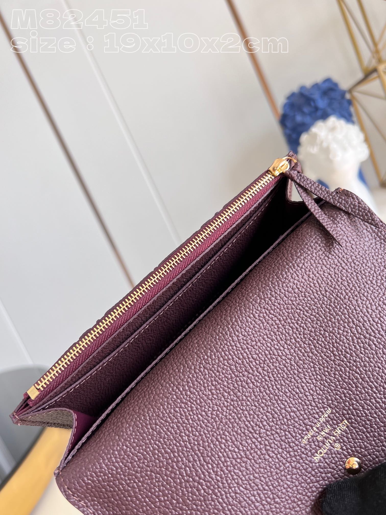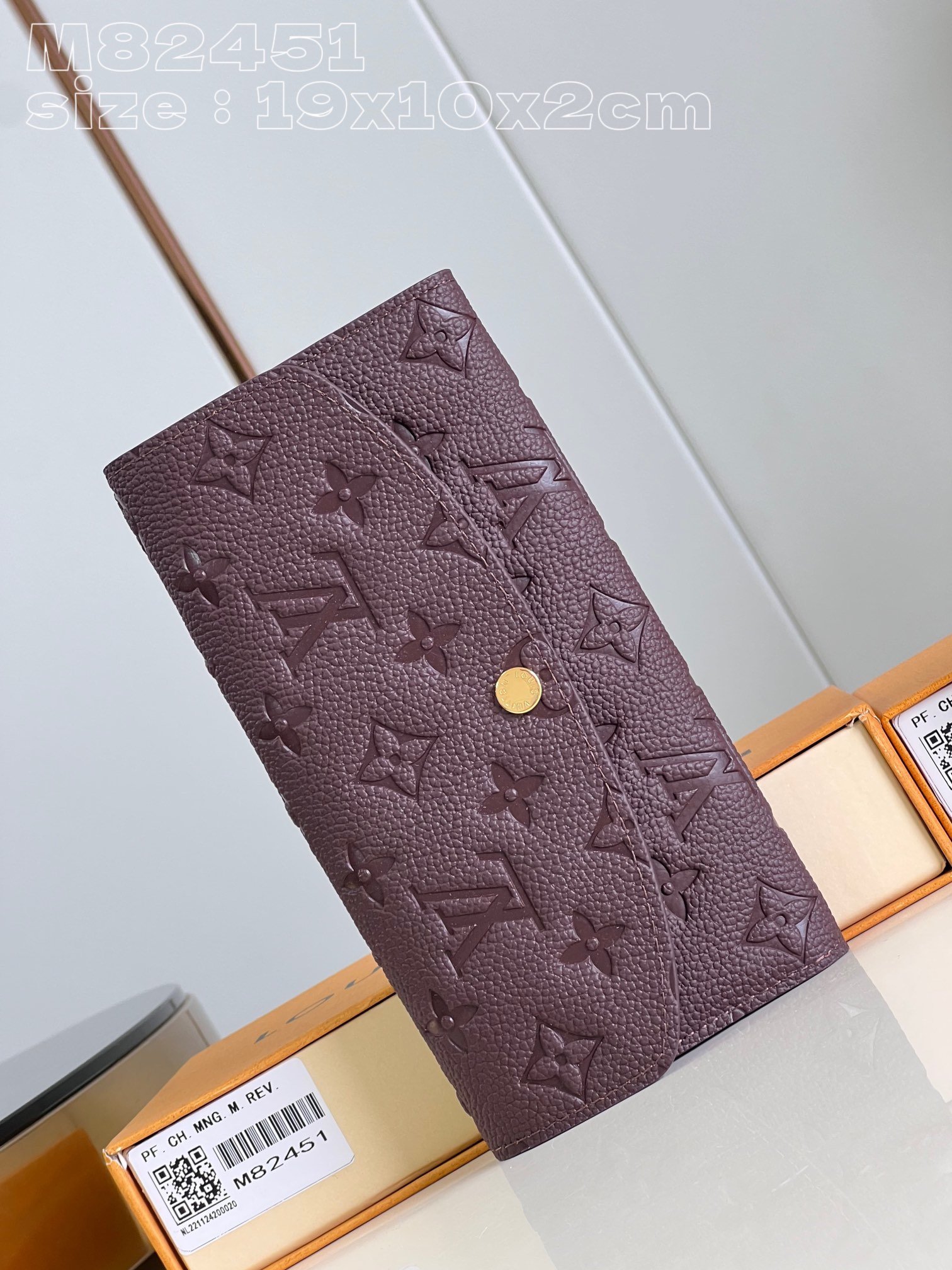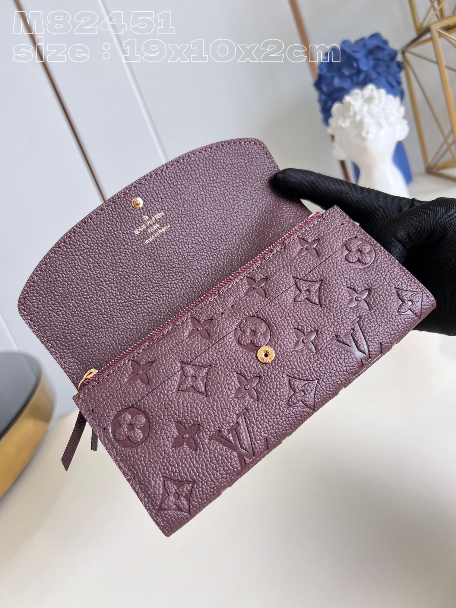 [Exclusive real shot M82451 burgundy] This Emilie wallet is made of Monogram Empreinte leather, embossed with the iconic Monogram pattern, and lined with soft contrasting grain leather. The envelope-style flap secures with tonal snaps, and the interior is organized with 1 large compartment, a zipped coin pocket, and multiple card slots. 19 x 10 x 2 cm (length x height x width)