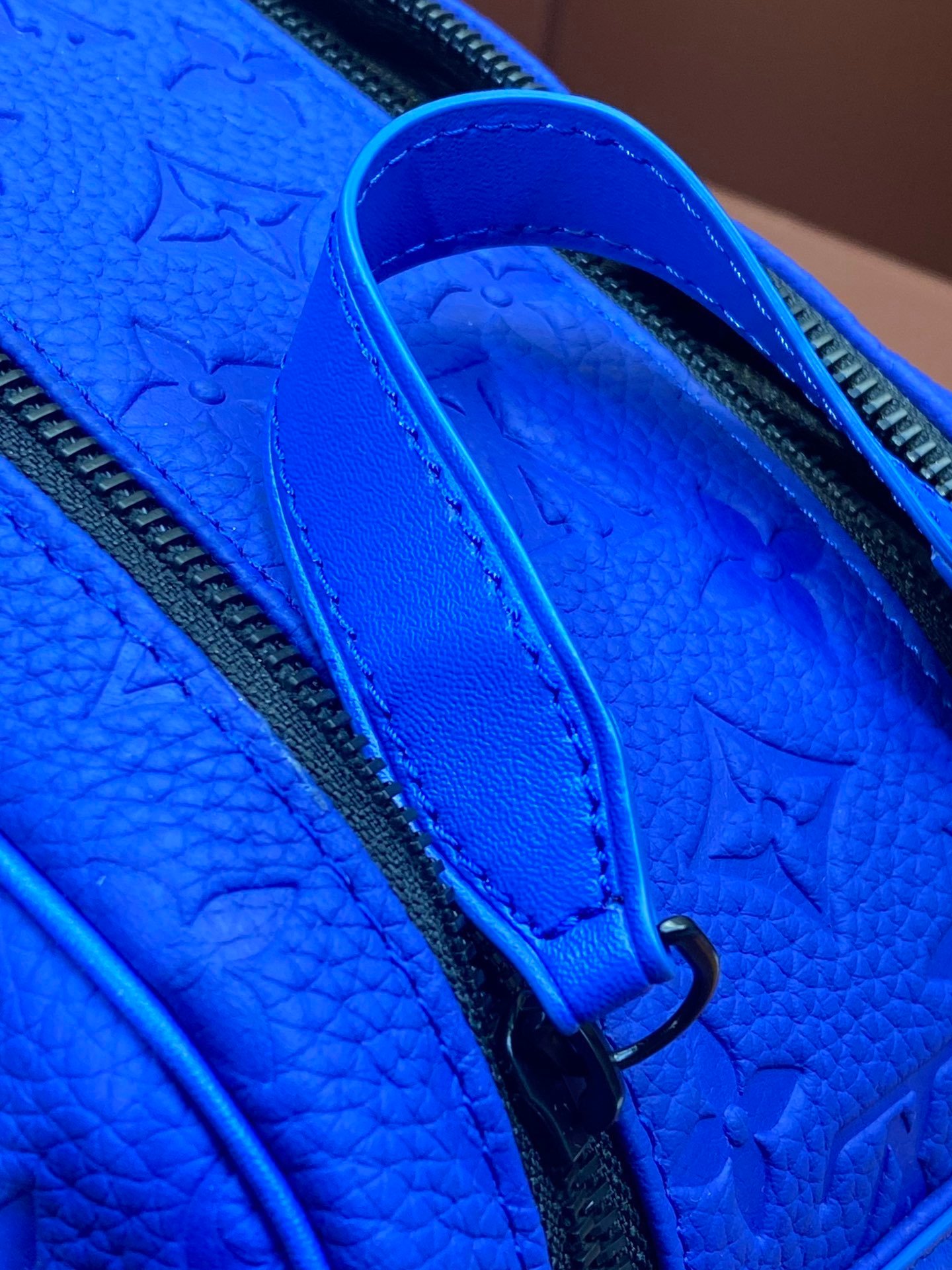 M82576 blue! This colorful Dopp Kit toiletry bag is made of genuine first-grain cowhide and is made of grained Taurillon leather with an embossed Monogram pattern. It is combined with a double-zipper wide-mouth design and a washable lining to properly store and carry toiletries. Stable handle makes it easy to hang on bathroom hooks. Dimensions: 28 x 15 x 16.5 cm