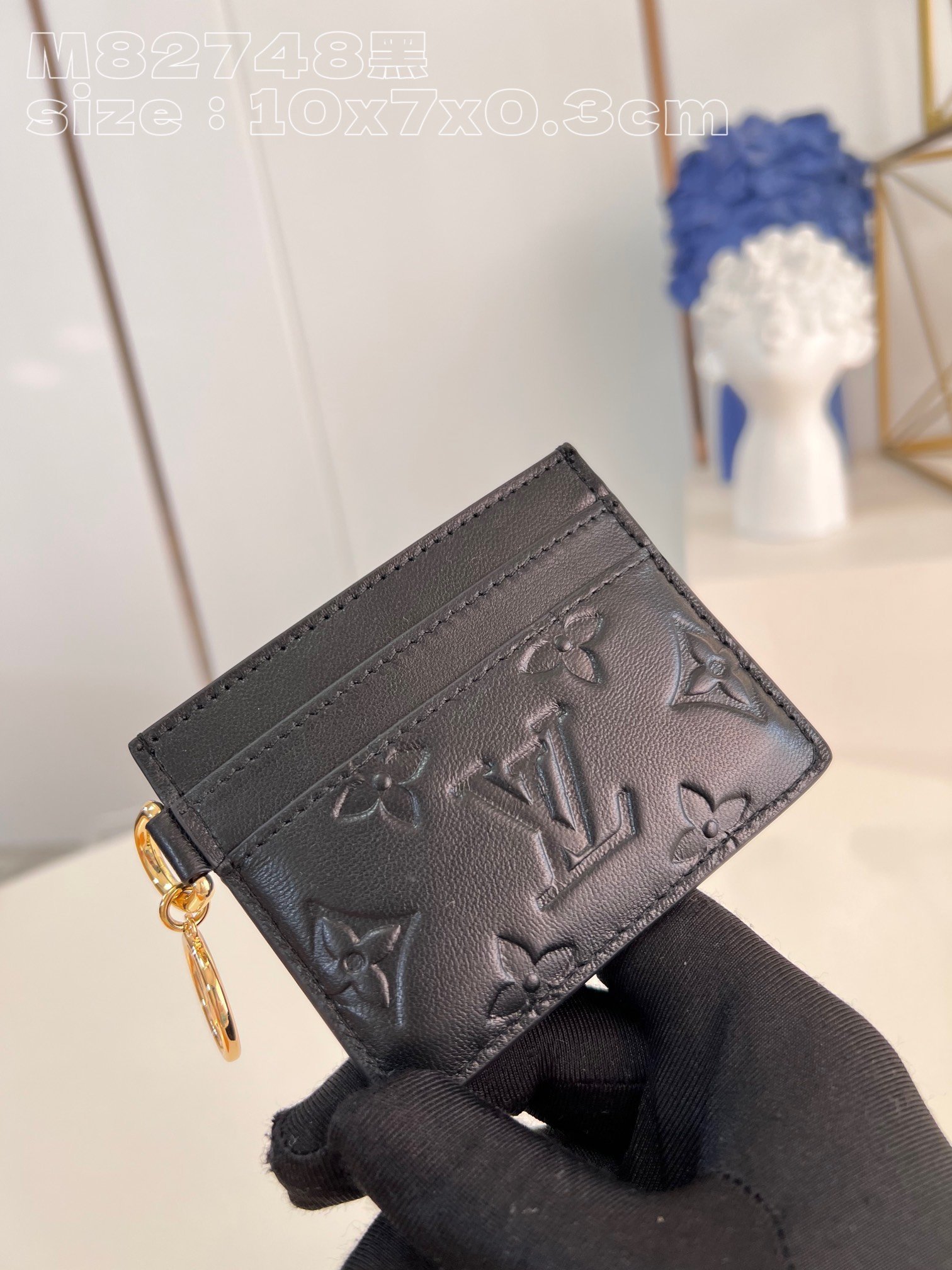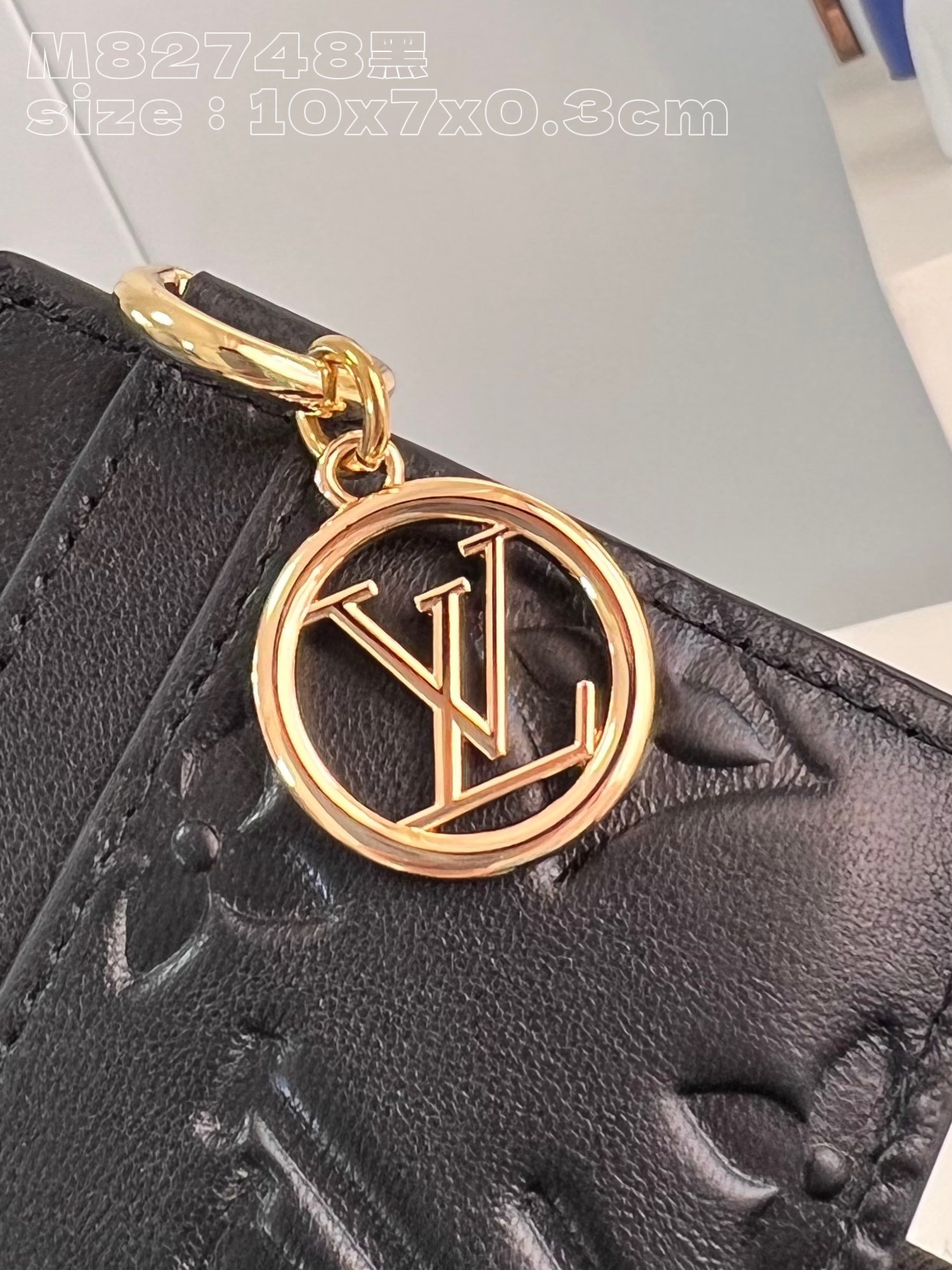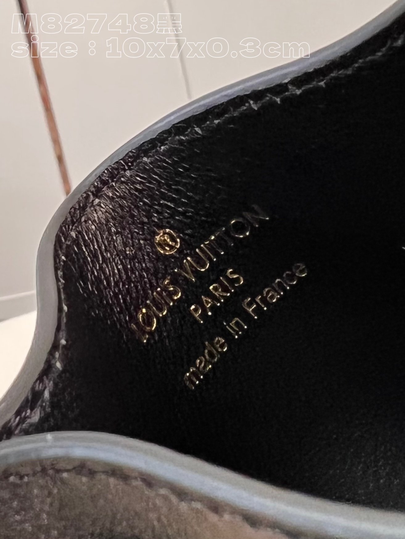[Exclusive real shot M82748 black] This business card holder is made of Monogram embossed lambskin. It has an external business card compartment and a large internal pocket for storing business cards or other small items. The business card holder is embellished with a non-detachable LV Circle logo charm, highlighting the brand’s meticulous craftsmanship. 10.2 x 7.3 x 0.3 cm (length x height x width)