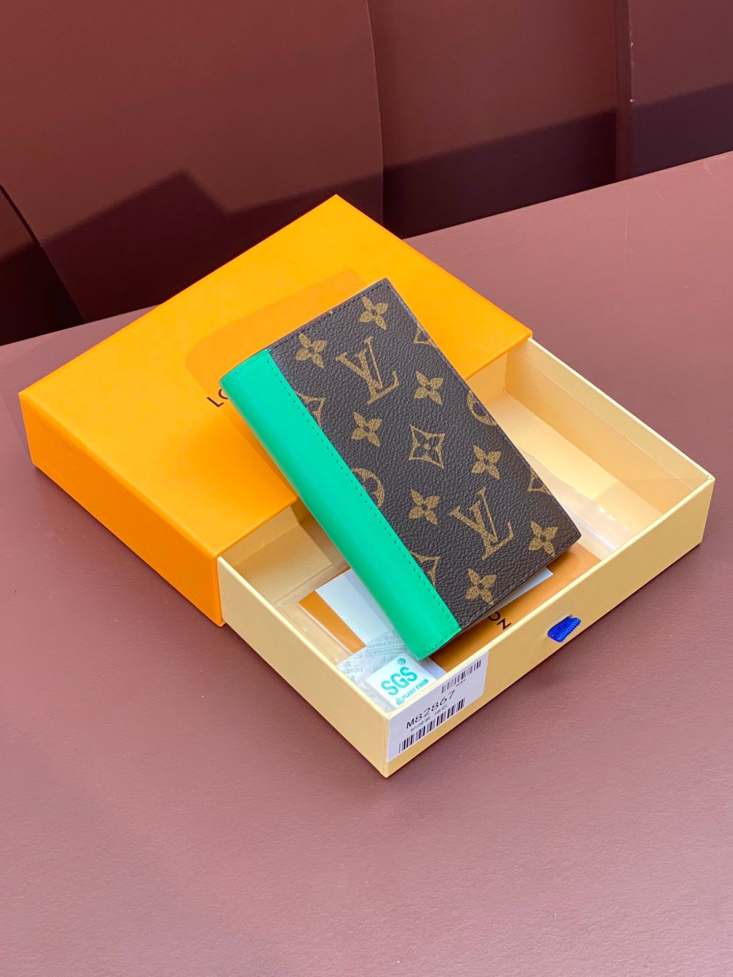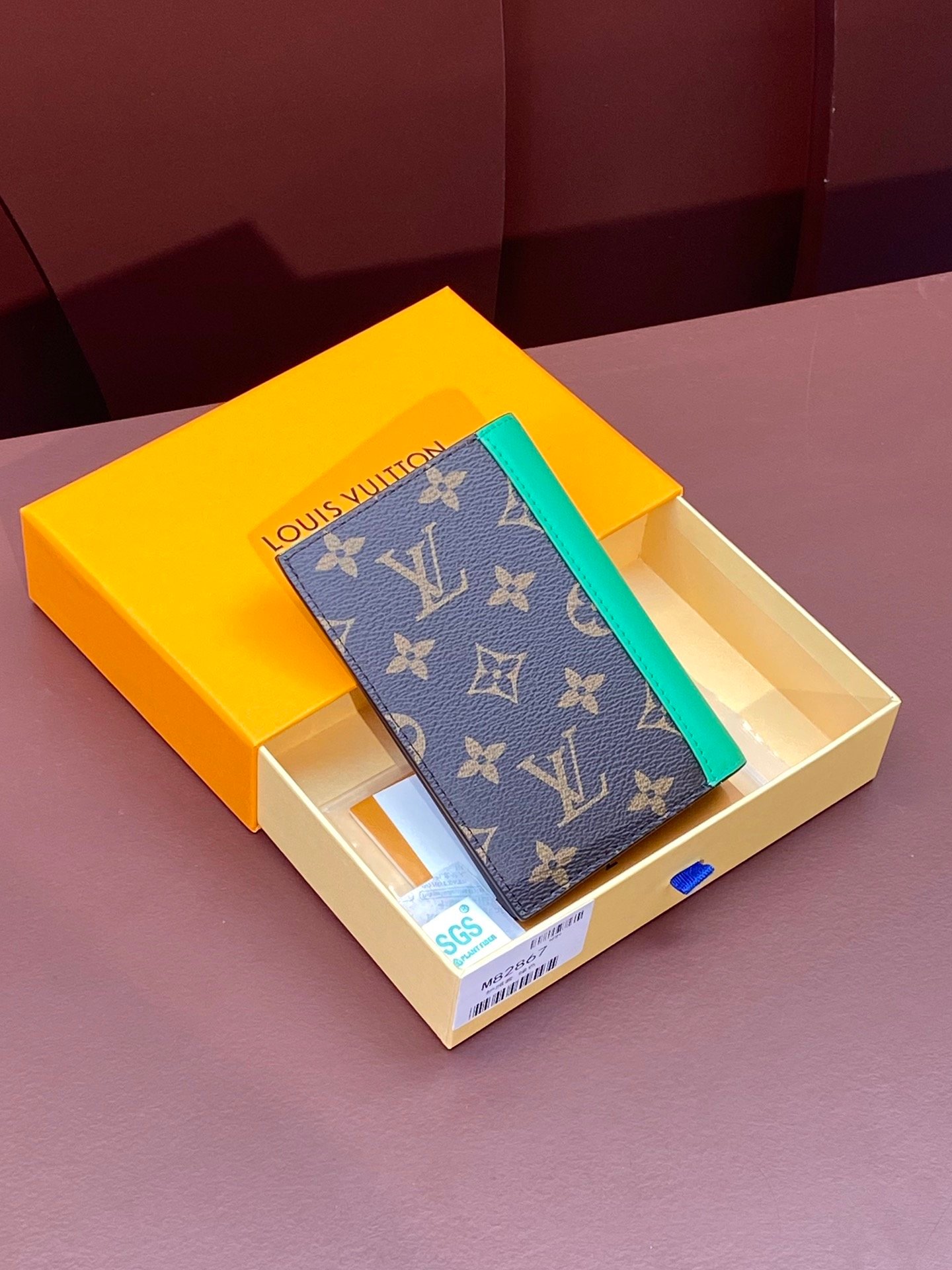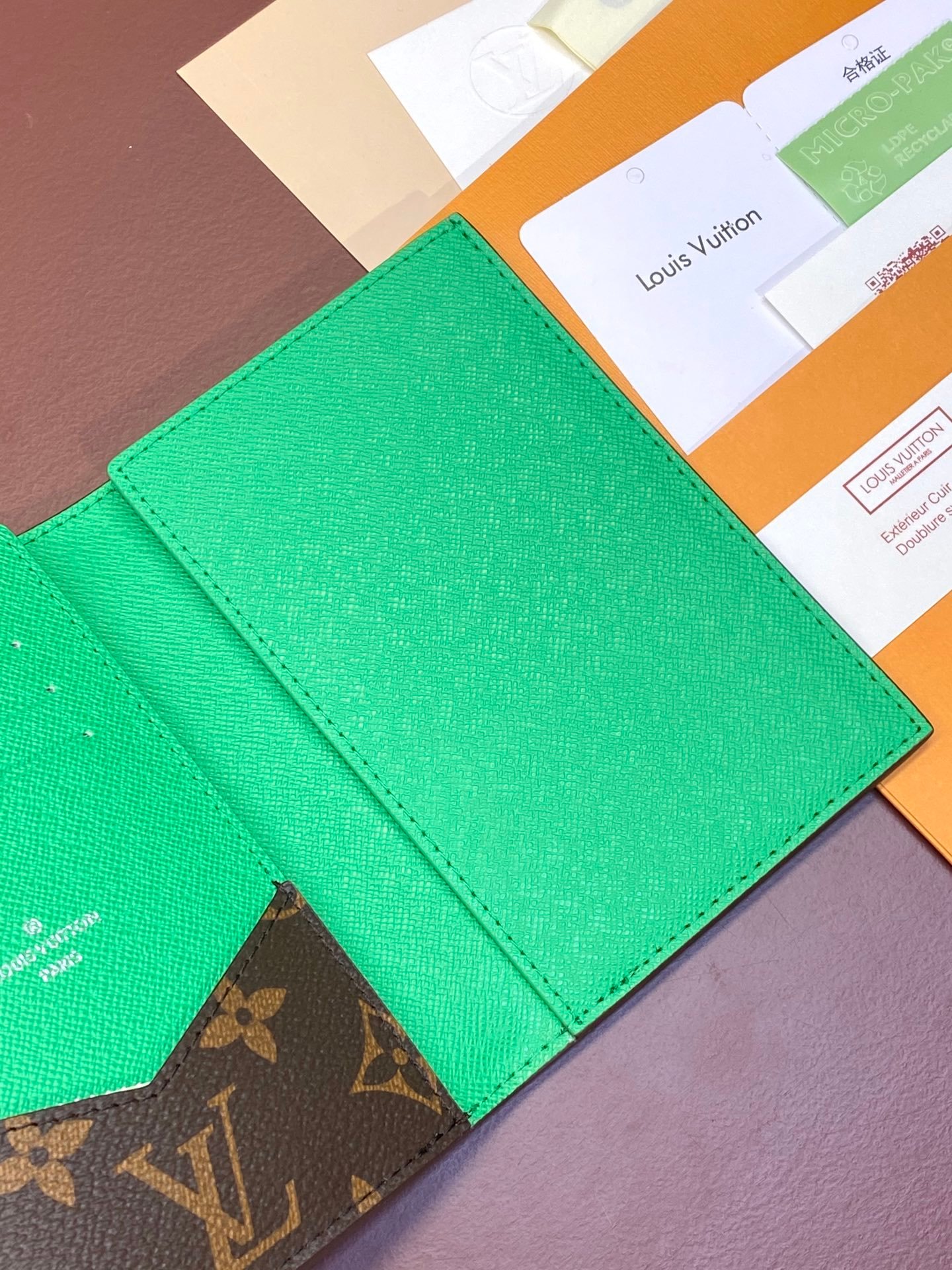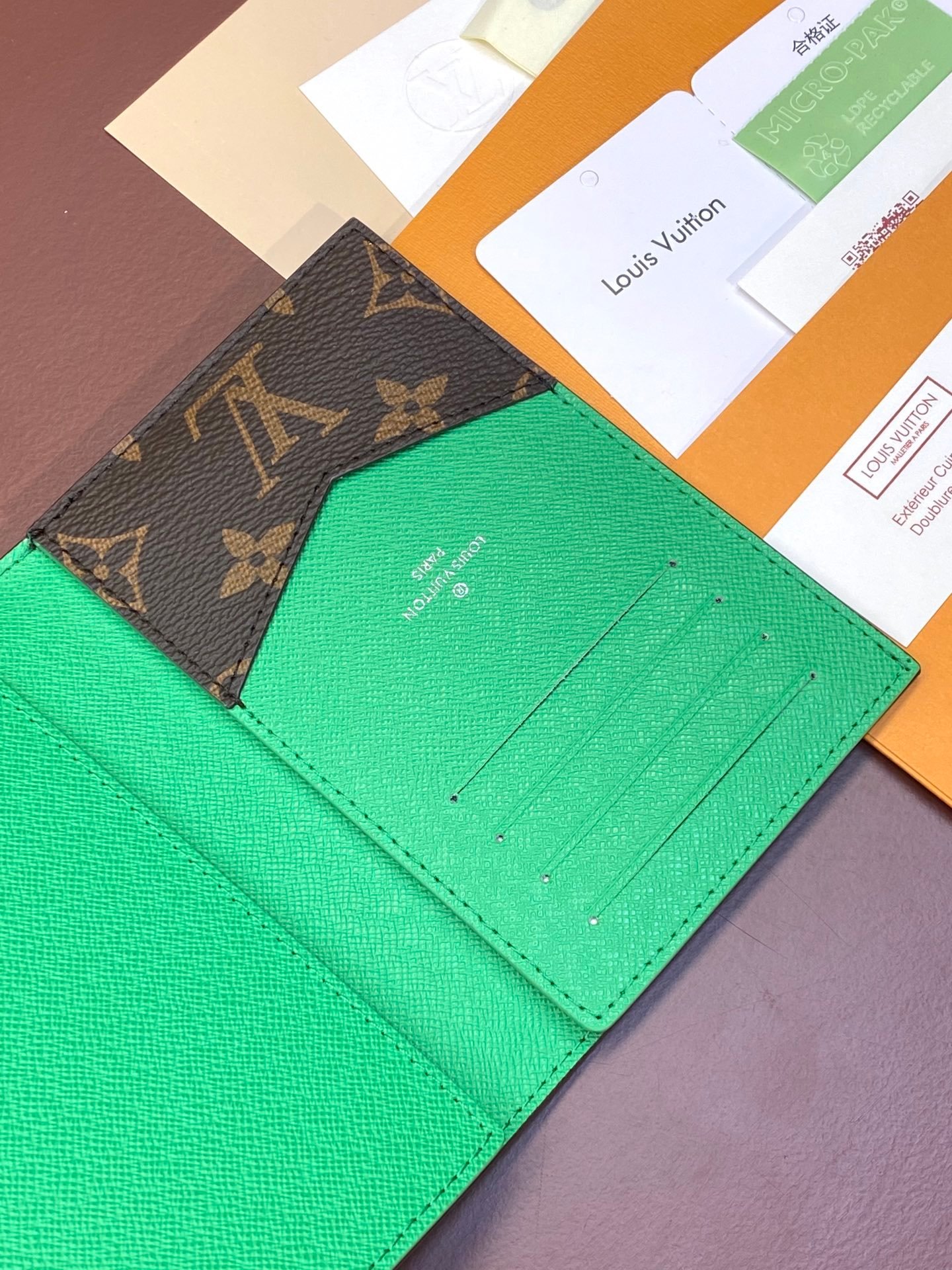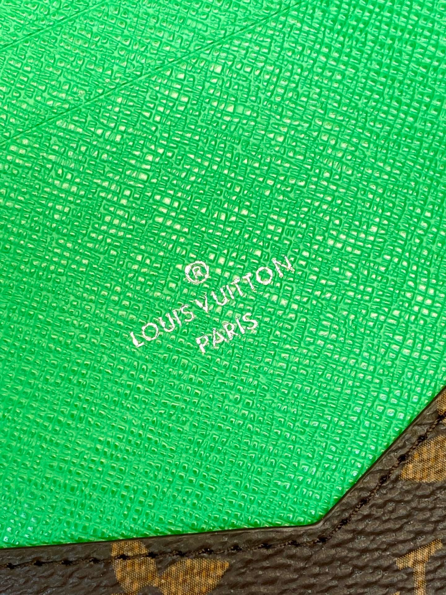 M82867 Green! Passport case, this passport case is made of Monogram Macassar canvas with bright leather trim, and the fabric lining continues the same tone. The practical design features slip pockets and multiple card slots to store your passport and other items. 10 x 14 x 2.5 cm
