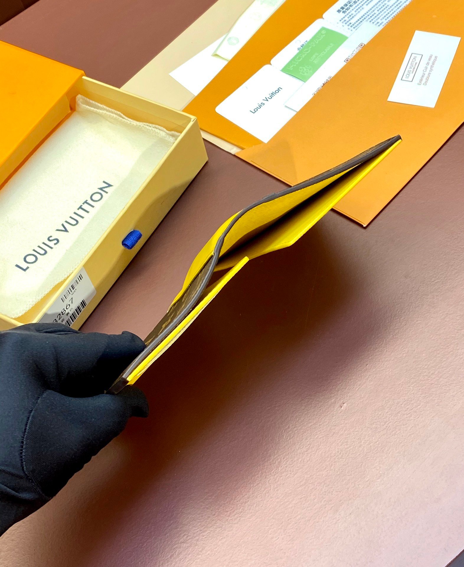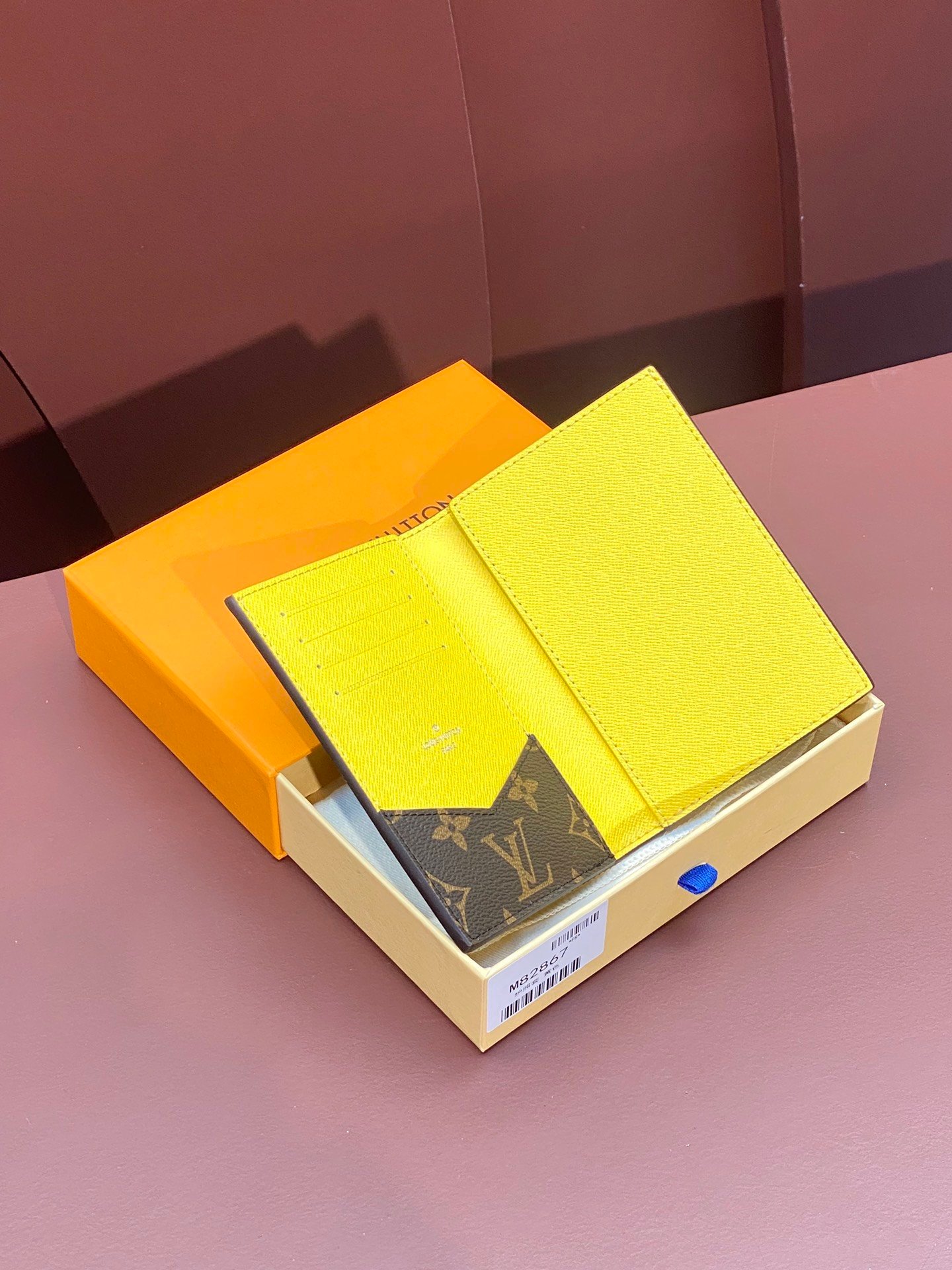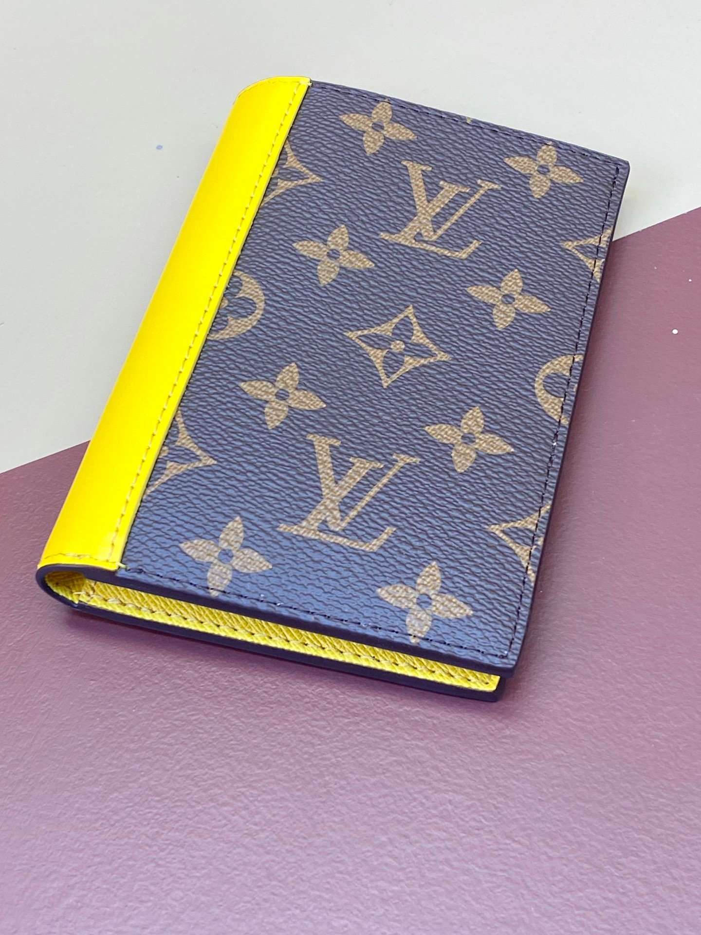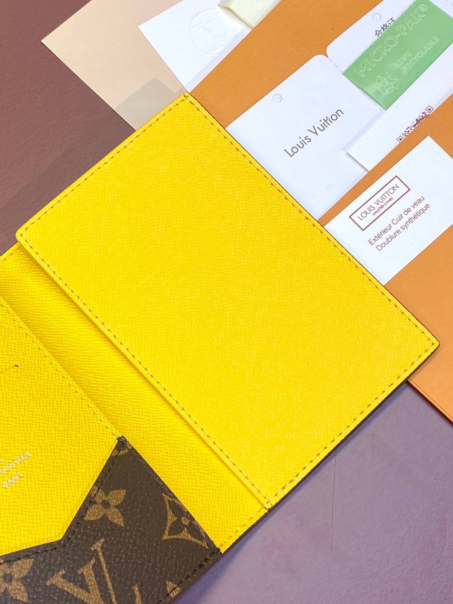 M82867 Yellow! Passport case, this passport case is made of Monogram Macassar canvas with bright leather trim, and the fabric lining continues the same tone. The practical design features slip pockets and multiple card slots to store your passport and other items. 10 x 14 x 2.5 cm