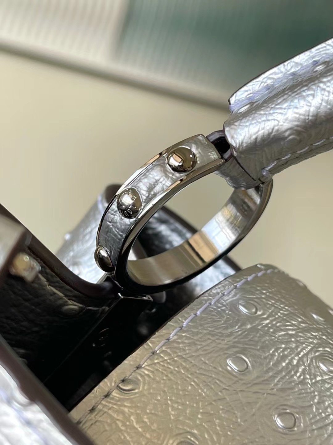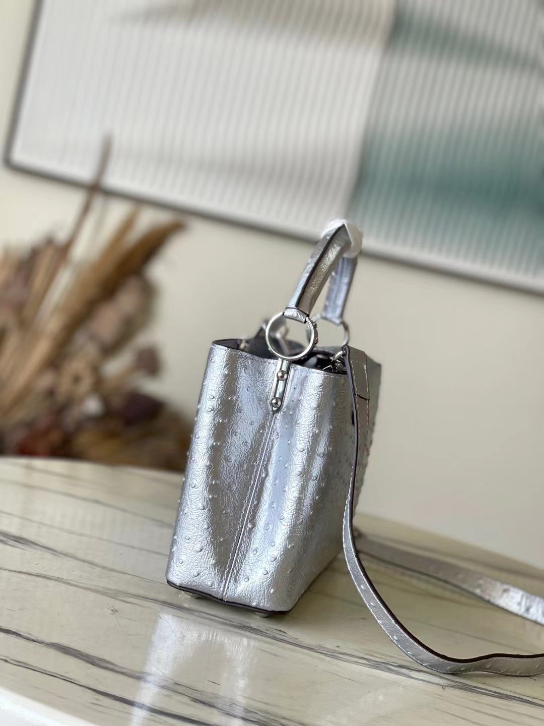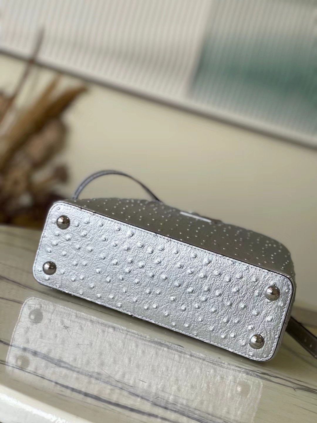 Top original order M95393 silver ostrich leather small Capucines ostrich leather handbag, moderately hard handle, gorgeous buckle connecting the handle, spacious and practical shape, etc. The hanging cover can be used in two ways. When placed outside the bag, it can show the fashionable Monogram flower pattern. Size: 27*21*10 cm