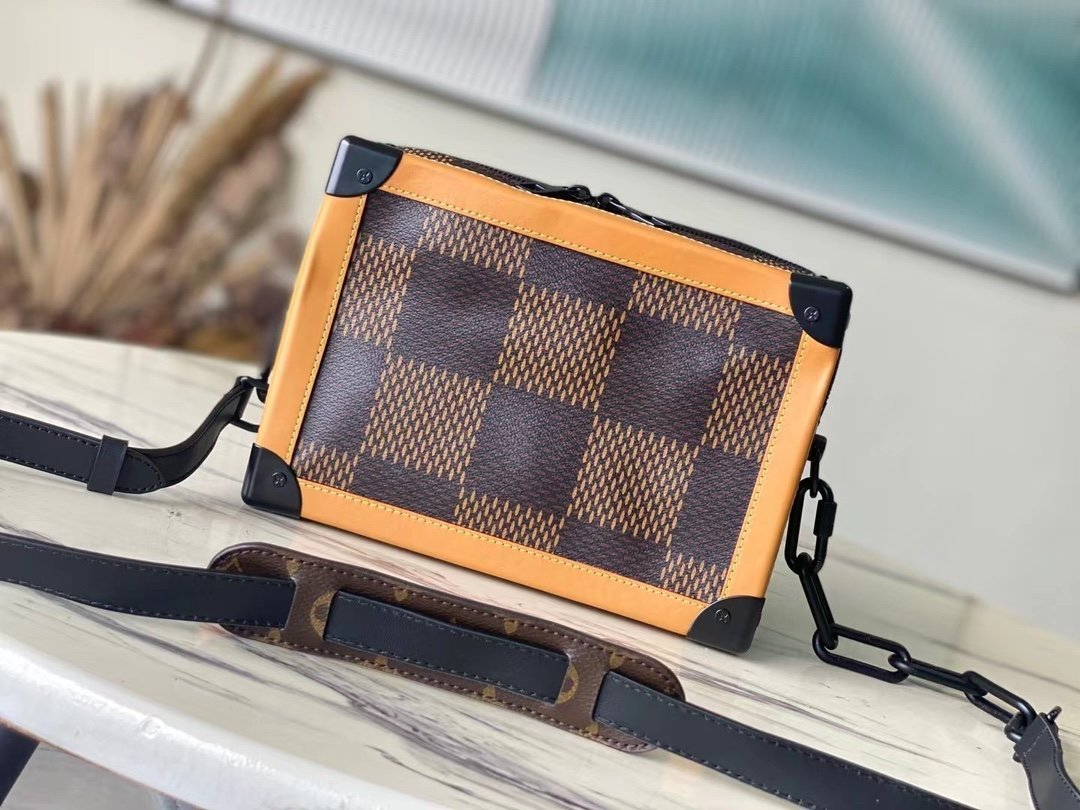Top original item N40381 Virgil Abloh and Japanese streetwear designer Nigo team up to refresh the SOFT TRUNK chain bag. Giant Damier Ebene canvas is paired with natural leather, while leather corners, padlocks and S-lock hooks reference the brand’s trunk-making heritage. The wavy silhouette of Monogram canvas on the front inspires street style. Dimensions: 25 x 18 x 10 cm