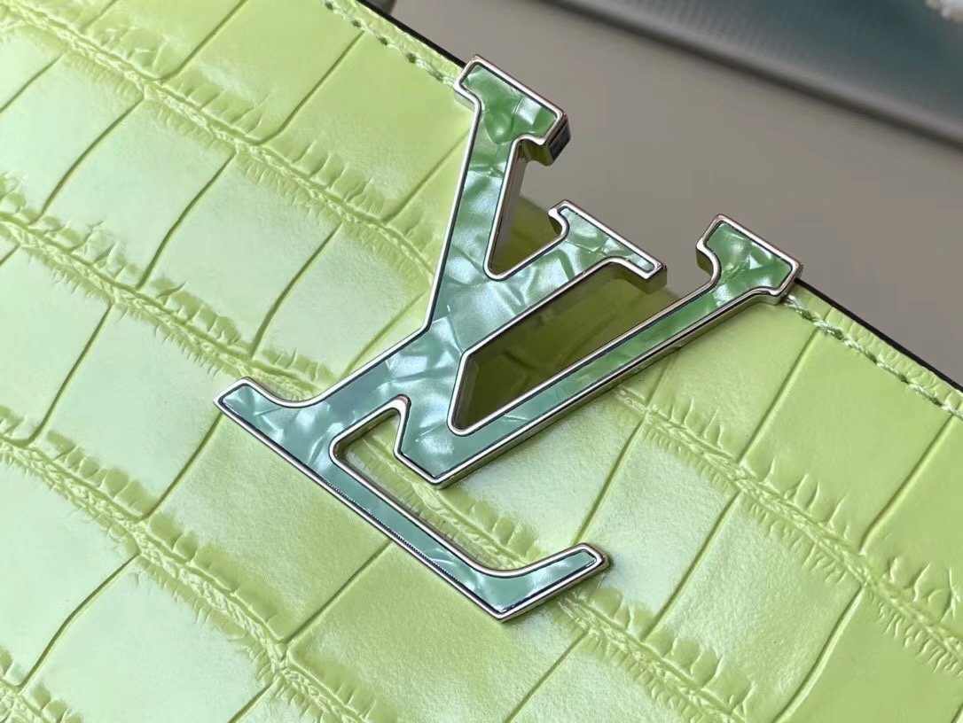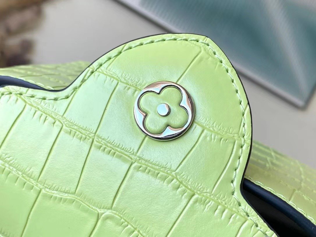 Top original order N48865 lime green mini (cowhide embossed crocodile pattern). The noble crocodile leather pattern has been polished and sparkles charmingly. It has luxurious goatskin lining and sparkling metal accessories. The unique Capucines Yhl cover can be stored in the bag for display. The letter logo can be turned outwards to display the Monogram Flower pattern. Size: 21*14*8cm