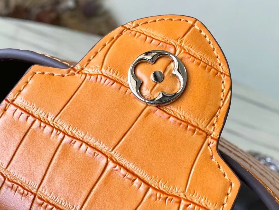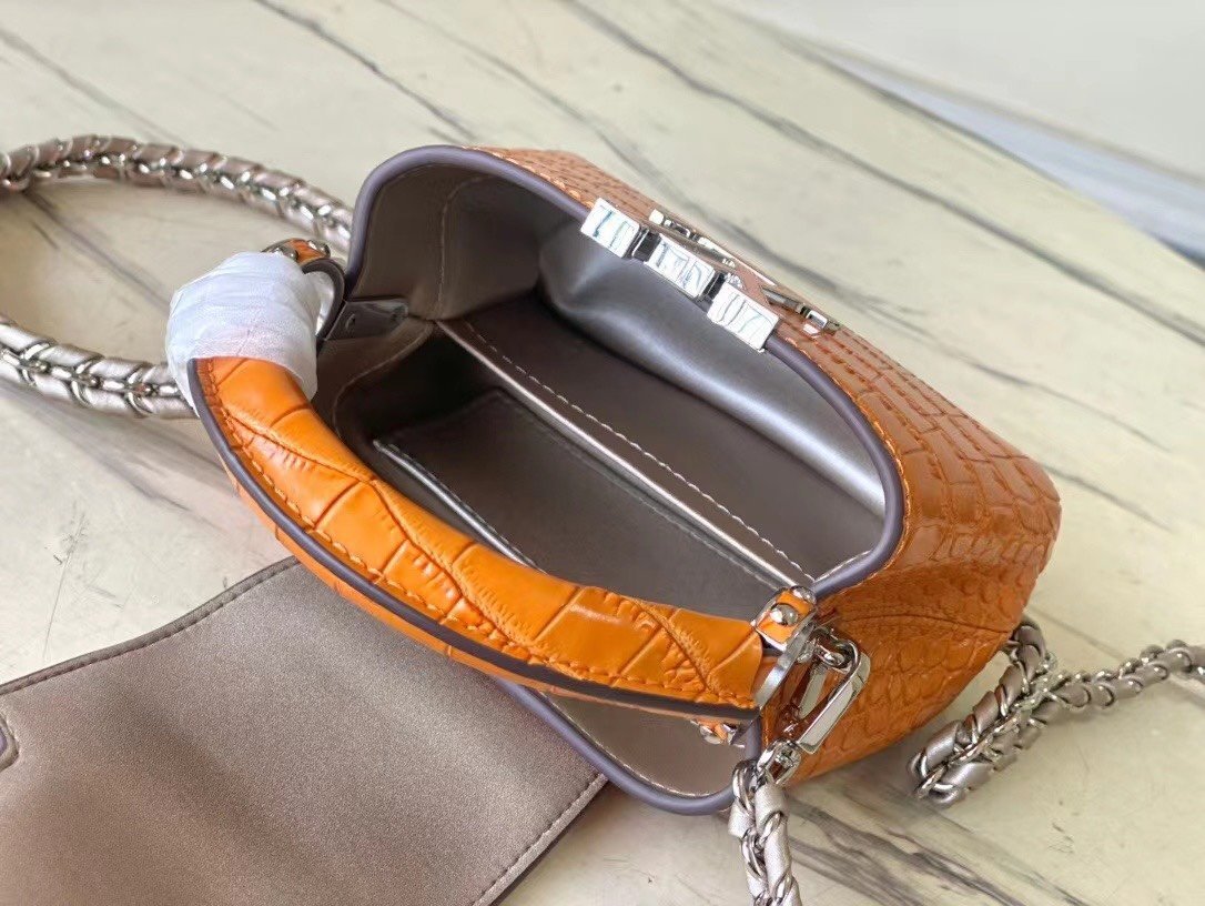 Top original order N48865 Orange super mini (cow leather embossed crocodile pattern). The noble crocodile leather pattern has been polished and shines charmingly. The luxurious goatskin lining and sparkling metal accessories. The unique Capucines Yhl cover can be stored in the bag to display the letters. The logo can be turned outwards to reveal the Monogram Flower pattern. Size: 16*11*6.5cm
