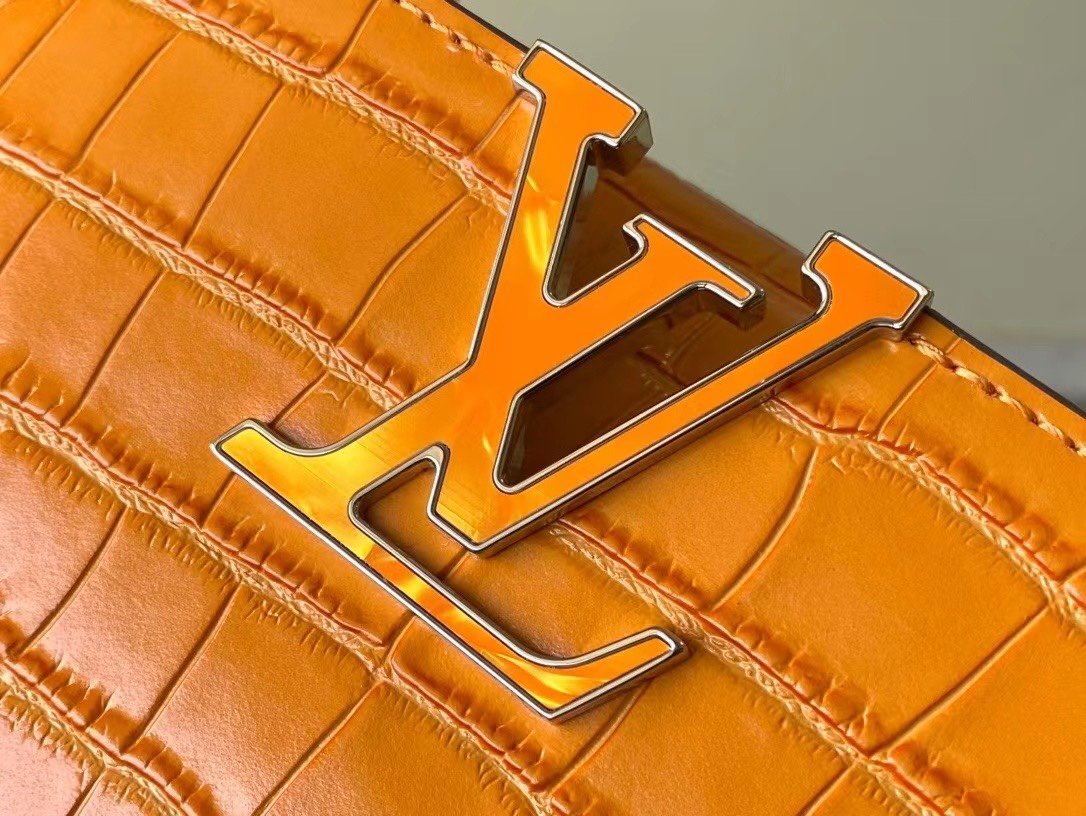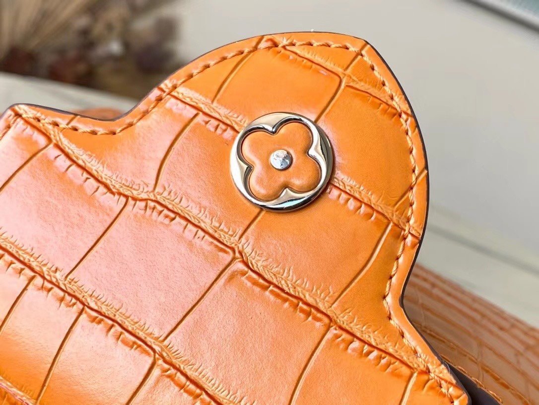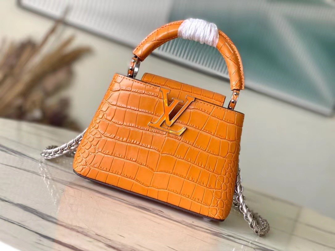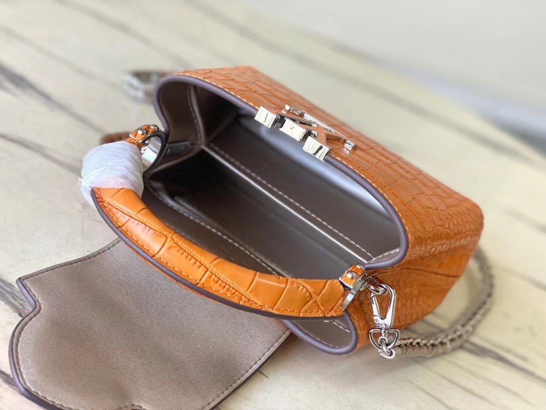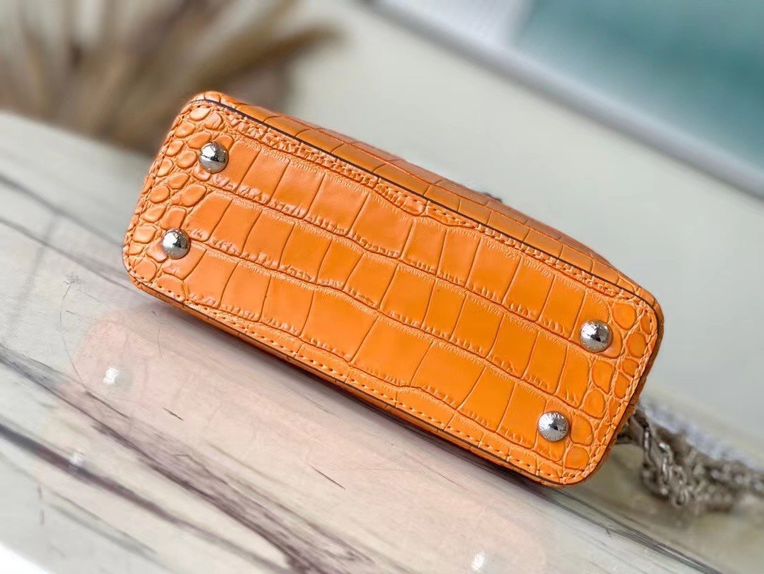 Top original order N48865 orange mini (cowhide embossed crocodile pattern). The noble crocodile leather pattern has been polished and shines charmingly. It has luxurious goatskin lining and sparkling metal accessories. The unique Capucines Yhl cover can be stored in the bag to display the letter logo. It can also be turned outwards to display the Monogram Flower pattern. Size: 21*14*8cm