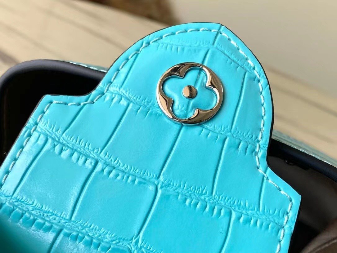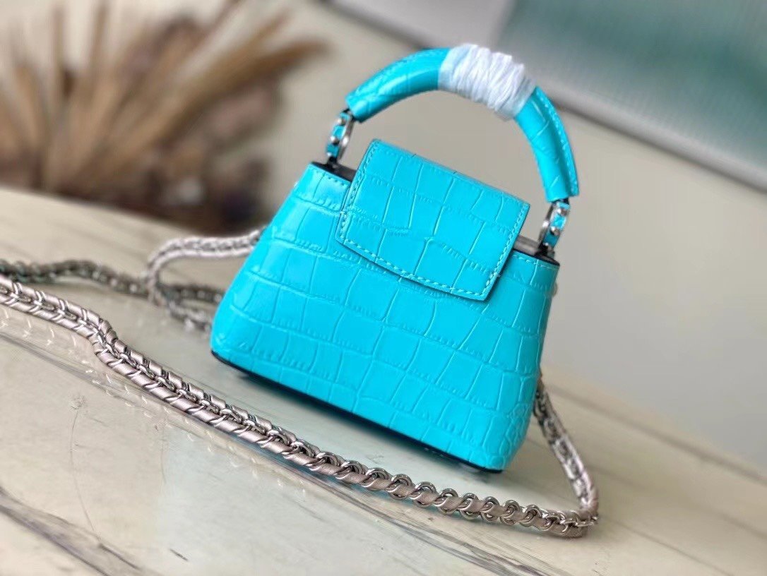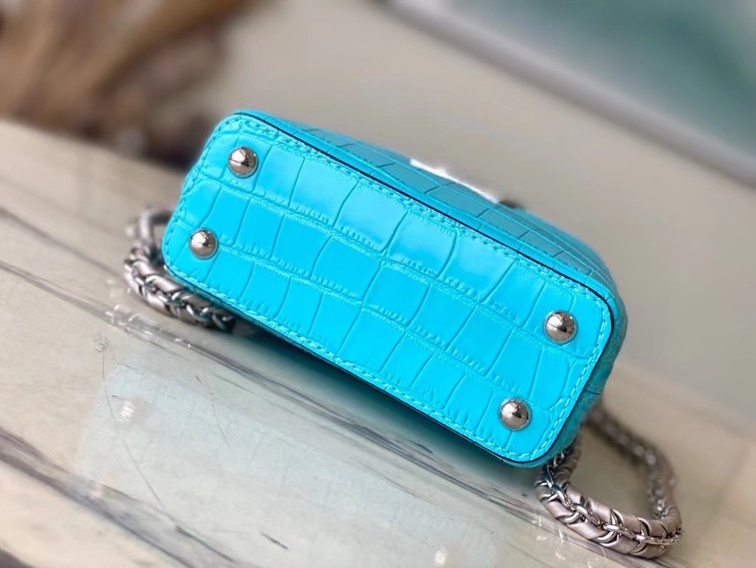 Top original order N48865 blue super mini (cow leather embossed crocodile pattern). The noble crocodile leather pattern has been polished and shines charmingly. The luxurious goatskin lining and sparkling metal accessories. The unique Capucines Yhl cover can be stored in the bag for display. The letter logo can be turned outwards to display the Monogram Flower pattern. Size: 16*11*6.5cm