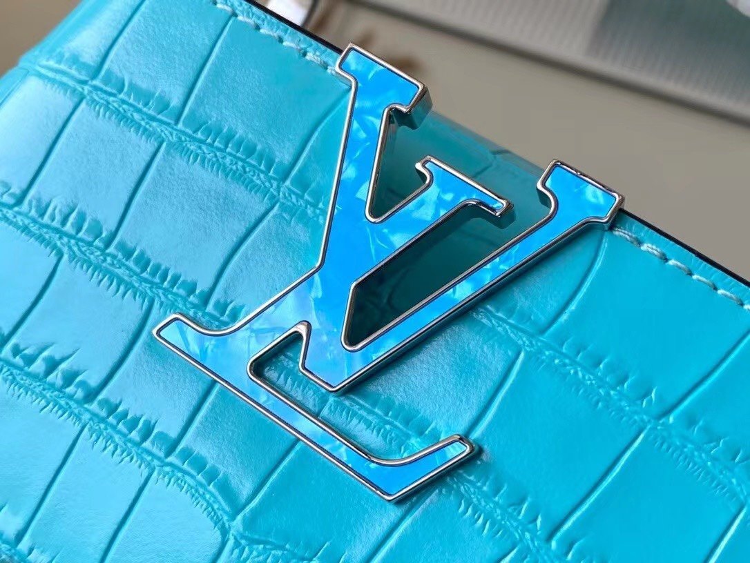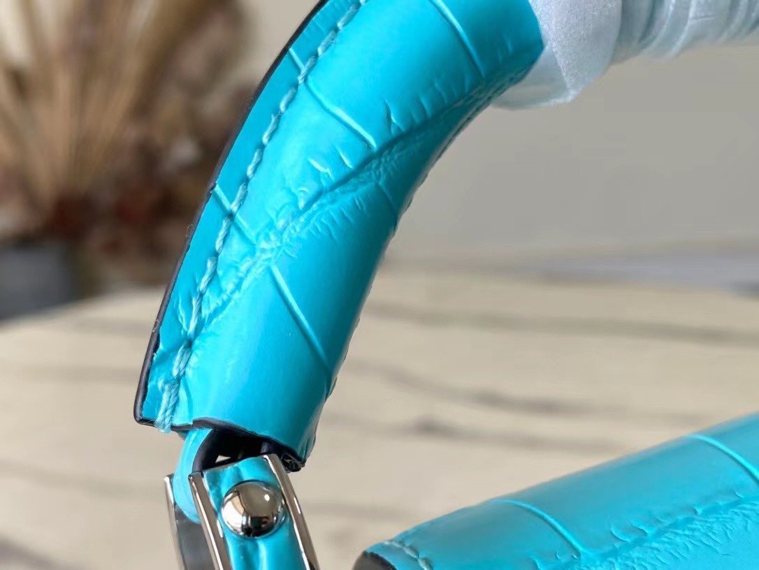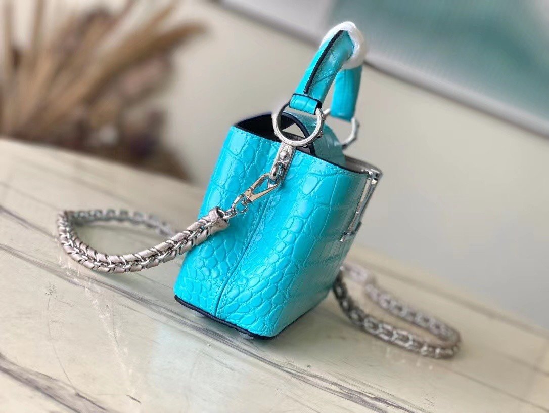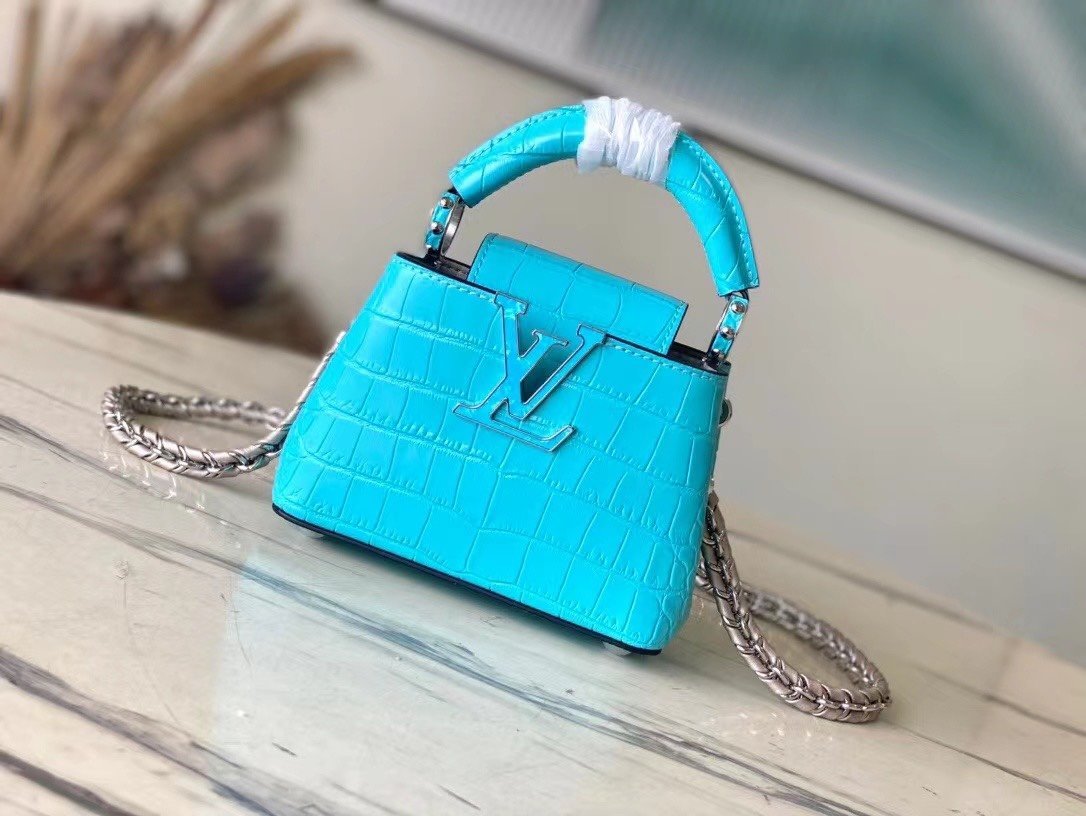Top original order N48865 blue super mini (cow leather embossed crocodile pattern). The noble crocodile leather pattern has been polished and shines charmingly. The luxurious goatskin lining and sparkling metal accessories. The unique Capucines Yhl cover can be stored in the bag for display. The letter logo can be turned outwards to display the Monogram Flower pattern. Size: 16*11*6.5cm