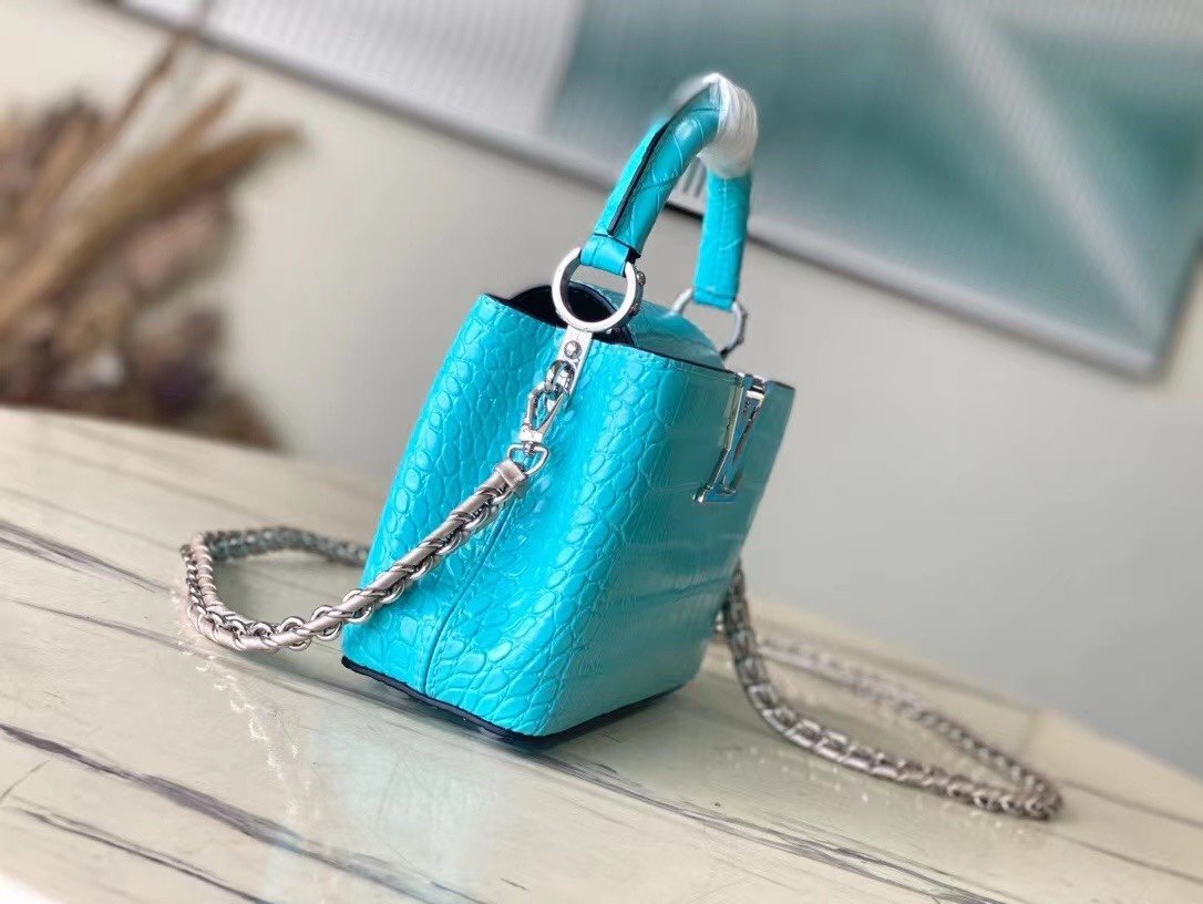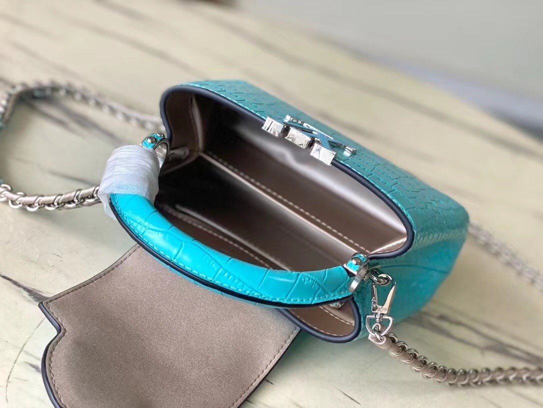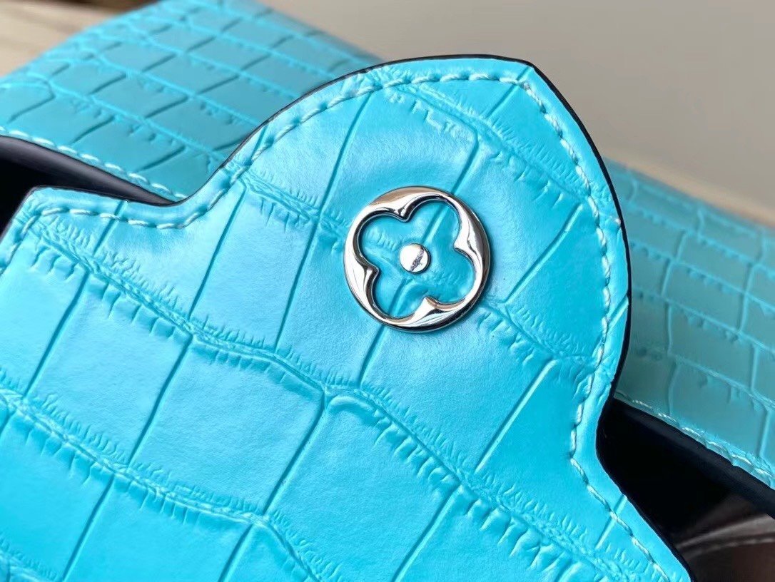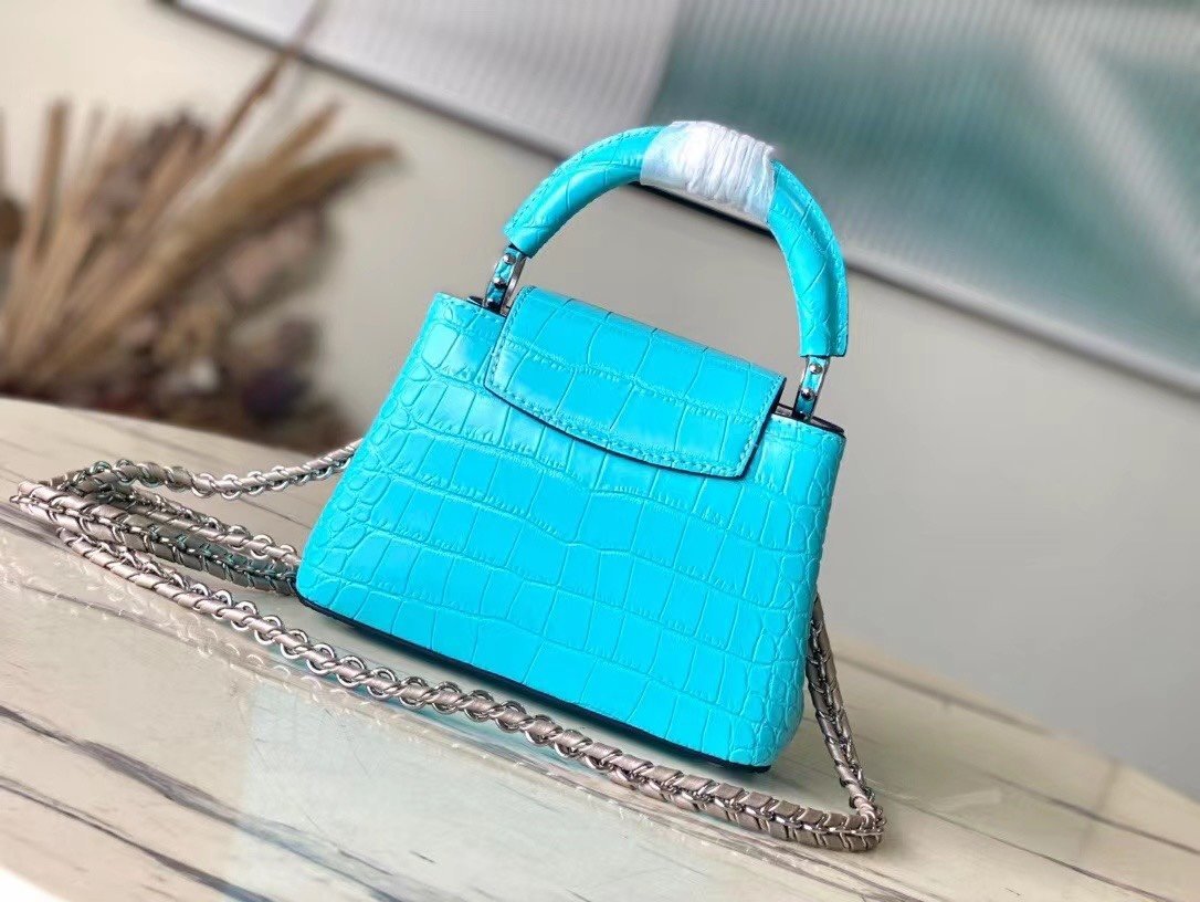 Top original order N48865 blue mini (cow leather embossed crocodile pattern). The noble crocodile leather pattern has been polished to shine charmingly. It has luxurious goatskin lining and sparkling metal accessories. The unique Capucines Yhl cover can be stored in the bag to display letters. The logo can be turned outwards to reveal the Monogram Flower pattern. Size: 21*14*8cm