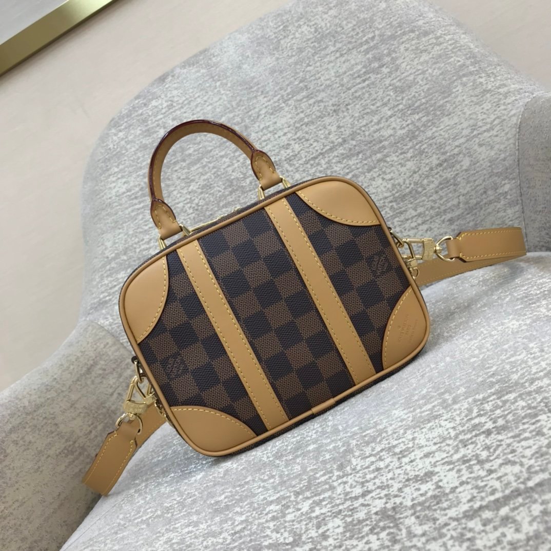 The Valisette Souple BB handbag inherits the design essence of the traditional luggage of Lu*. Made of Damier Ebene canvas with leather corners. Side straps and L* key holder. Textile lining and pockets. Shoulder strap. Chain and top handle for multiple carrying options.