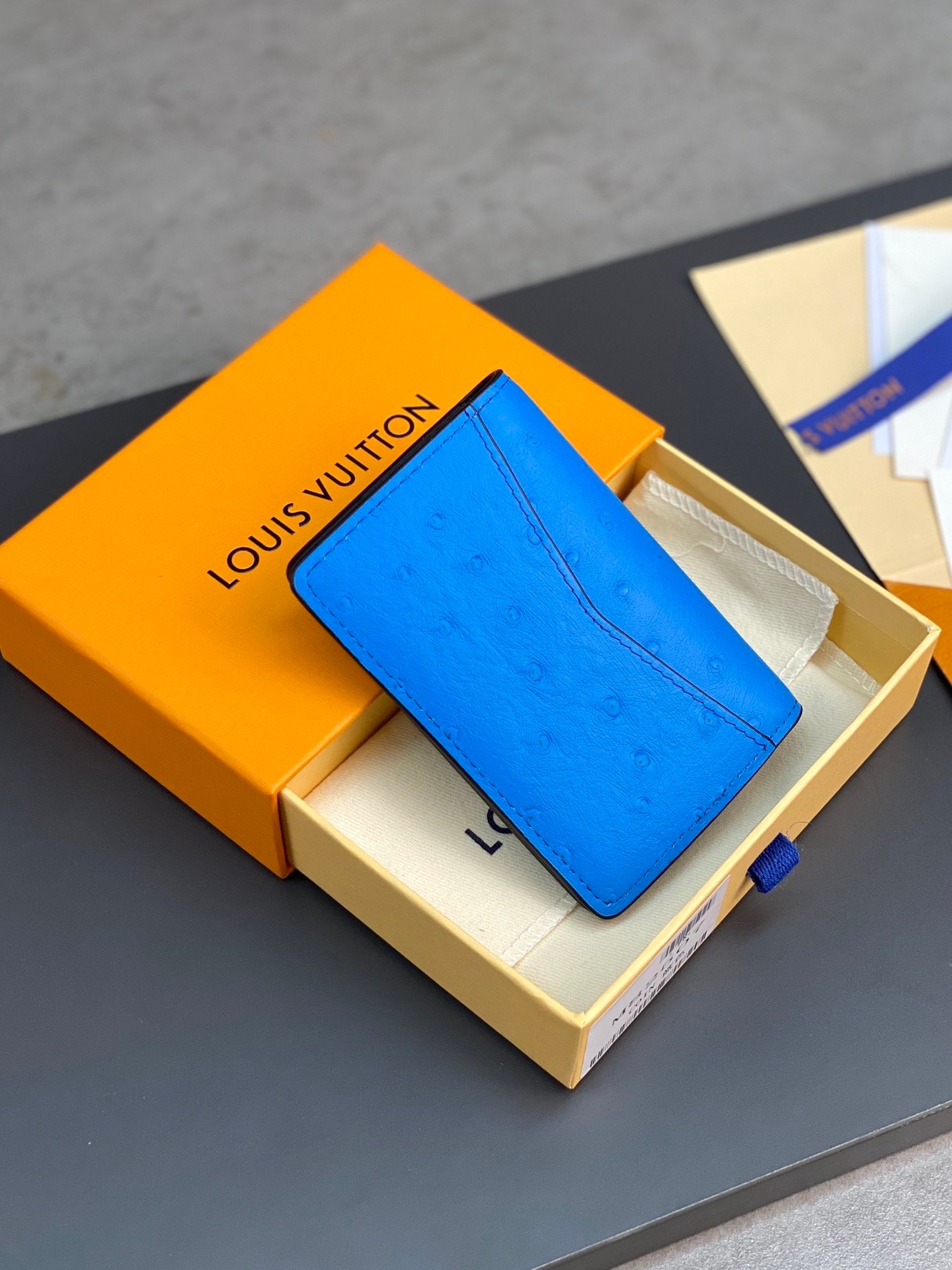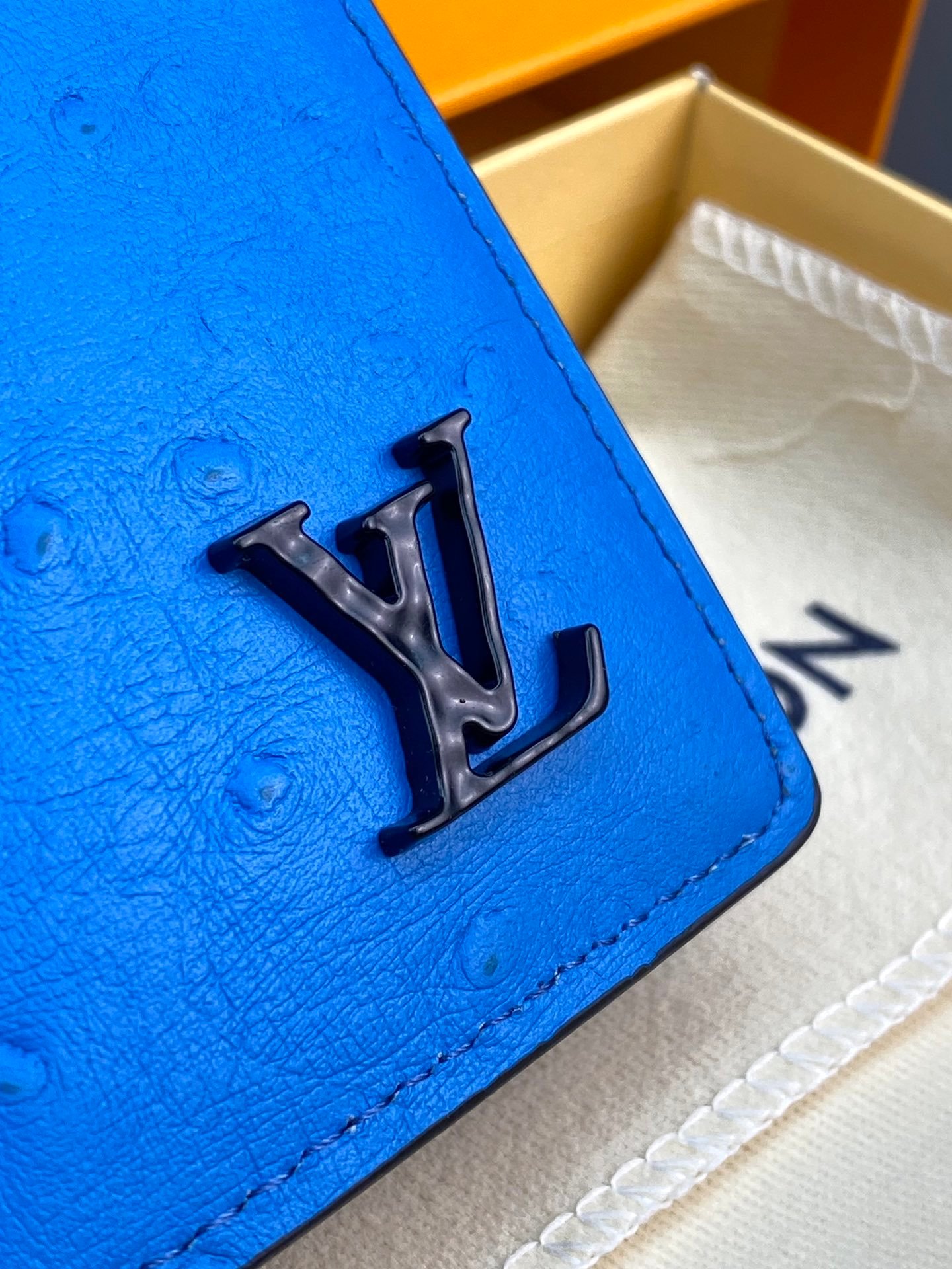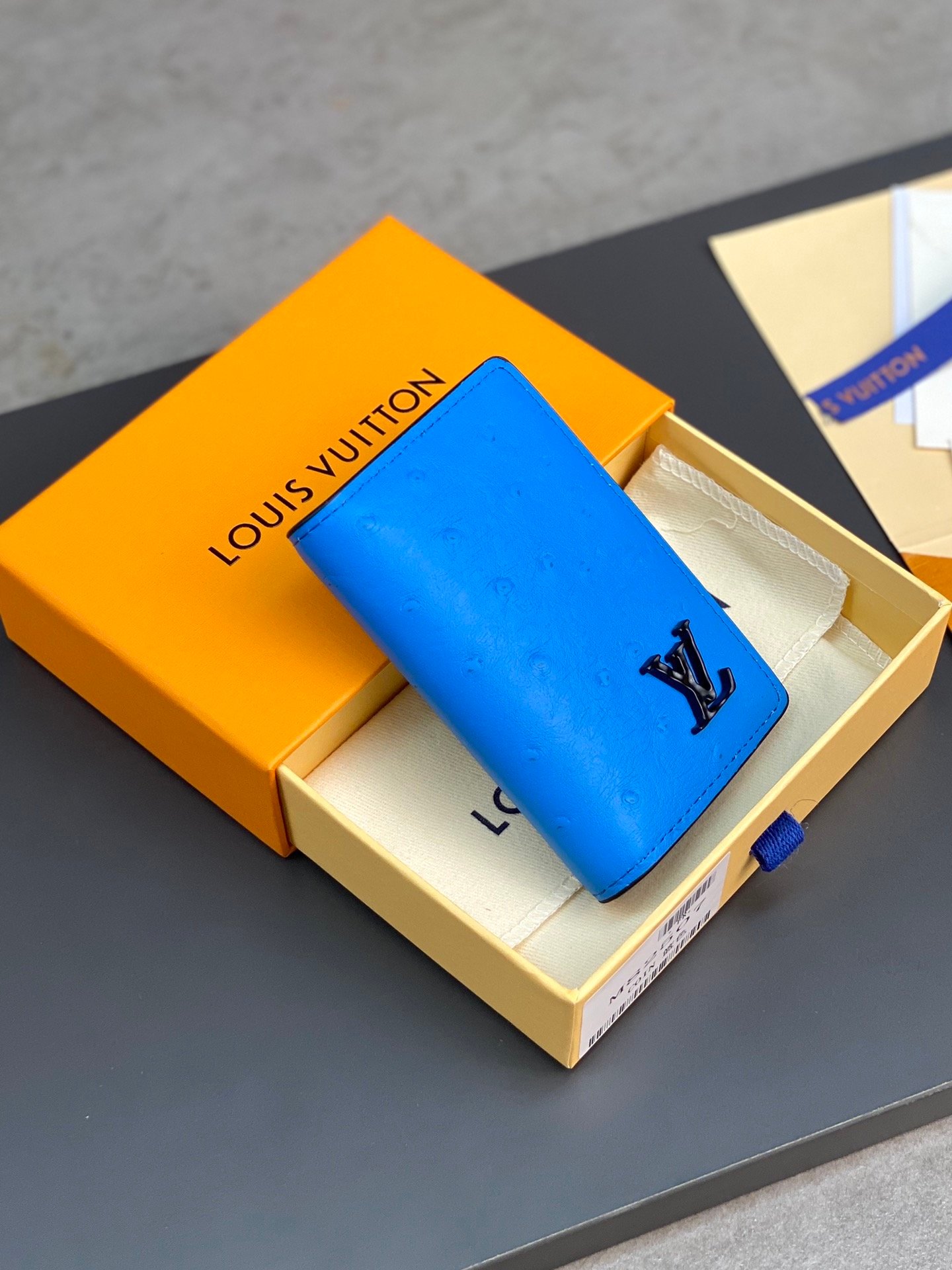 N82507 blue! Card Holder This card holder is made from rich ostrich leather, demonstrating Louis Vuitton’s profound knowledge in leather production. Vibrant colors inject high energy, and the card holder, compartments and zippered coin pocket are rich in functionality. 8 x 11 x 1 cm