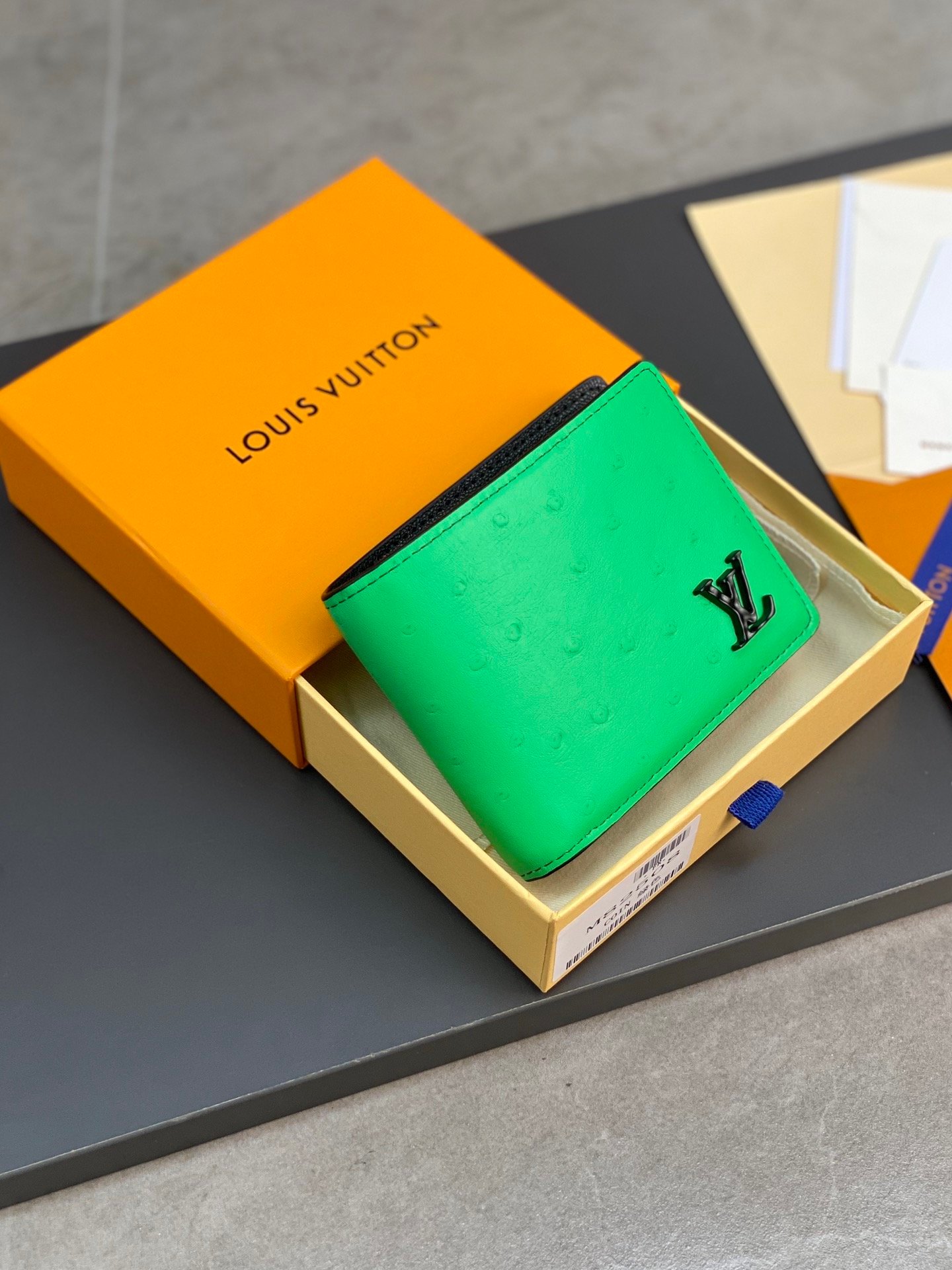 N82508 Green! Short clip This short clip is made from rich ostrich leather, reflecting Louis Vuitton’s profound knowledge in leather making. Vibrant colors inject high energy, and the card holder, compartments and zippered coin pocket are rich in functionality. 12 x 9 x 1 cm