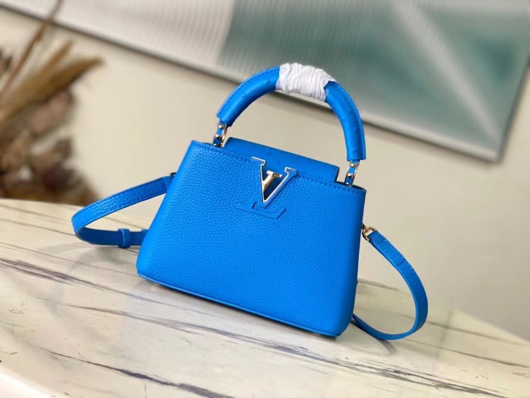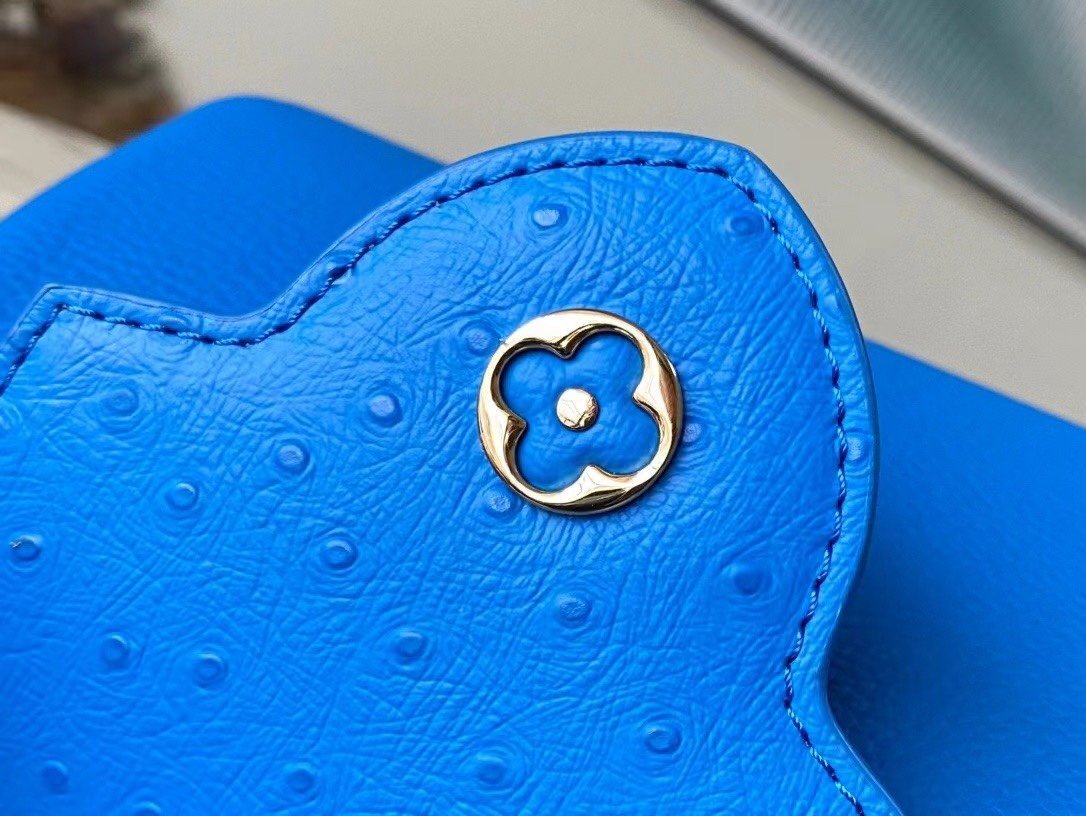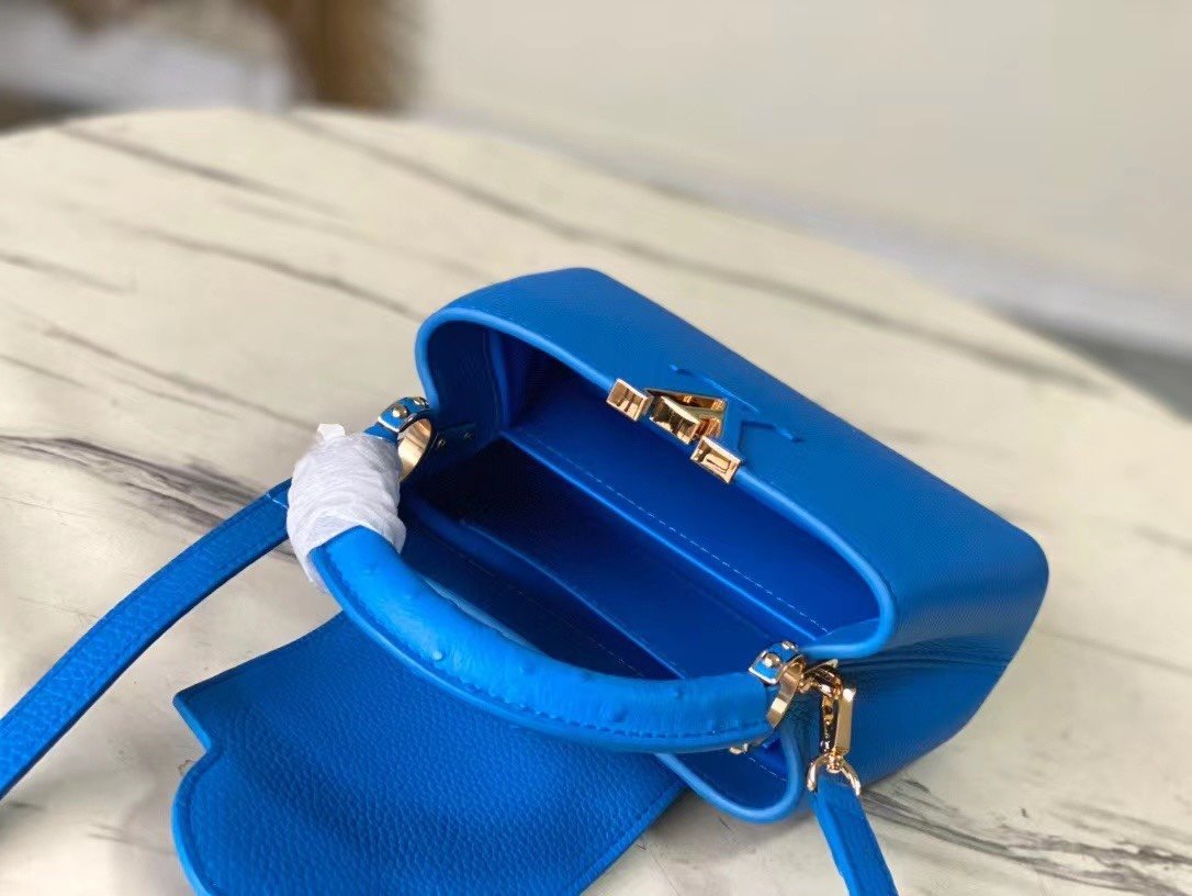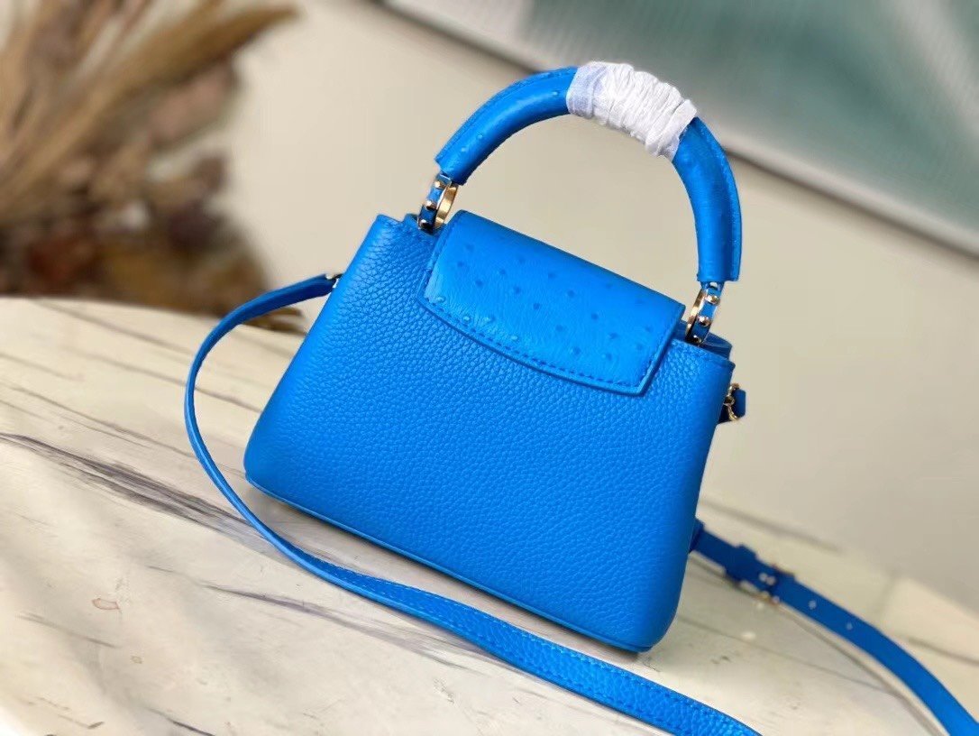 Special original order N82904/M48865 blue ostrich. This Capucines handbag is made of Taurillon leather and has an exquisite shape. The flap, handle and LV letters are wrapped in ostrich leather. The flap can be placed externally or internally to read the LV logo. The detachable wide leather shoulder strap is full of modernity. fashion. Size:21*14*8cm