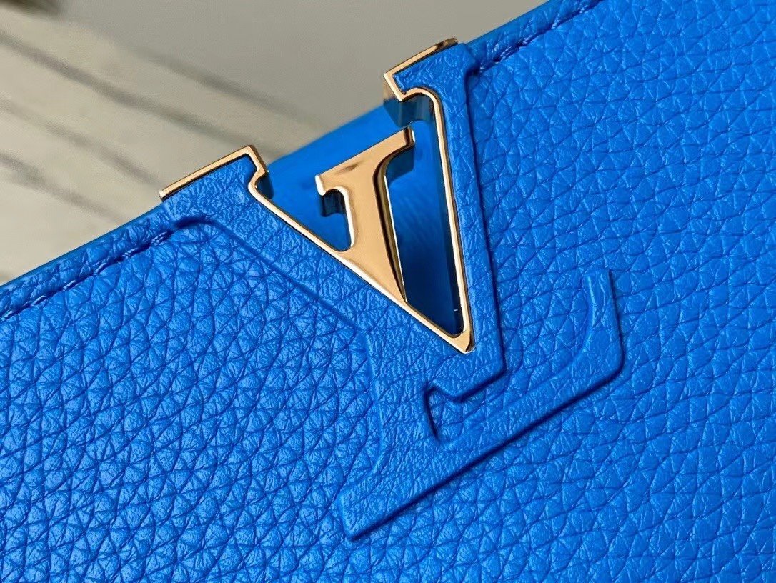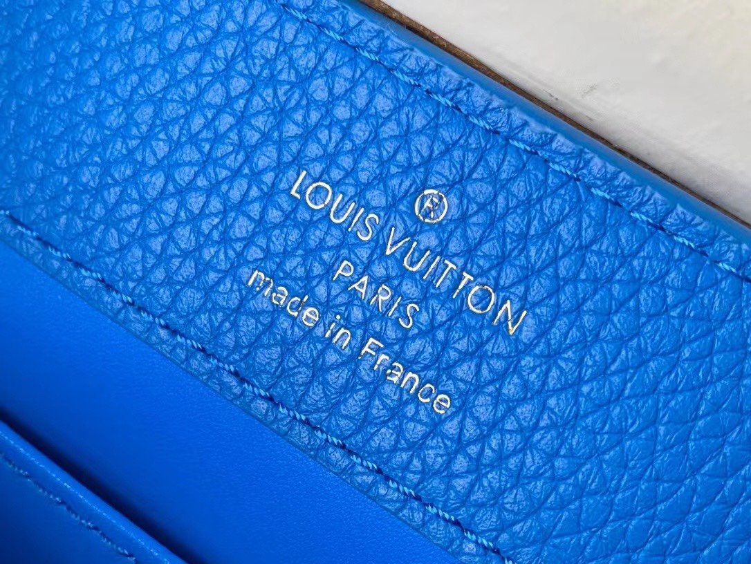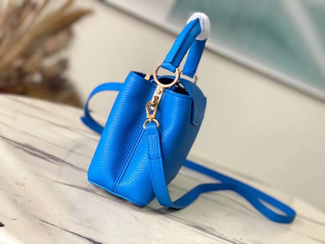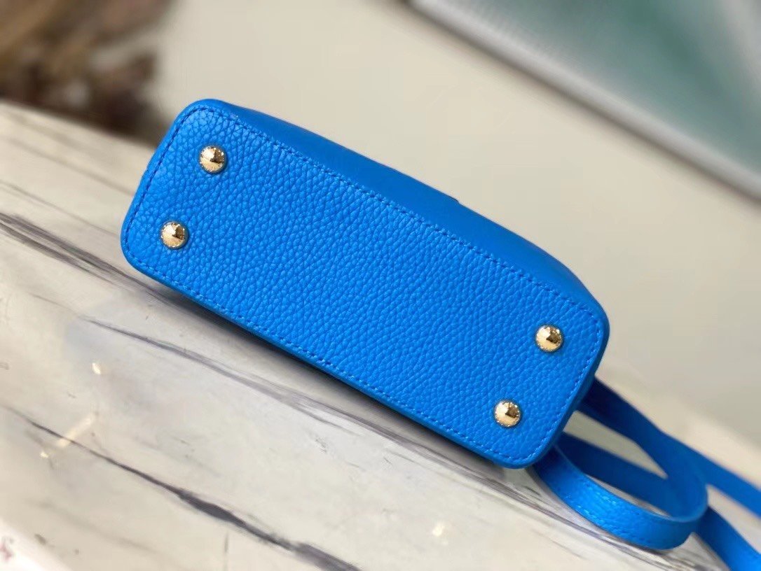 Special original order N82904/M48865 blue ostrich. This Capucines handbag is made of Taurillon leather and has an exquisite shape. The flap, handle and LV letters are wrapped in ostrich leather. The flap can be placed externally or internally to read the LV logo. The detachable wide leather shoulder strap is full of modernity. fashion. Size:21*14*8cm