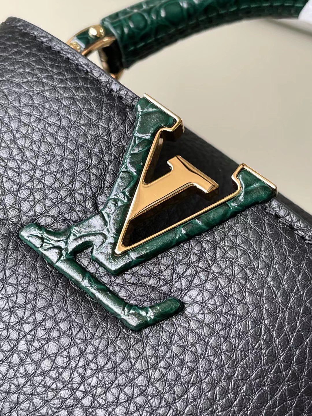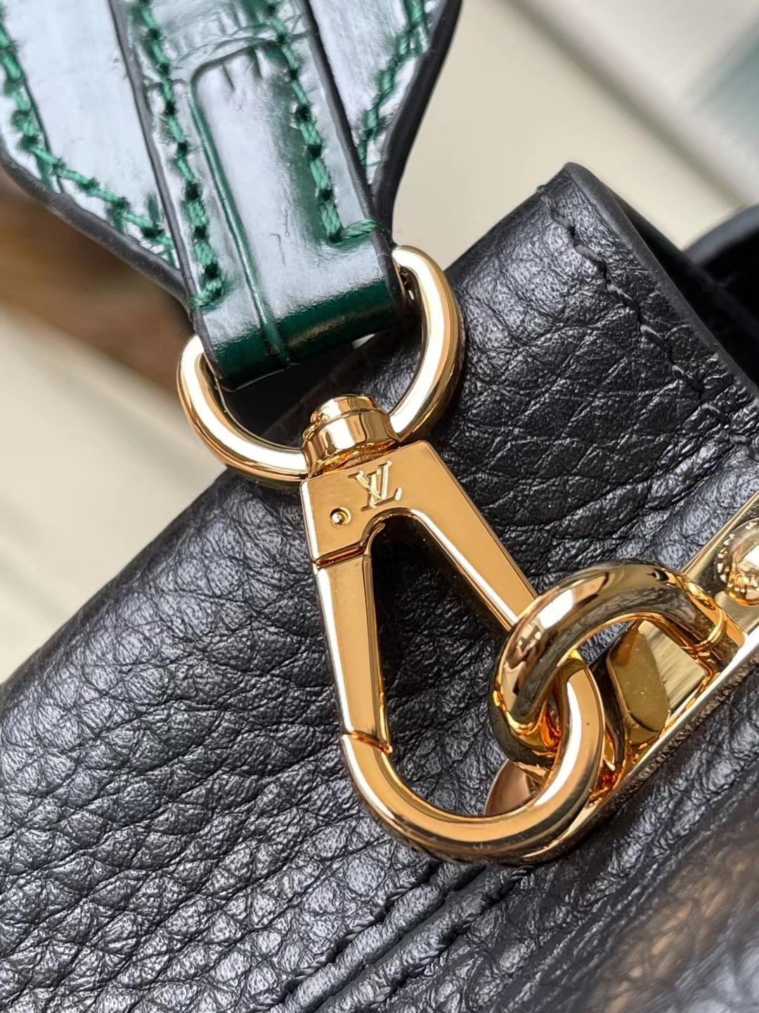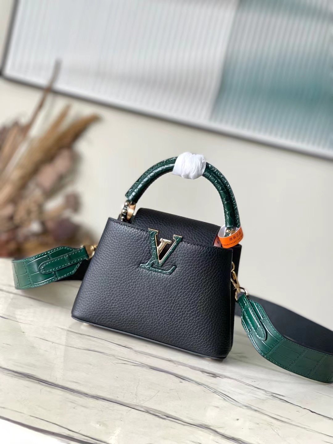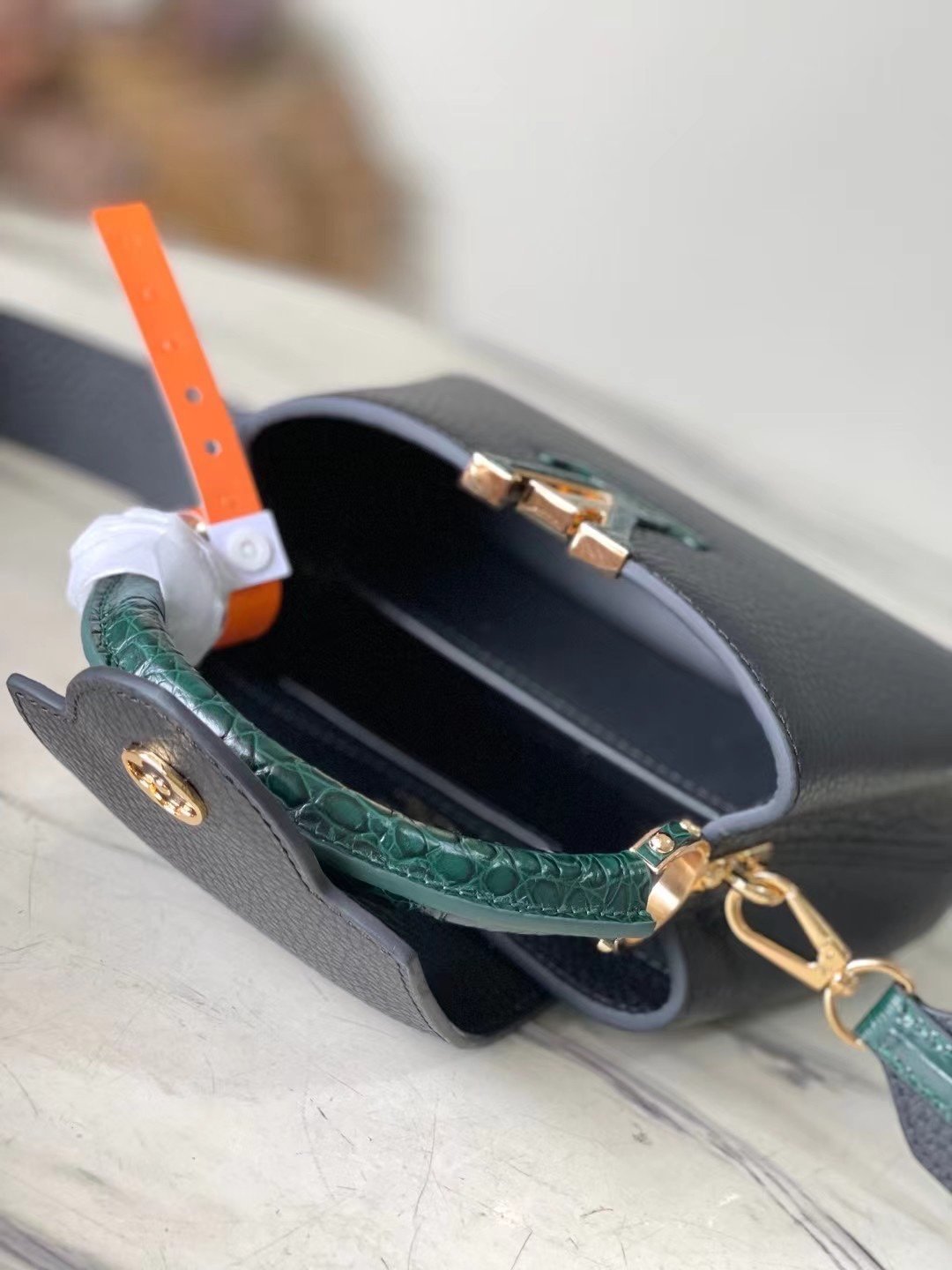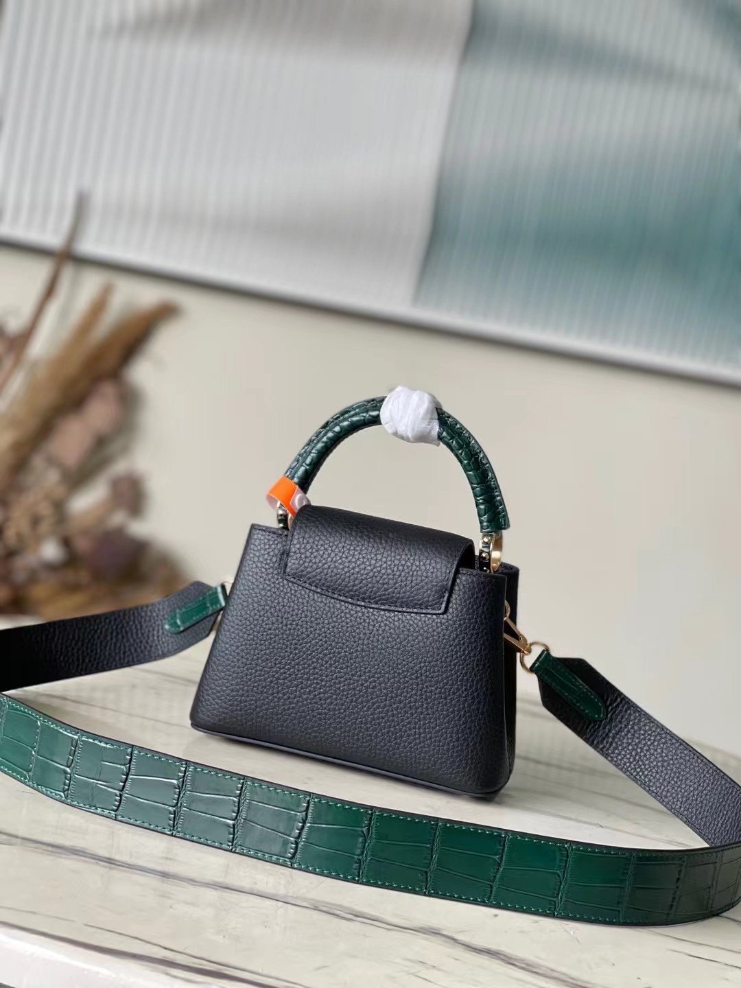 The Capucines mini bag is crafted from crocodile-effect leather for a luxurious feel. Lined with premium sheepskin leather and equipped with dazzling hardware. The chic Capucines flap can be stored inside the bag to reveal the brand’s logo, or flipped out to reveal the Monogram floral pattern. Its compact size makes this extraordinary bag perfect for evening events. Detailed features 21x14x8 cm (length x height x width)