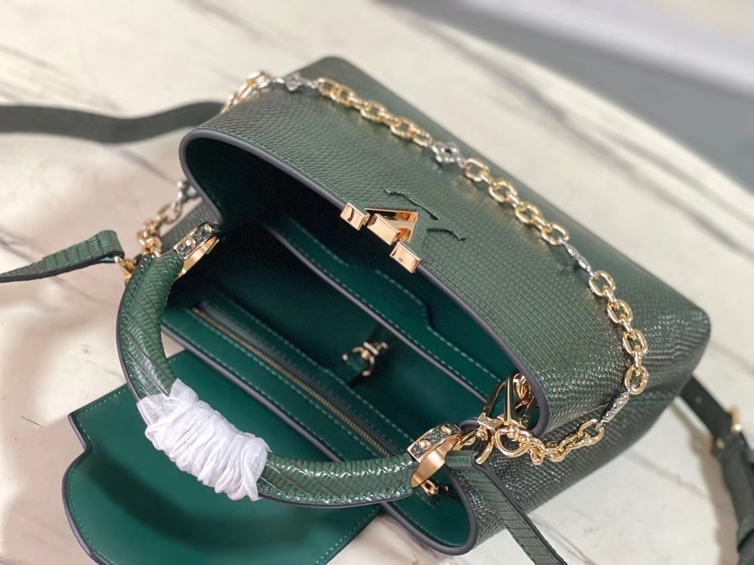 Top original order N98093/M48865 dark green lizard pattern chain terms CapucinesBB handbag exquisitely combines graceful lizard skin outer layer, delicate sheepskin lining and Yingze metal iconic flap to achieve two styles: read the LV logo on the inside and bloom Monogram flowers on the outside Light up an eye-catching corner for evening occasionsSize: 27 * 18 * 9 cm