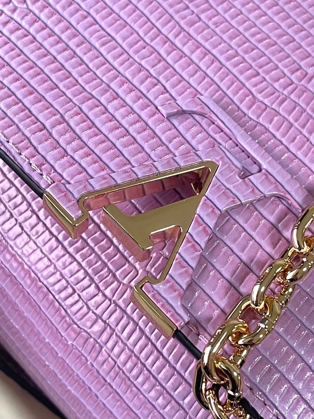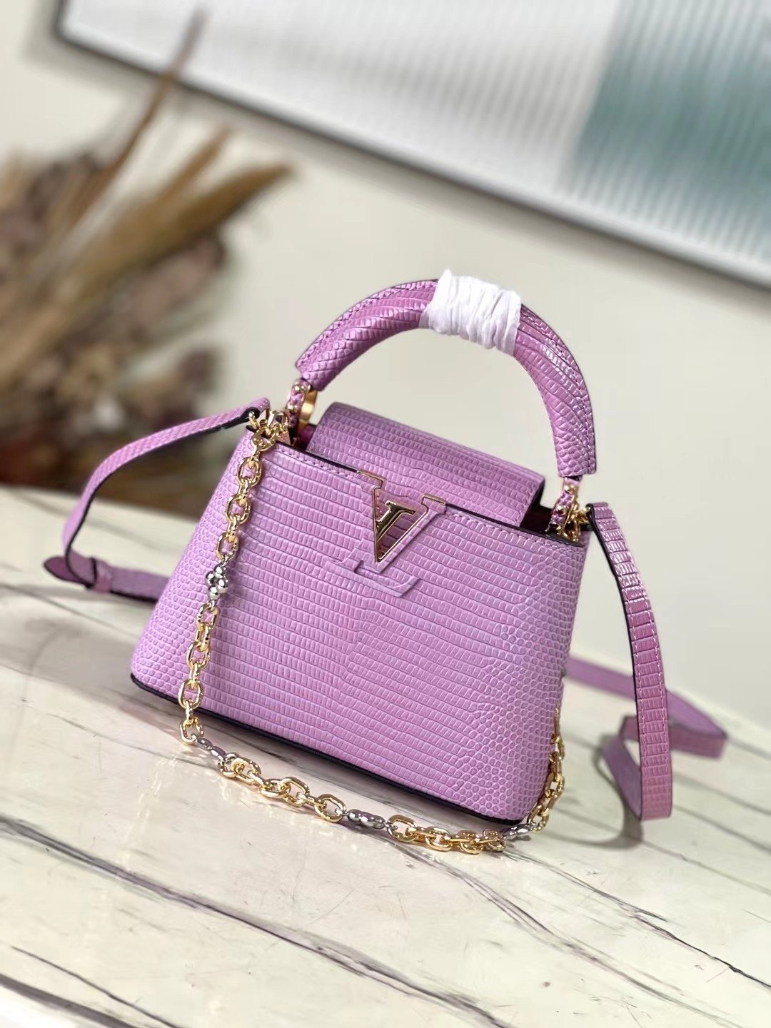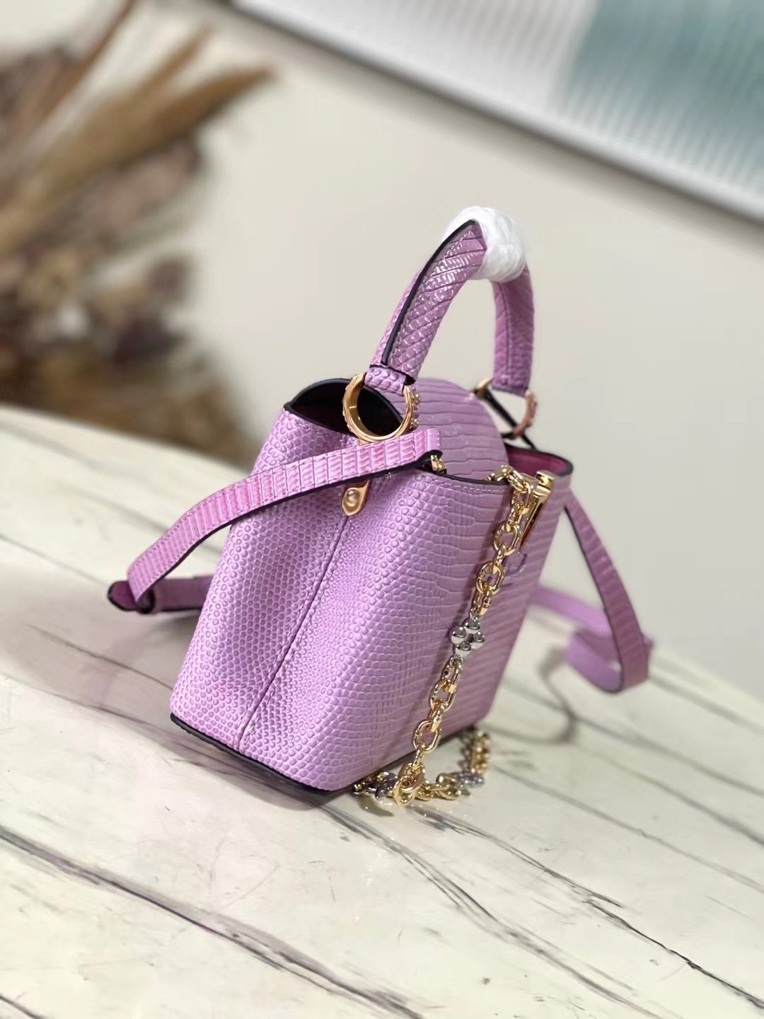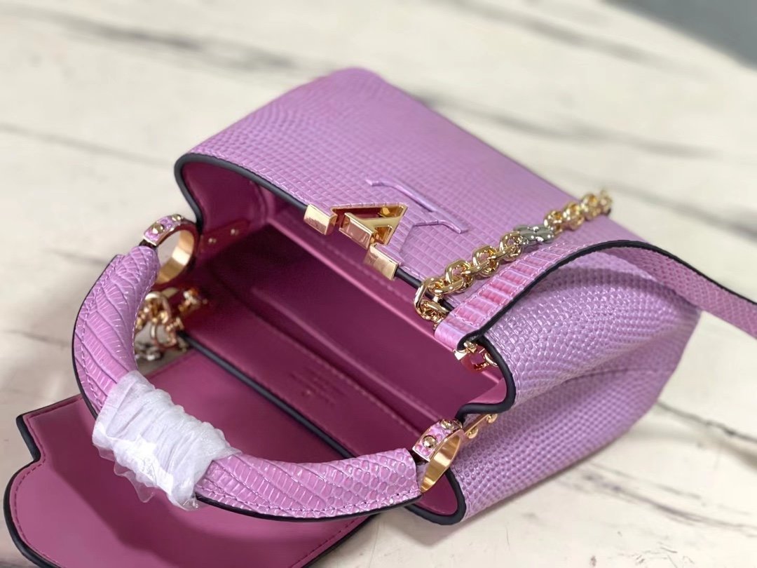 Top original order N98093/M48865 purple lizard pattern chain terms Capucines mini handbag exquisitely combines graceful lizard skin outer layer, delicate sheepskin lining and Yingze metal iconic flap to achieve two styles: the LV logo is read inside and the Monogram flower blooms on the outside Light up an eye-catching corner for evening occasionsSize: 21 * 14 * 8 cm
