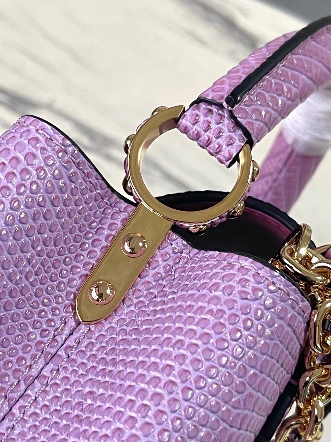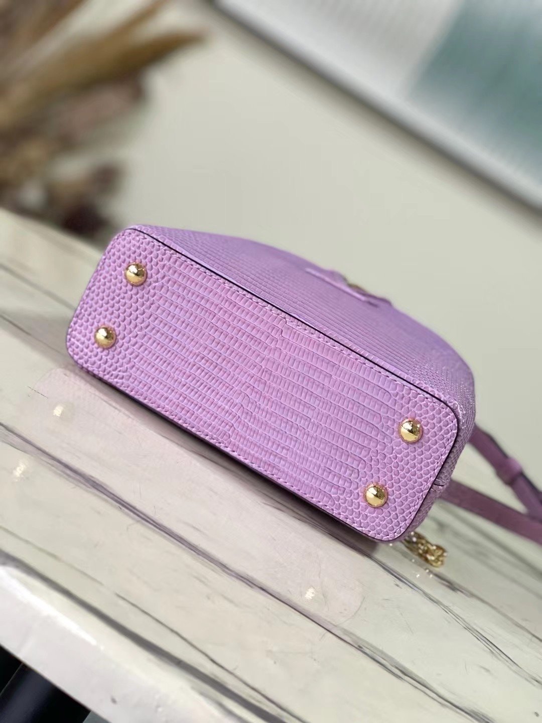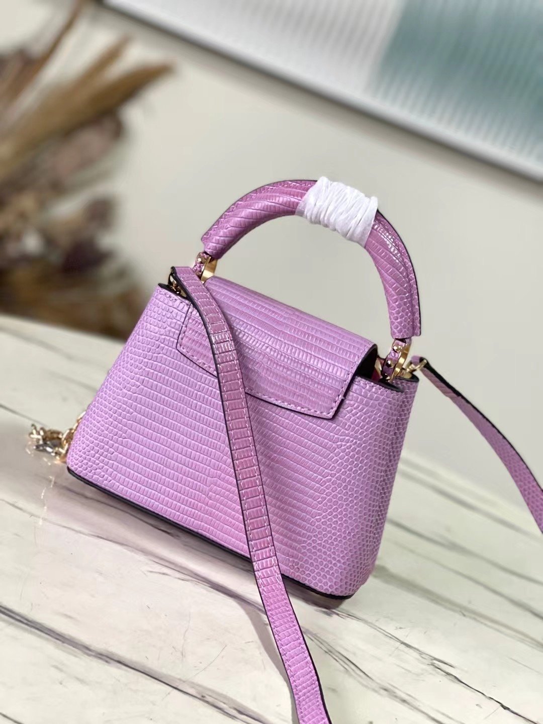 Top original order N98093/M48865 purple lizard pattern chain terms Capucines mini handbag exquisitely combines graceful lizard skin outer layer, delicate sheepskin lining and Yingze metal iconic flap to achieve two styles: the LV logo is read inside and the Monogram flower blooms on the outside Light up an eye-catching corner for evening occasionsSize: 21 * 14 * 8 cm