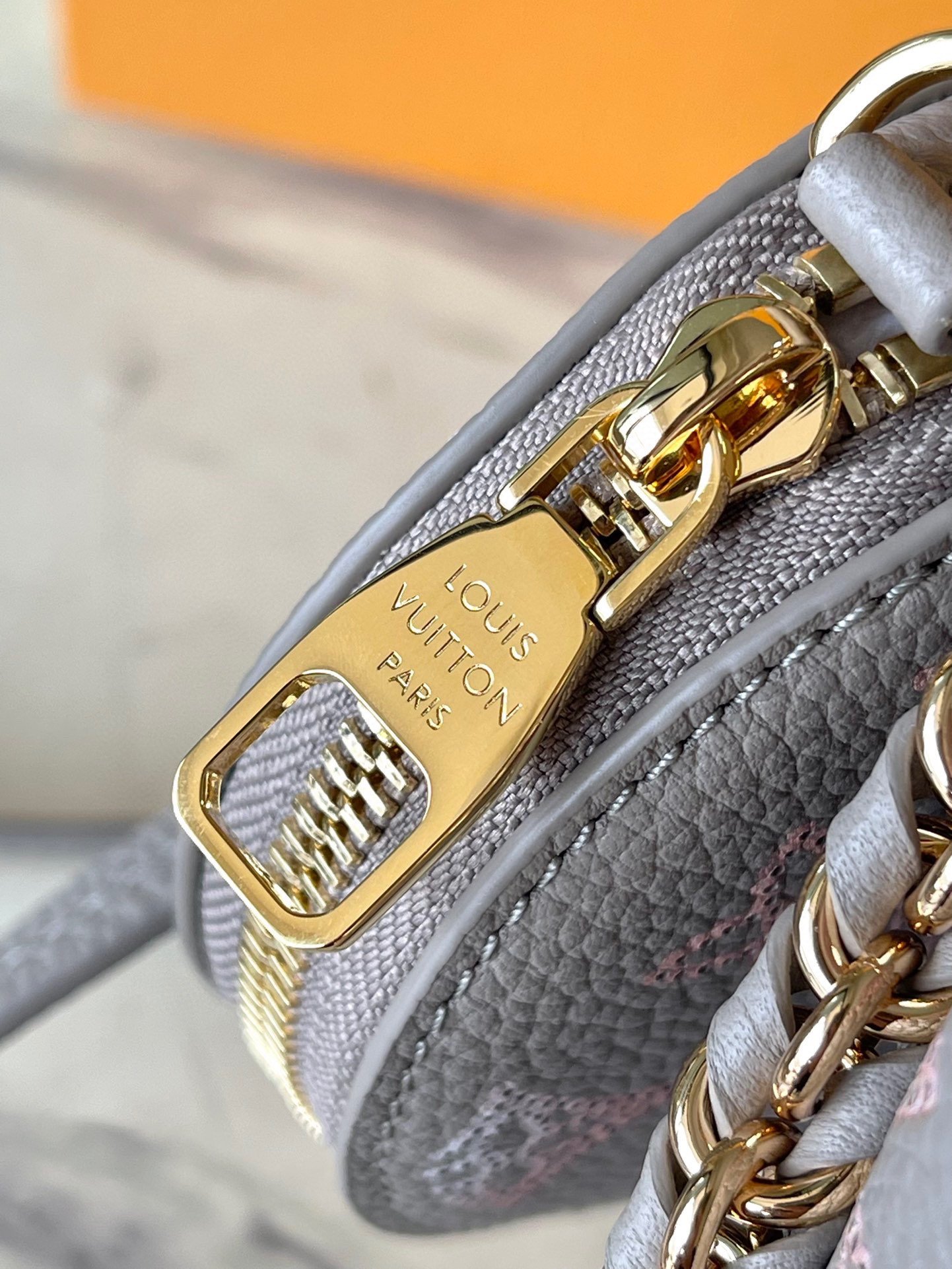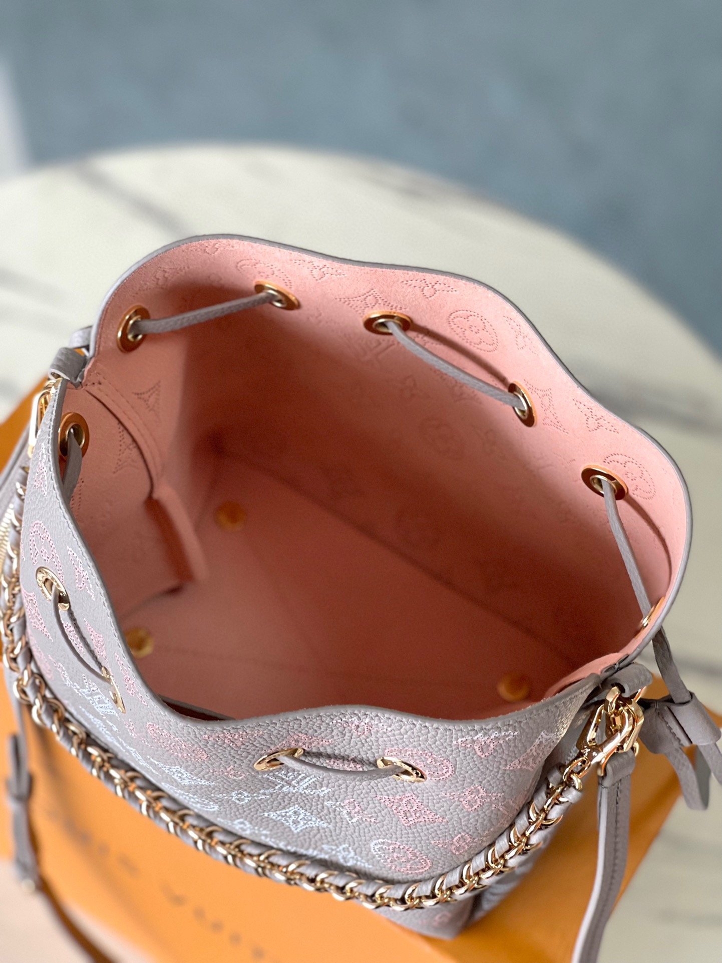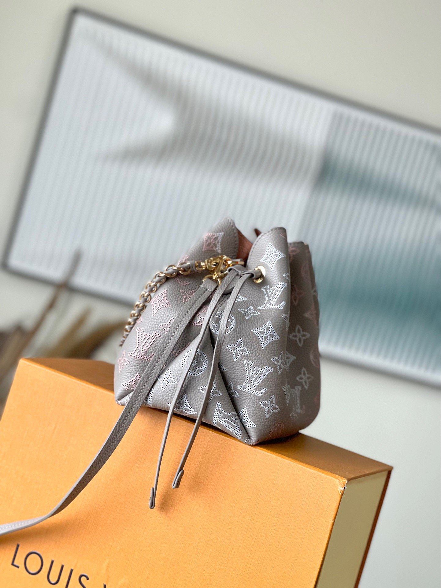 Original M23388 Bella bucket bag is made of engraved cow leather to create a drapey structure. The subtle color gradient and light-colored chain on the perforated Monogram pattern convey a subtle beauty. Use the leather chain handle or the detachable and adjustable leather shoulder strap to switch between shoulder and shoulder styles. Size: 19*22*14cm