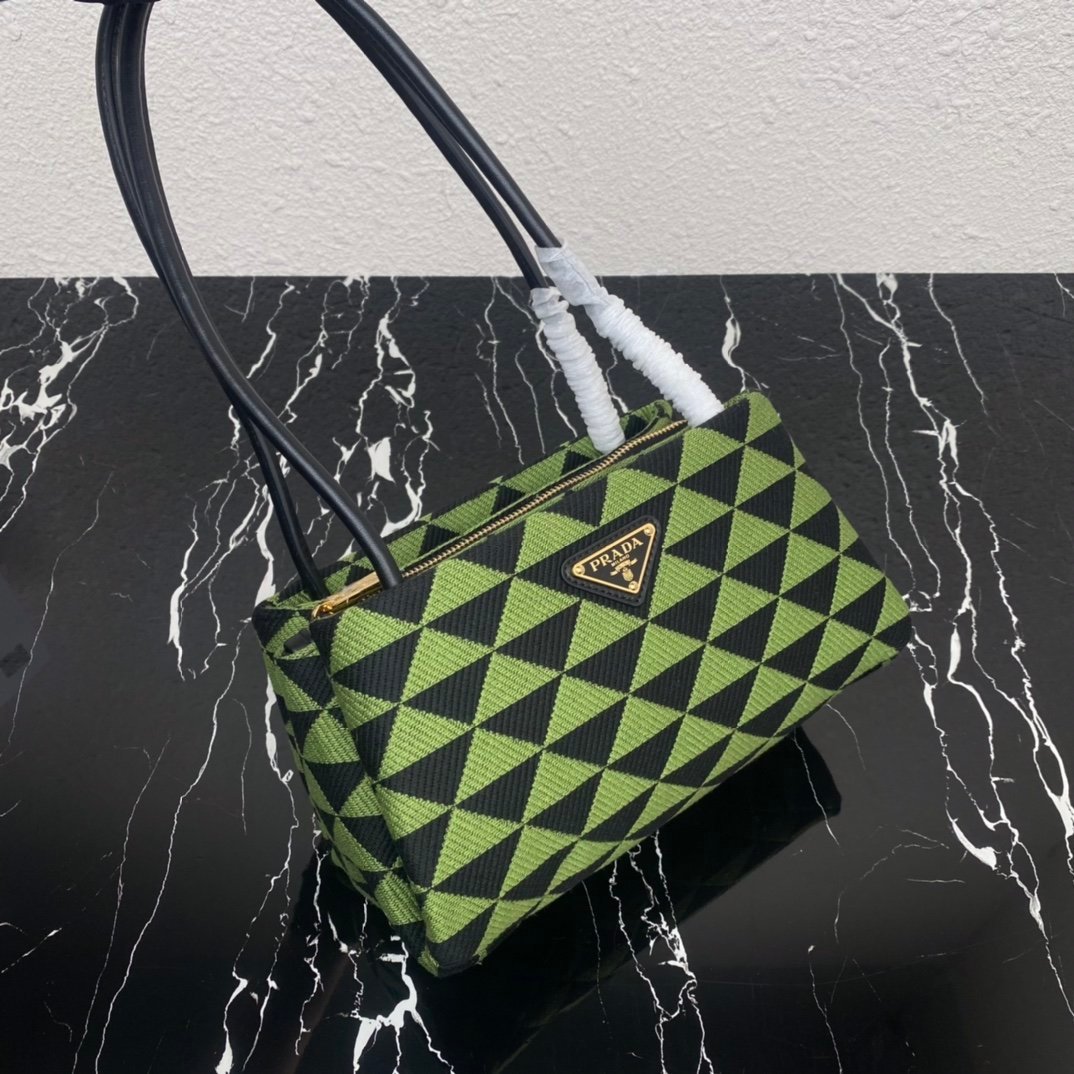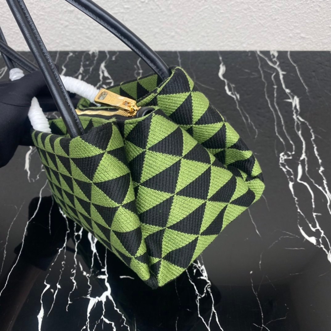 Silhouette of this embroidered fabric tote. Slim leather handles complement the elegant silhouette. The triangles of embroidered fabric are transformed into a gorgeous and modern multi-faceted jacquard pattern, and are lined with imported sheepskin. There are many layers, simple and elegant. Dimensions: length 25x height 13.5x bottom 13cm