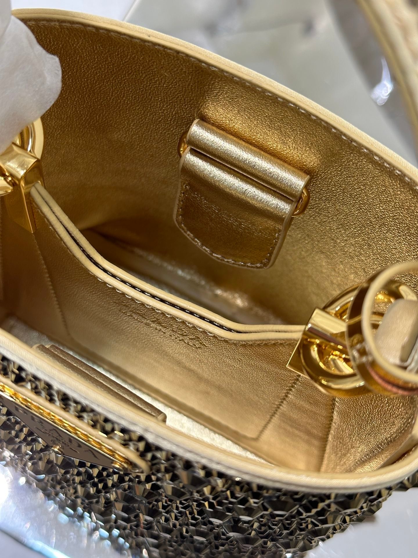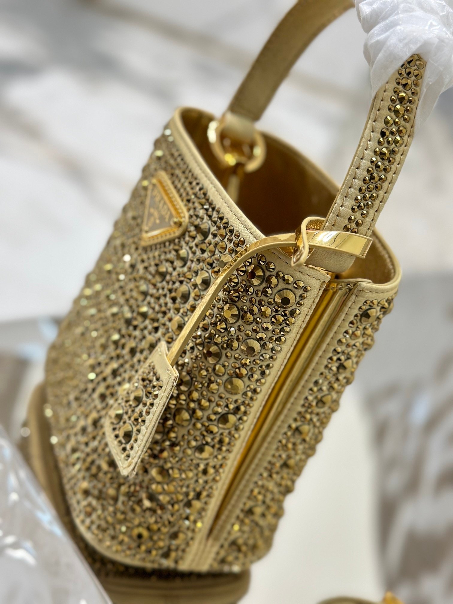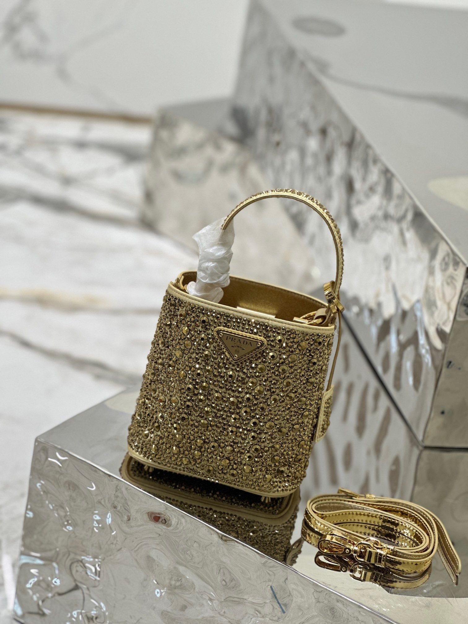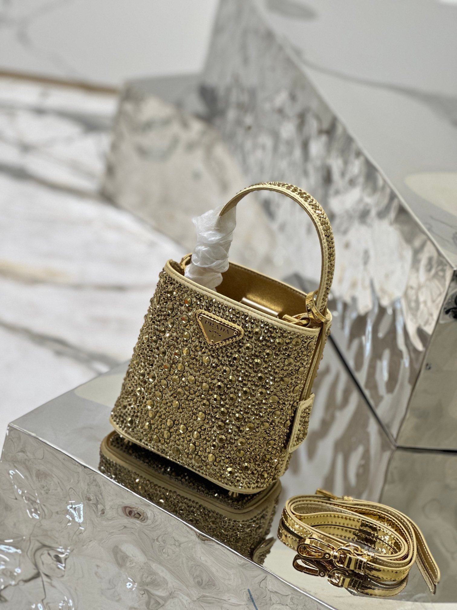 This elegant Panier handbag is covered in imitation crystals and sparkles like a jewel. The detachable shoulder strap makes it easy to change your look, and the metal logo-embellished name tag adds a touch of personality.