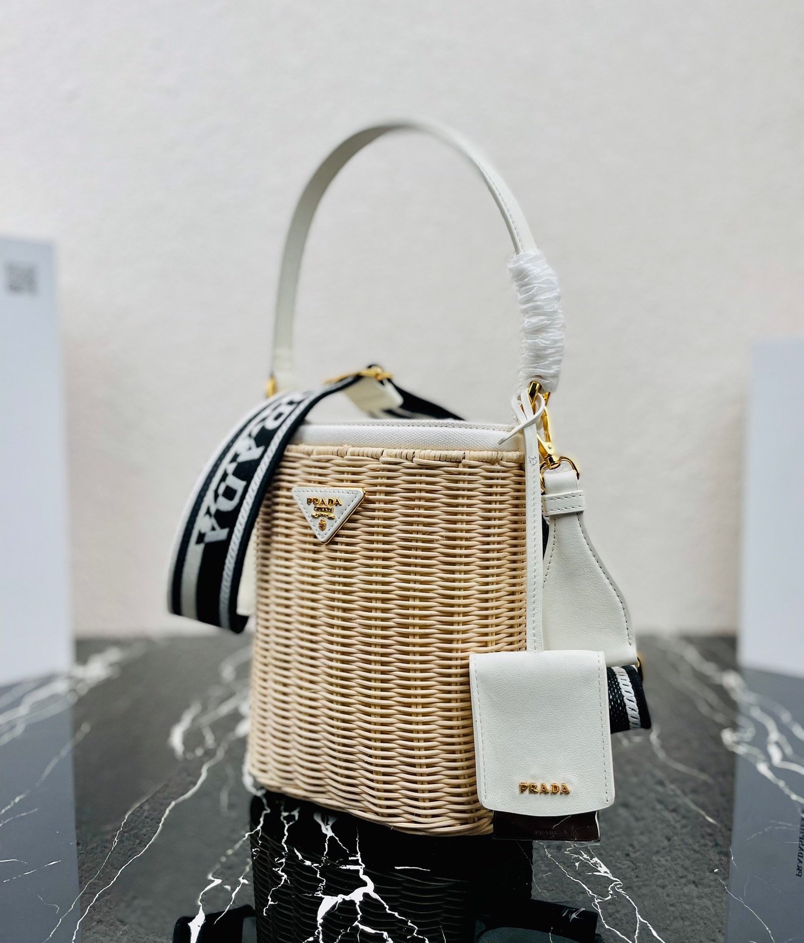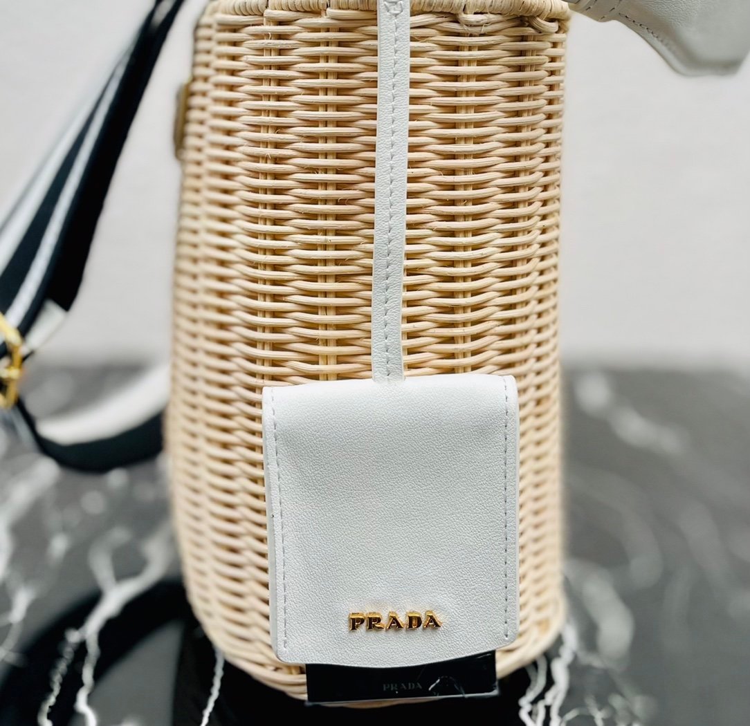 [Top original order] ✨New product debut✨ 2022 summer latest model 1BE062 wicker and canvas bucket bag???????? This shoulder bag is made of wicker and canvas, and the mixed materials give the new season Prada accessories unique characteristics. Feminine silhouettes and sophisticated details accentuate the design. Equipped with an adjustable embroidered webbing shoulder strap decorated with a contrasting logo, a 95cm detachable logo-printed embroidered webbing shoulder strap, and a detachable leather cosmetic mirror case, the diverse functionality and eye-catching style are at a glance, filled with summer style????️Size: Length 18cm *Height 19cm*Width 11cm