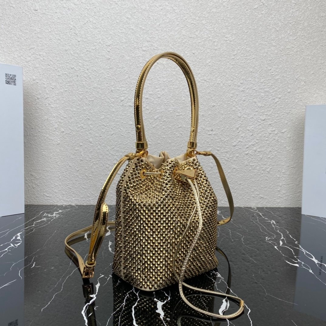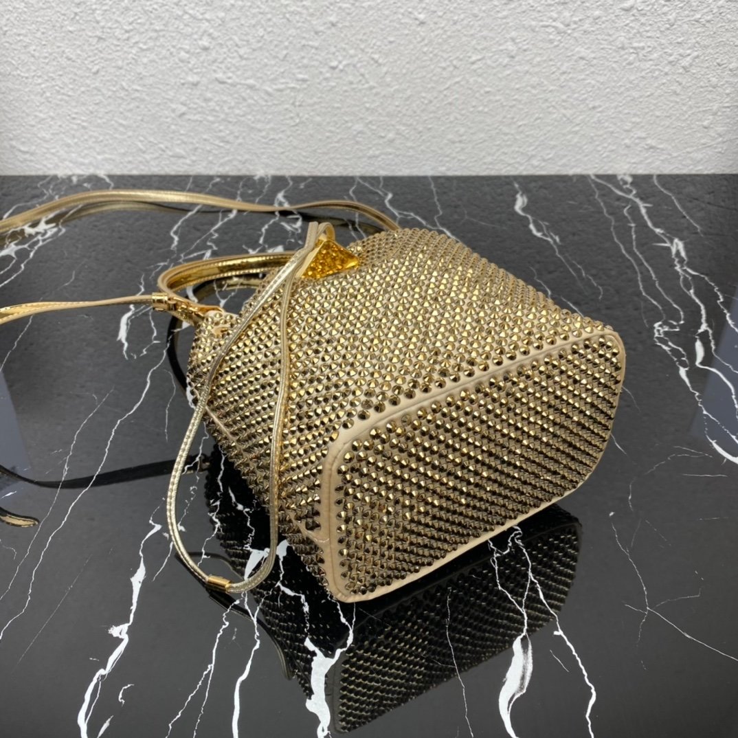 [Top original order] 2023 new crystal bucket bag 1BE067????????This crystal bucket is made of a combination of imported imitation crystal and satin materials, with an opening and closing design decorated with an enamel-coated metal triangle logo. The short shoulder strap is adjustable in length, and the long shoulder strap is detachable and adjustable. So cute????, the effect of bling bling is very eye-catching, and the space is large, which is heart-warming????????Dimensions: length 16cm*height 21cm*width 10cm