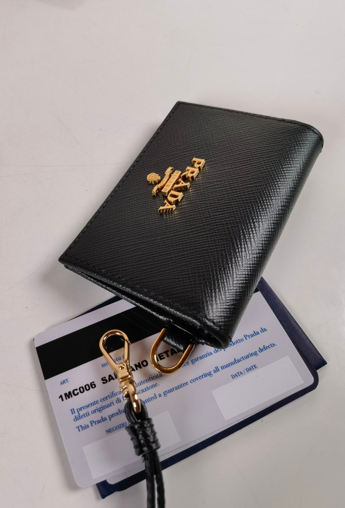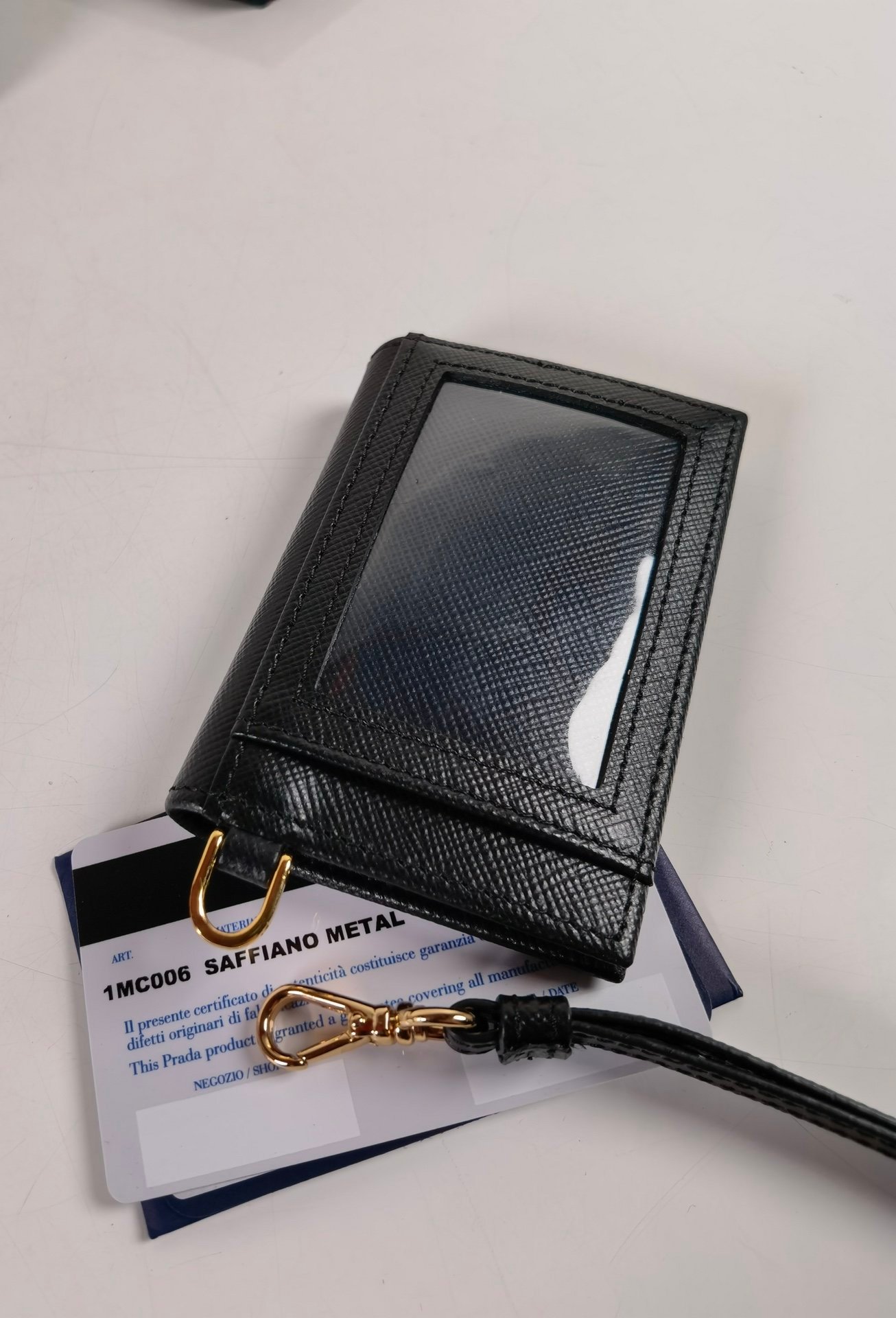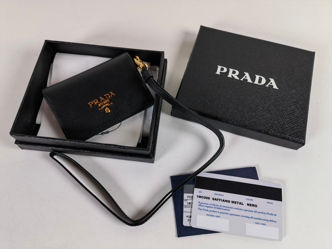 P Home→Hangneck leather document holder, model 1MC006, made of cross-grain cowhide, size 9.7×7cm, snap-type sealing design, two pockets for storing cards or receipts, a rare work card on the market, the back is Transparent mirror window, detachable sling, carrying bags is too troublesome. With it, important cards can be hung on your chest, and you no longer have to worry about not being able to find them [strong]