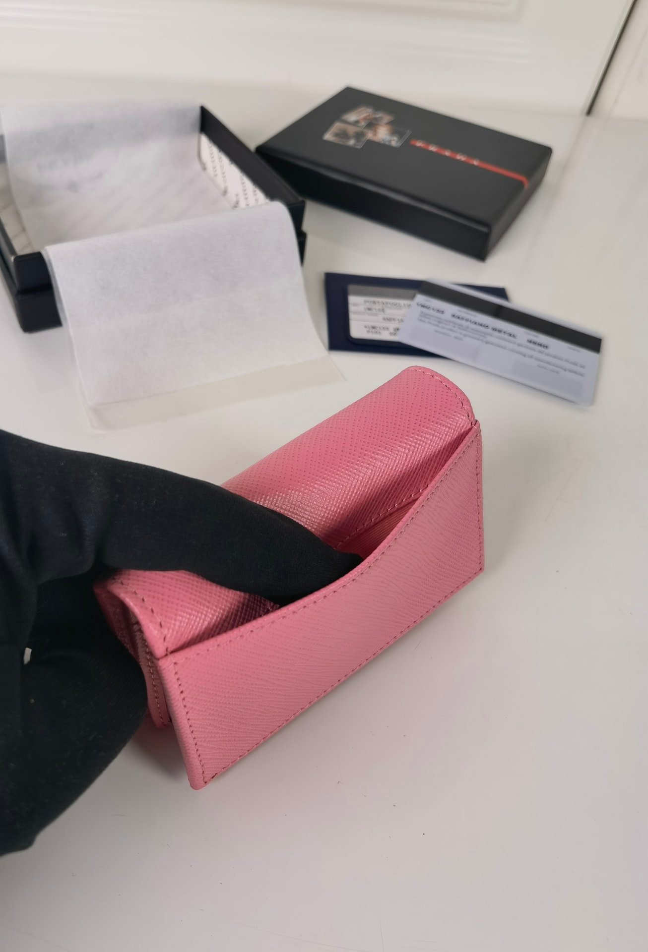 Prada. Classic card holder, model 1MC122, made of cross-grain cowhide, size 6.5×2.5×11cm, adopts snap button opening and closing design, and has two slots for cards or tickets. This exquisite card holder is small and convenient, with sufficient capacity and easy to place. It is easy to store in your bag, and can also be used as a separate item when going out every day. It is a hot seller????