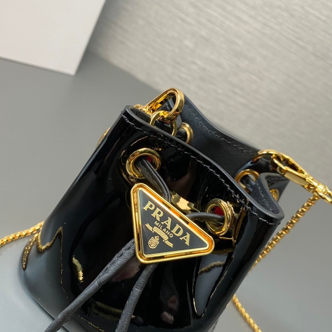 [Top original order] Patent leather bucket????1NR016 calfskin????????This patent leather bucket is made of imported glossy cowhide and enamel-coated metal triangle logo decorated opening and closing design. Metal iron can be spanned diagonally. So beautiful and cute????????Dimensions: length 9.5x height 9x bottom 6cm