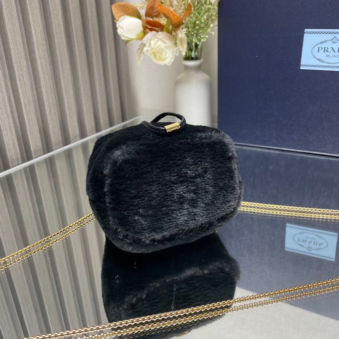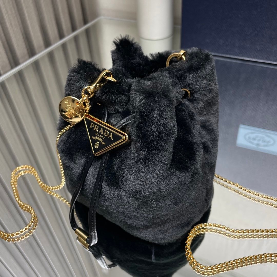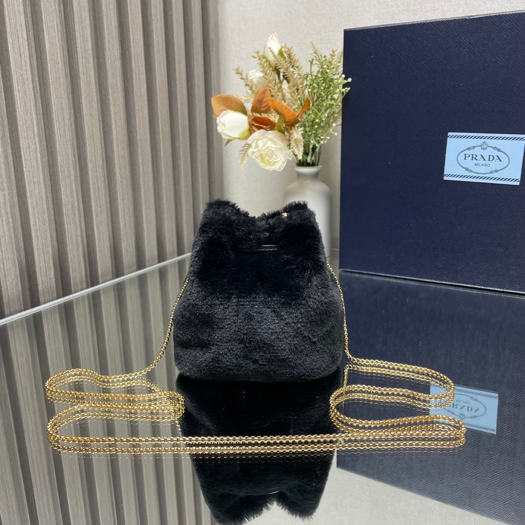 [Top original order] Mini mini bucket bag????1NR016????This small bag is equipped with soft shearling, showing modern elegance and full of winter charm. It has a chain shoulder strap and a drawstring top decorated with an enameled metal triangle logo. The upper body effect is fashionable and cute, size: length 9x height 9.5x bottom 6cm