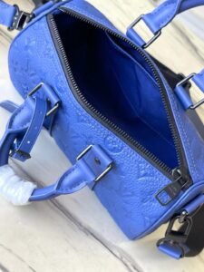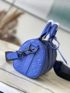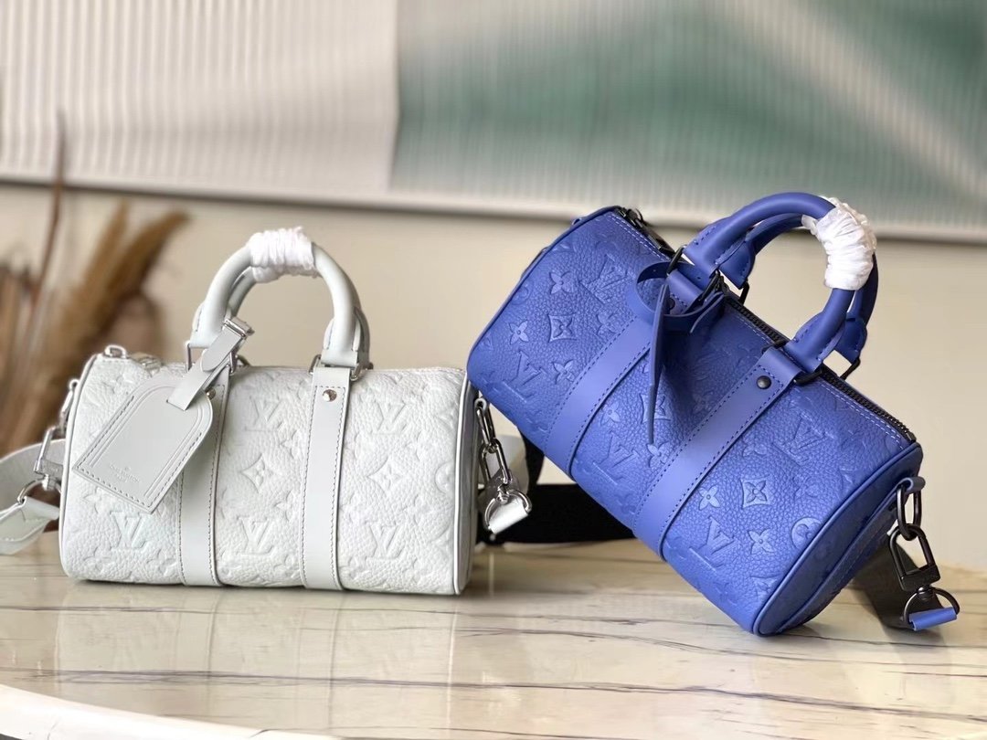 Top original order M23129 Blue M20900 This Keepall Bandoulière 25 handbag is made of Monogram embossed grain Taurillon leather to create an urban travel design. Leather side straps and leather top handles are signature elements of the Keepall collection, while wide textile shoulder straps in the signature texture can be removed or adjusted at will. Detailed features25 x 15 x 11 cm (length x height x width)